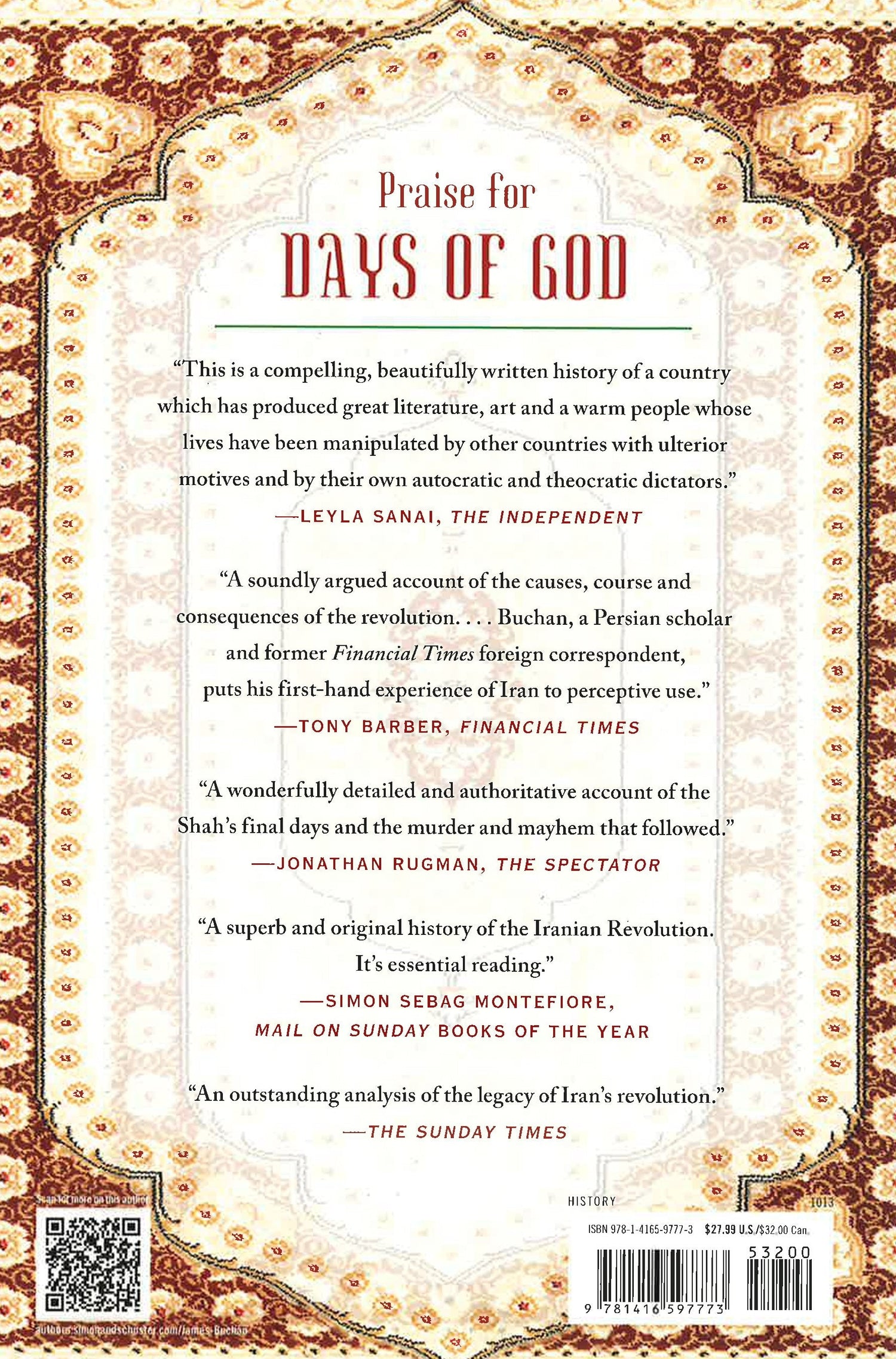 The 1979 Islamic revolution in Iran was one of the seminal events of our time. It inaugurated more than thirty years of war in the Middle East and fostered an Islamic radicalism that shapes foreign policy in the United States and Europe to this day. Drawing on his lifetime of engagement with Iran, James Buchan explains the history that gave rise to the Revolution, in which Ayatollah Khomeini and his supporters displaced the Shah with little difficulty. Mystifyingly to outsiders, the people of Iran turned their backs on a successful Westernized government for an amateurish religious regime. Buchan dispels myths about the Iranian Revolution and instead assesses the historical forces to which it responded. He puts the extremism of the Islamic regime in perspective: a truly radical revolution, it can be compared to the French or Russian Revolutions. Using recently declassified diplomatic papers and Persian-language news reports, diaries, memoirs, interviews, and theological tracts, Buchan illuminates both Khomeini and the Shah. His writing is always clear, dispassionate, and informative. The Iranian Revolution was a turning point in modern history, and James Buchan's Days of God is, as London's Independent put it, "a compelling, beautifully written history" of that event.