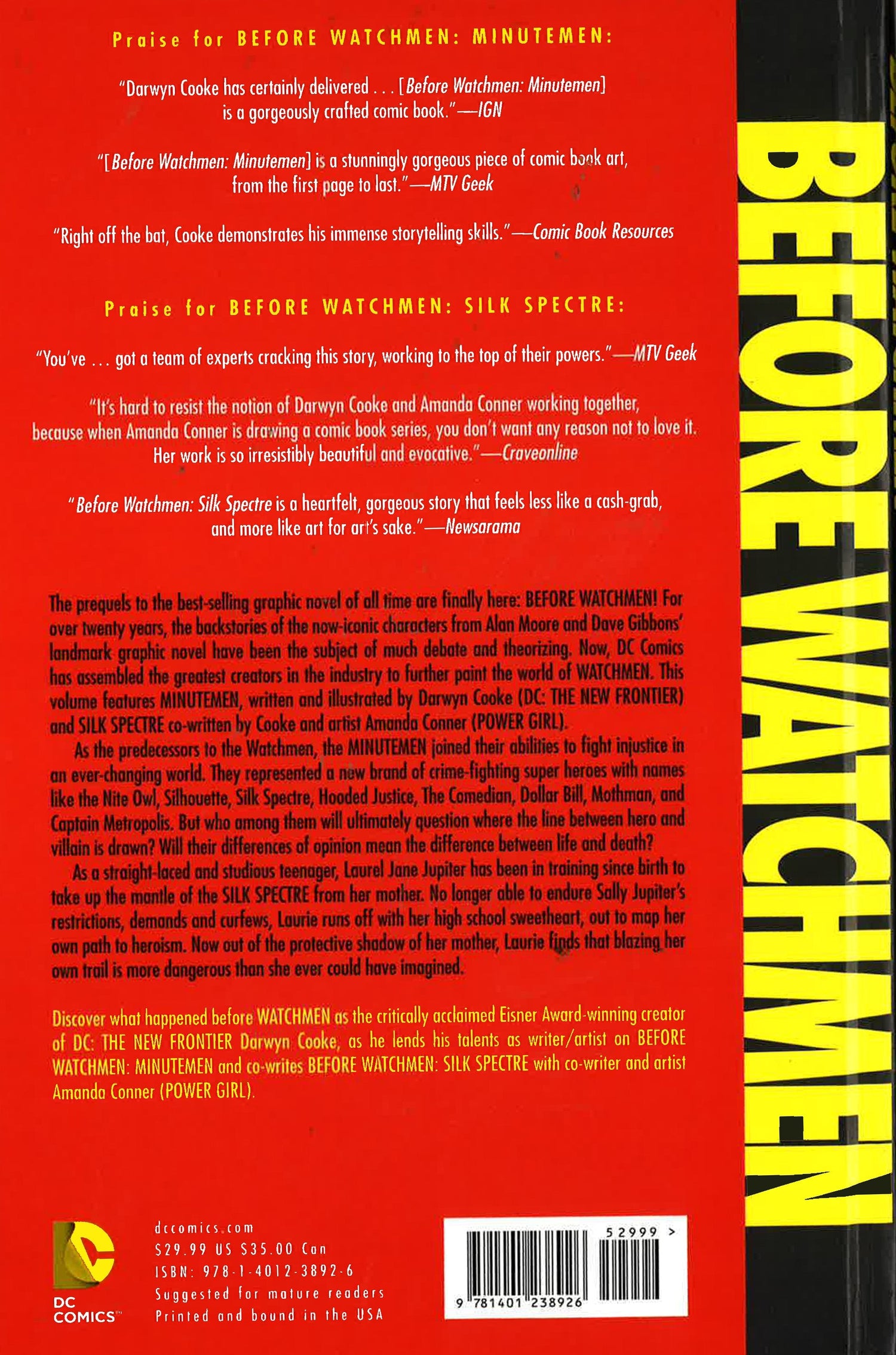 The controversial, long-awaited prequels to the best-selling graphic novel of all-time are finally here: BEFORE WATCHMEN! For over twenty years, the back stories of the now iconic characters from Alan Moore and Dave Gibbon's landmark graphic novel have remained a mystery - until now! Now, DC Comics has assembled the greatest creators in the industry to further paint the world of Watchmen, starting with this first volume starring the Minutemen and Silk Spectre!The critically acclaimed and Eisner Award-winning creator of DC: The New Frontier, Darwyn Cooke, lends his talents to the Minutemen. As the predecessor to Watchmen, the Minutemen were assembled to fight against a world that have more and more rapidly begun to spin out of control. Can these heroes from completely different backgrounds and with completely different attitudes on crime come together? Or will they fall apart before they begin? Laurie Juspeczyk struggles with her overbearing superhero mother and her scattered path toward taking the mantle of the Silk Spectre. With gorgeous art by co-writer and illustrator Amanda Conner (Power Girl, The Pro), Silk Spectre takes a very different perspective at the world of Before Watchmen.
