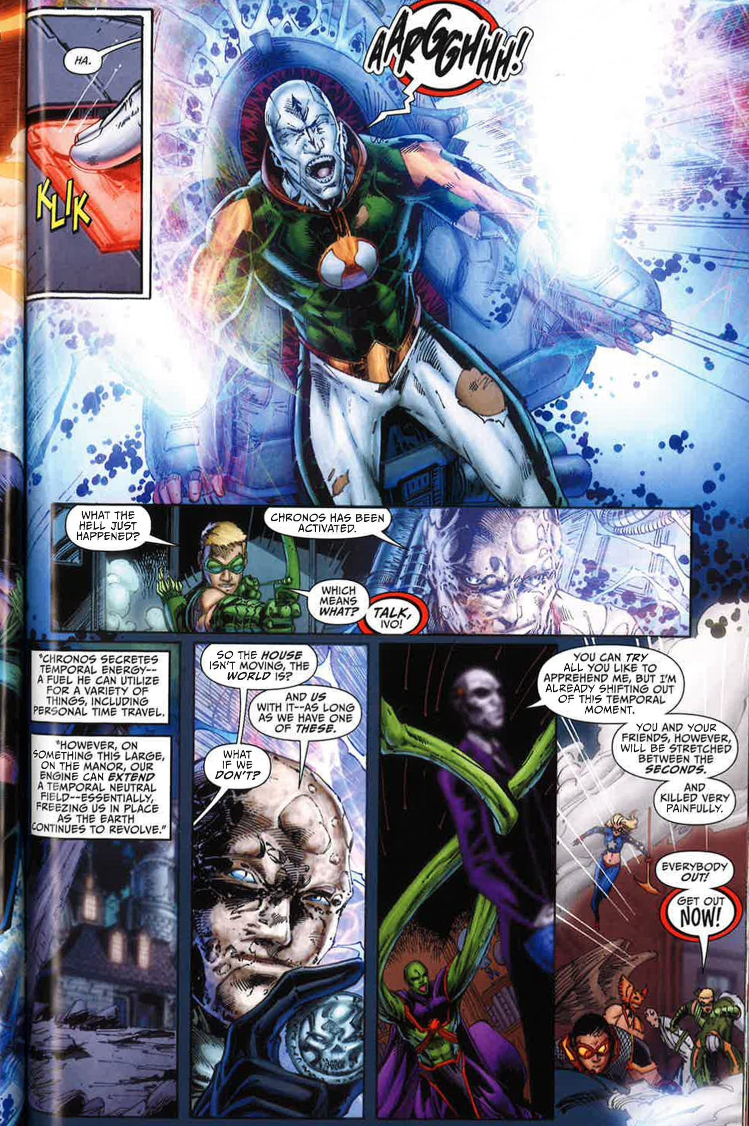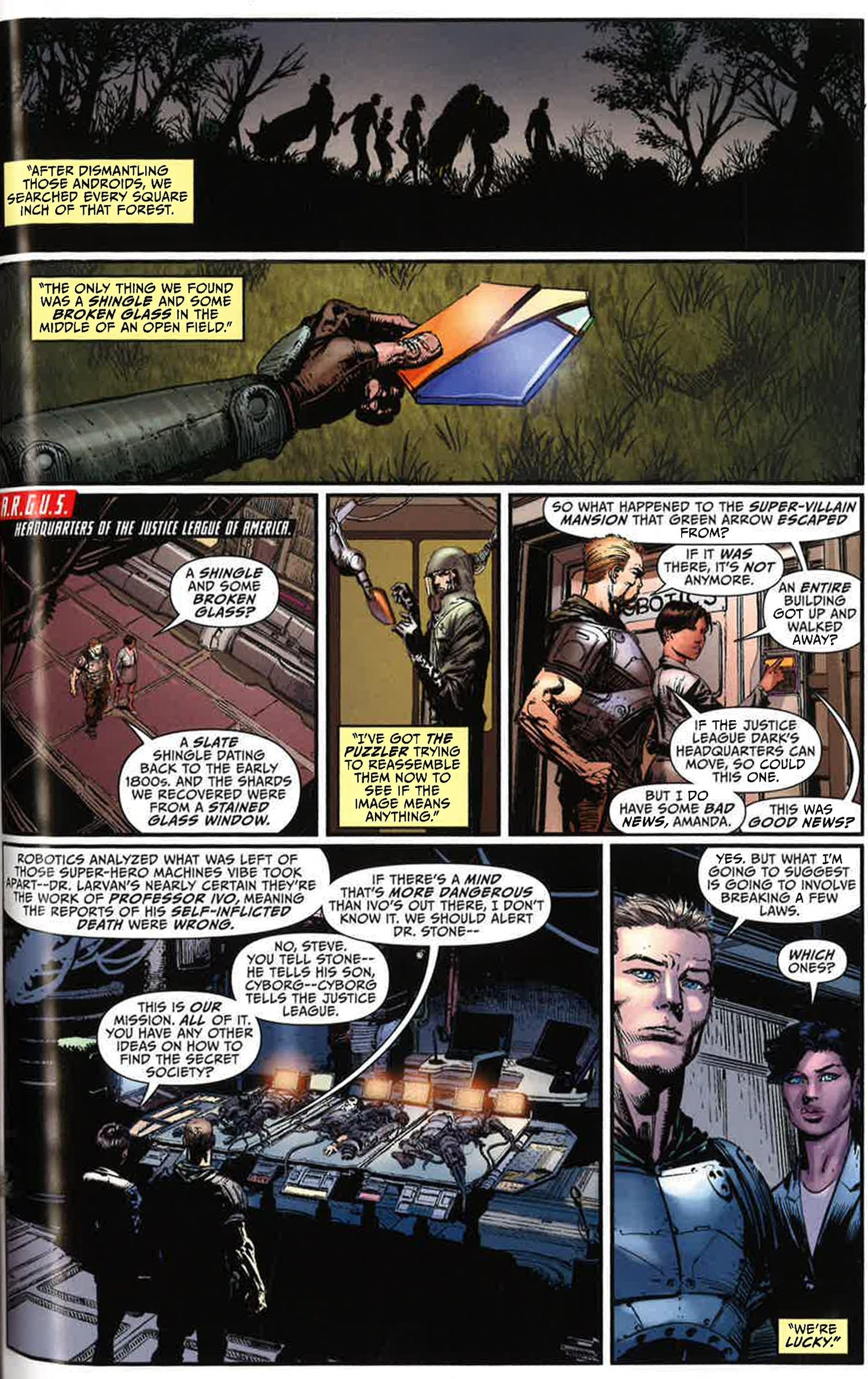 Following the events of Throne of Atlantis, it is deemed neccessary to create a new Justice League. This new superhero team is under the command of Col. Steve Trevor, of the United States Military's A.R.G.U.S. division (Advanced Research Group Uniting Superhumans). Signing up for duty with this new incarnation of the JLA are Catwoman, Katanna, Green Lantern, Green Arrow, Martian Manhunter, Hawkman, Star Girl, and the long-awaited return of 80s superhero, Vibe.