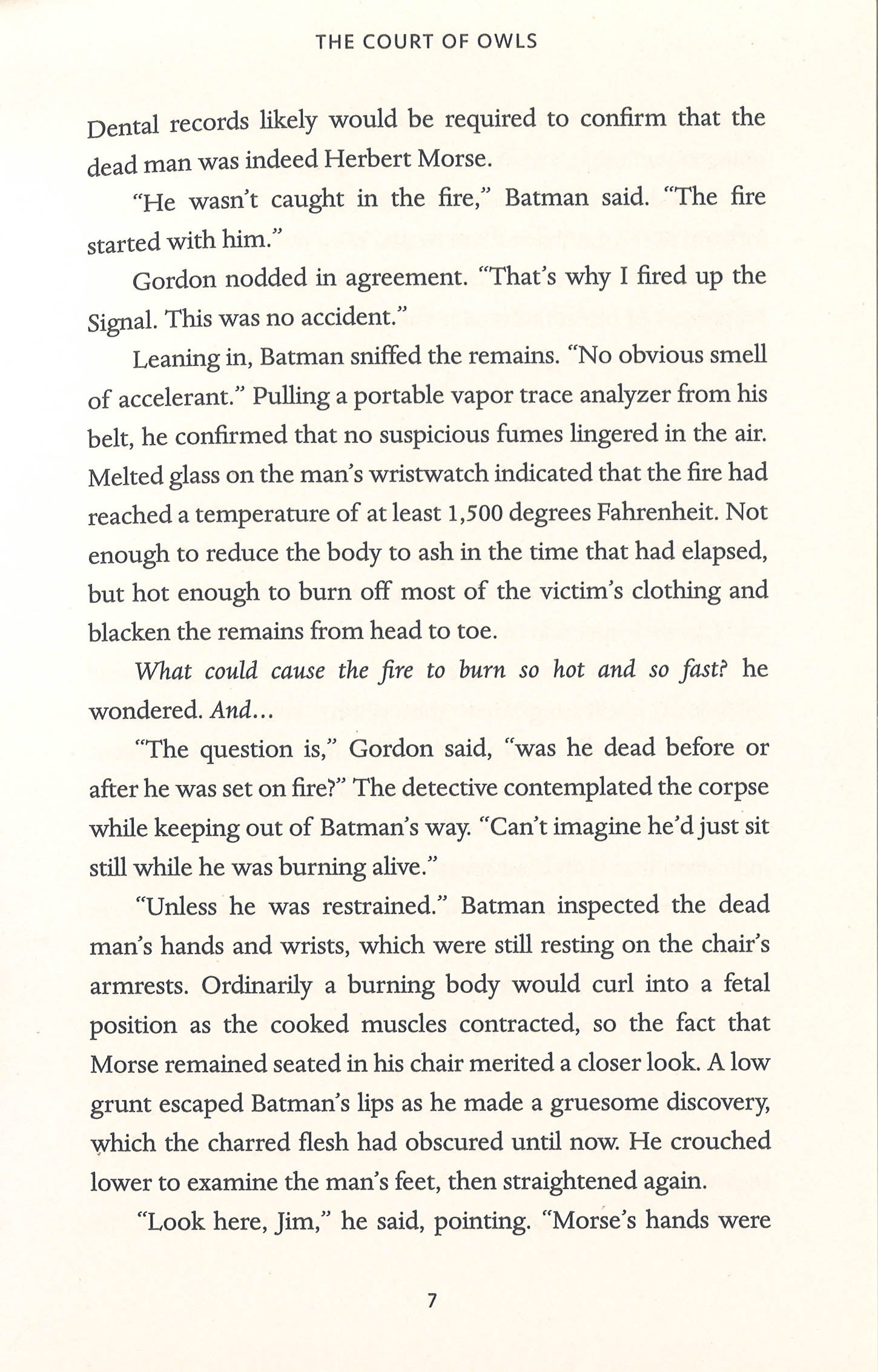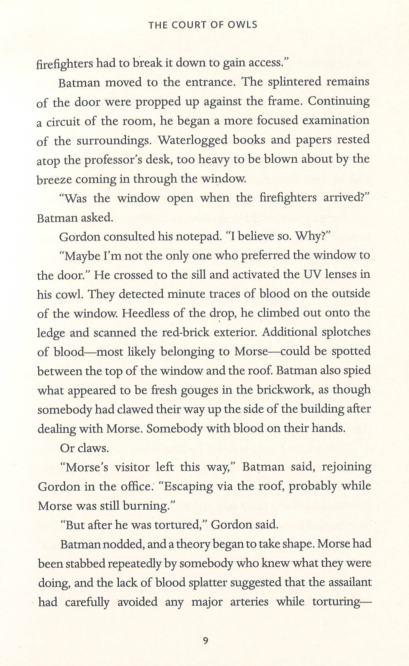 An original novel pitting Batman against the Court of Owls, a secret society of wealthy families that's controlled Gotham for centuries using murder and money.