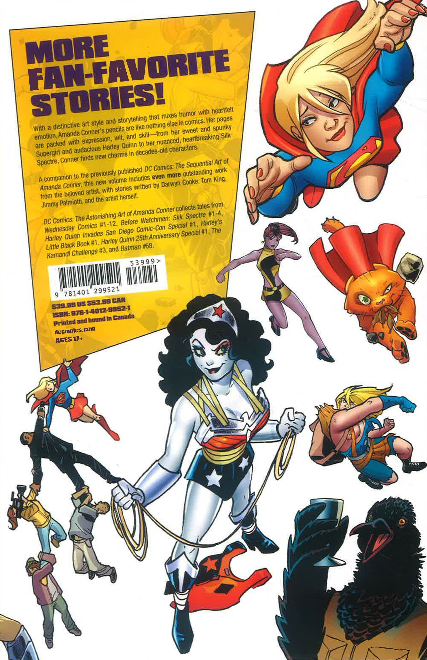 DC Comics: The Astonishing Art of Amanda Conner collects tales from Wednesday Comics #1-12, Before Watchmen: Silk Spectre #1-4, Harley Quinn Invades San Diego Comic-Con Special #1, Harley's Little Black Book #1, Harley Quinn 25th Anniversary Special #1, The Kamandi Challenge #3, and Batman #68.