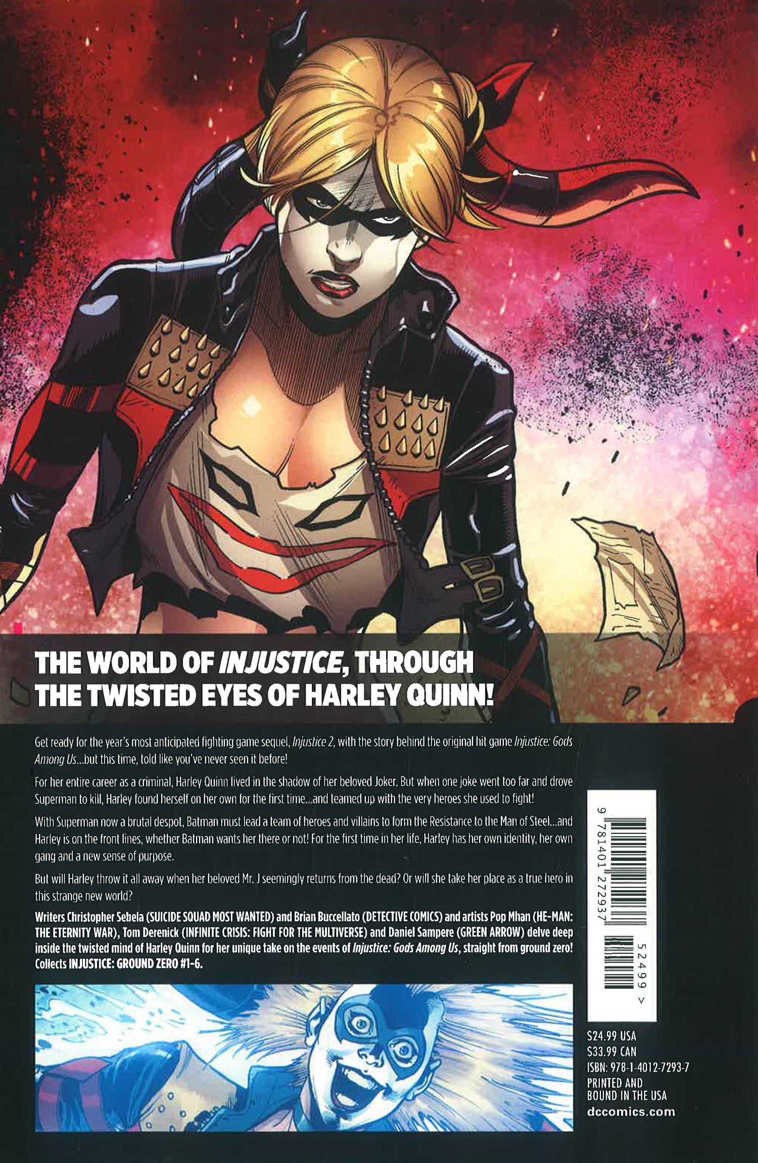 Writers Christopher Sebela (SUICIDE SQUAD MOST WANTED) and Brian Buccellato (DETECTIVE COMICS) and artists Pop Mhan (HE-MAN: THE ETERNITY WAR), Tom Derenick (INFINITE CRISIS: FIGHT FOR THE MULTIVERSE) and Daniel Sampere (GREEN ARROW) delve deep inside the twisted mind of Harley Quinn for her unique take on the events of Injustice: Gods Among Us, straight from ground zero!