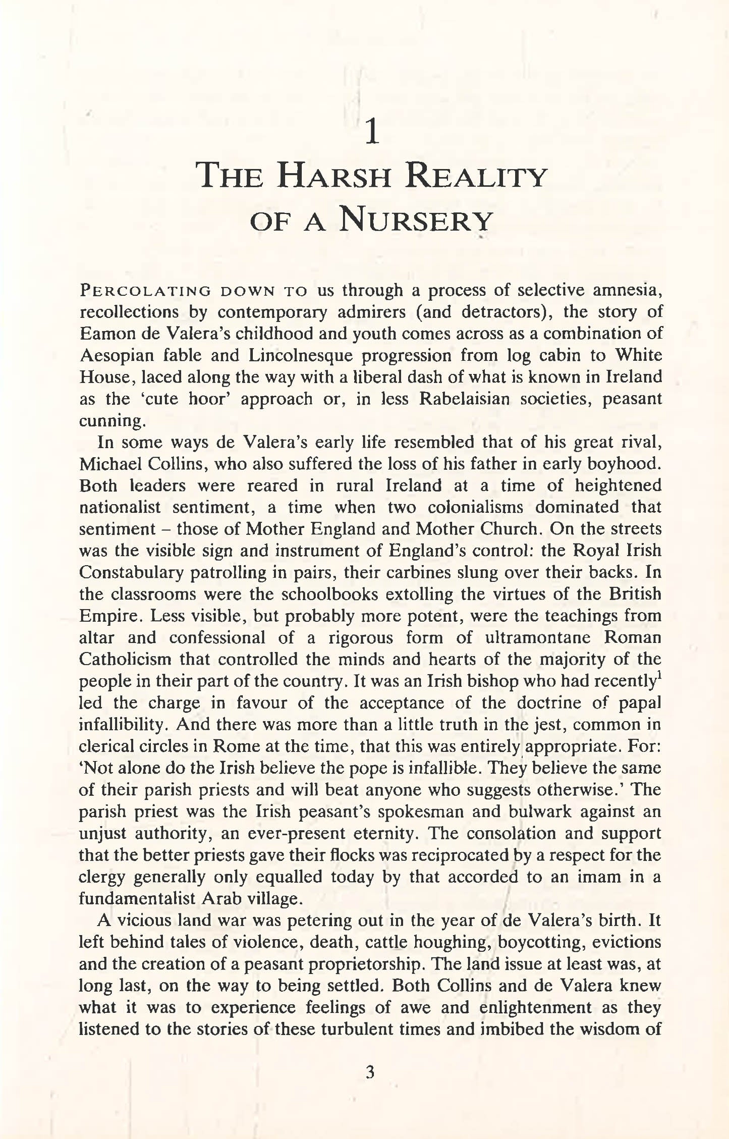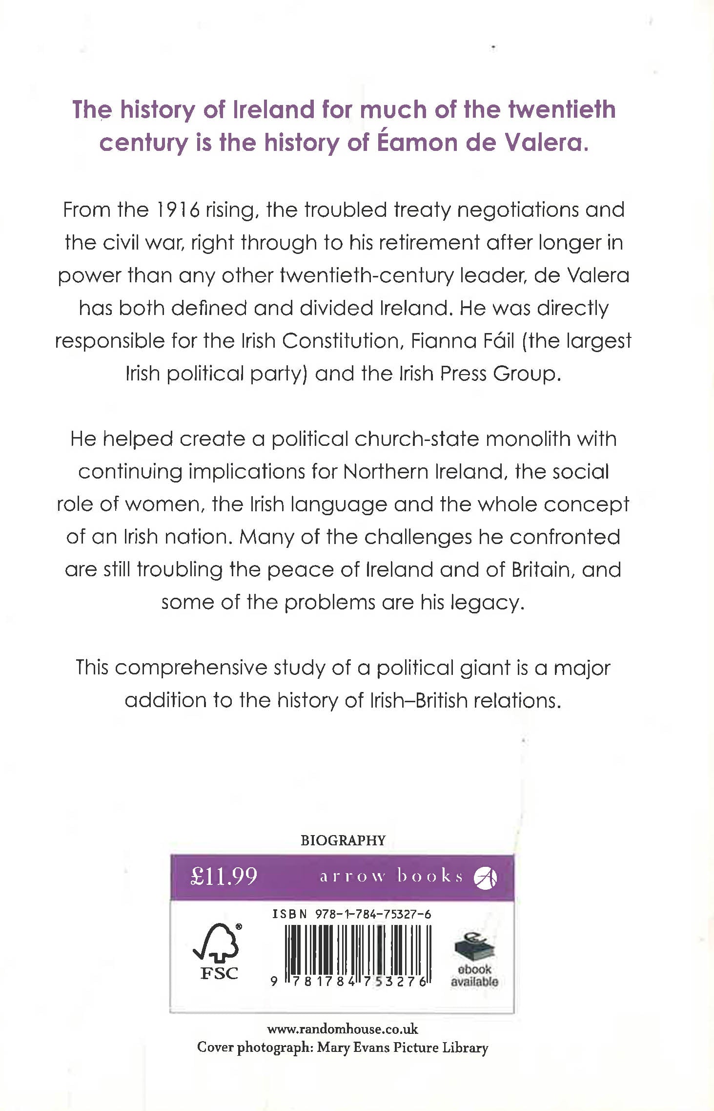 The history of Ireland for much of the Twentieth century is the history of Eamon De Valera. From the 1916 Rising, the troubled Treaty negotiations and the Civil War, right through to his retirement after longer in power than any other twentieth century leader, de Valera has both defined and divided Ireland. He was directly responsible for the Irish Constitution, Fianna Fail (the largest Irish political party) and the Irish Press Group.He helped create a political church-state monolith with continuing implications for Northern Ireland, the social role of women, the Irish language and the hole concept of an Irish nation. Many of the challenges he confronted are still troubling the peace of Ireland and of Britain, and some of the problems are his legacy. For de Valera was a world figure who attempted to confine his nation of disciples to the narrowest of cultural and intellectual horizons.