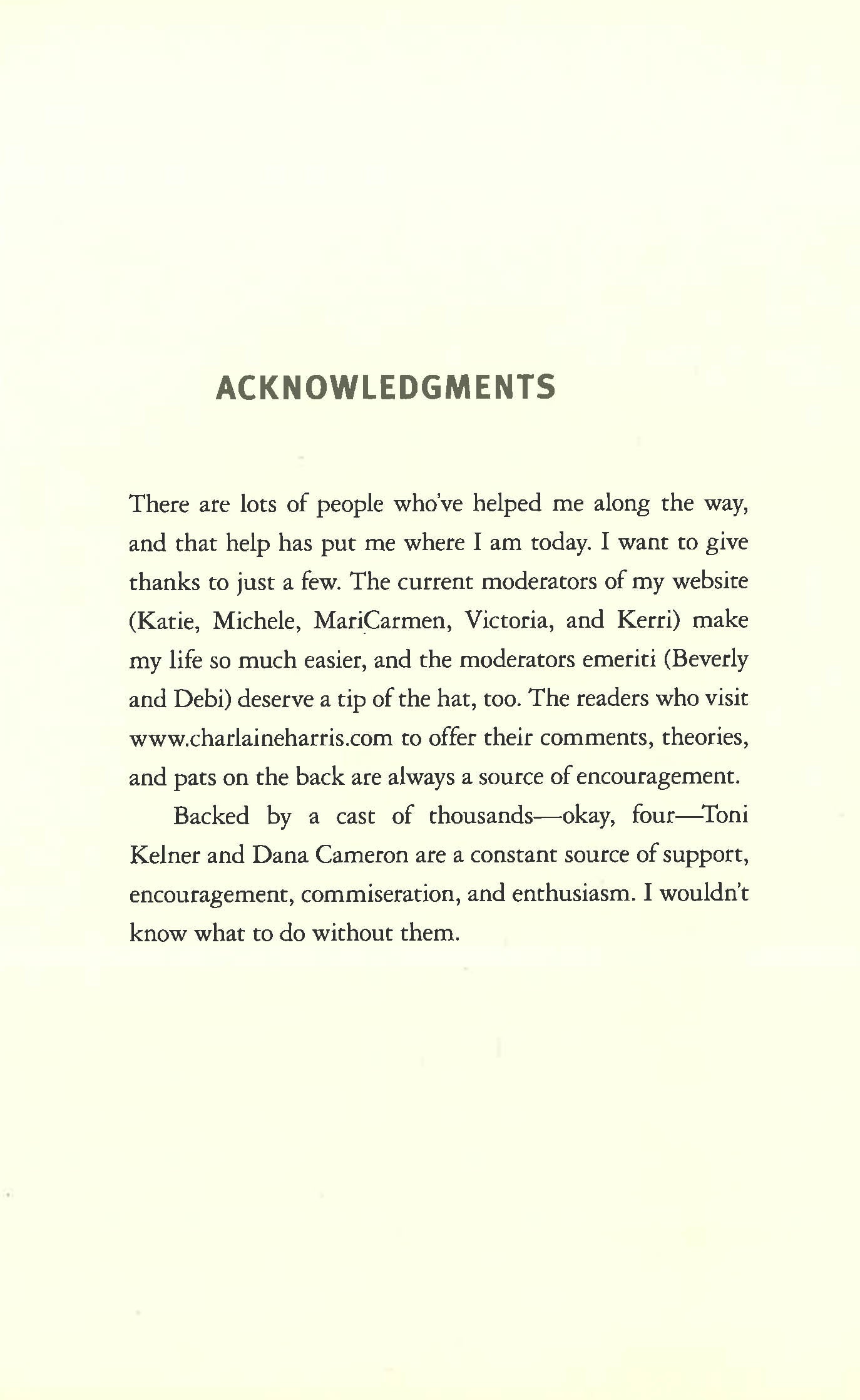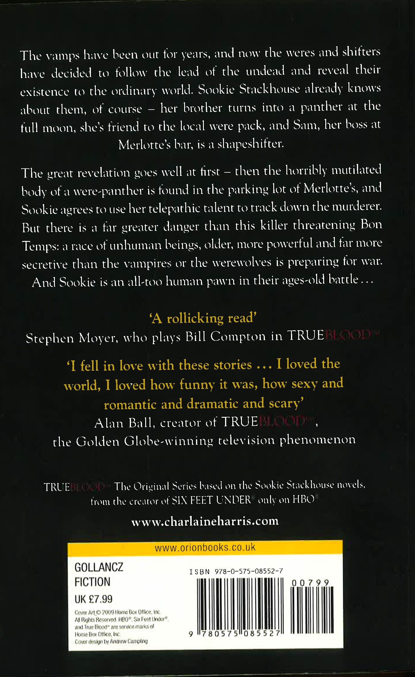 Now it's the turn of the weres and shifters to follow the lead of the undead and reveal their existence to the ordinary world. Sookie Stackhouse already knows about them, of course her brother turns into a panther at the full moon, she's friend to the local Were pack and Sam, her boss at Merlotte's bar, is a shifter. At first the great Were revelation seems to go well then the horribly mutilated body of a were panther is found outside Merlotte's. Though Sookie never cared that much for the victim, no one deserves such a horrible death, so she agrees to use her telepathic talent to track down the murderer. But what Sookie doesn't realise is that there is a far greater danger than this killer threatening Bon Temps: a race of unhuman beings, older, more powerful and far more secretive than the vampires or the werewolves is preparing for war ...