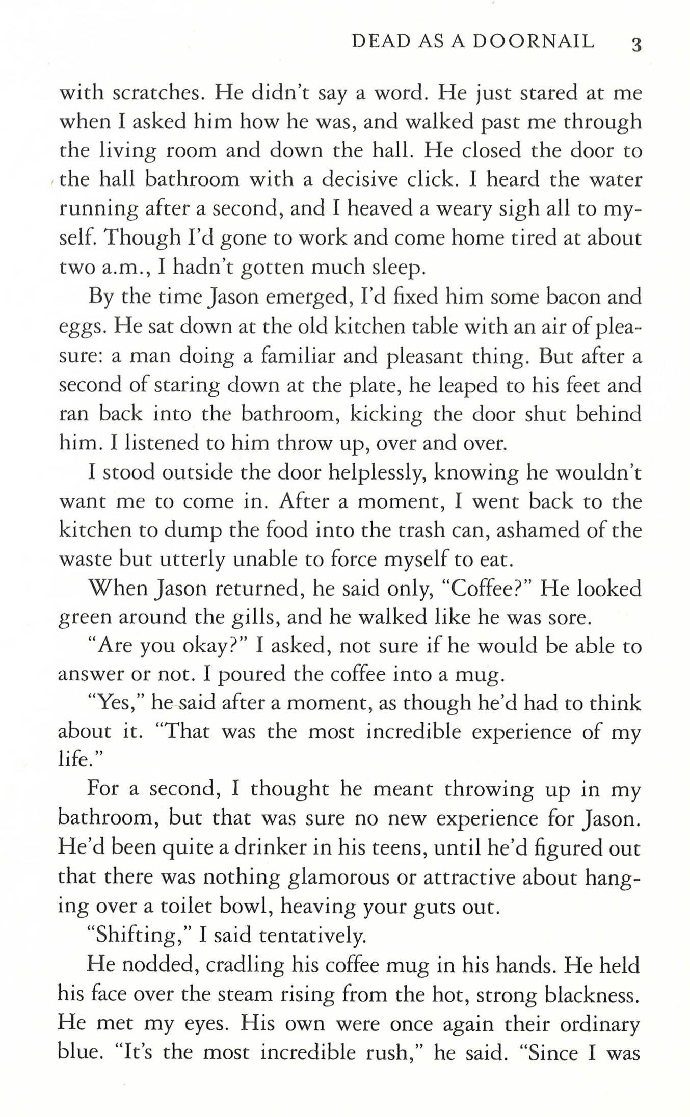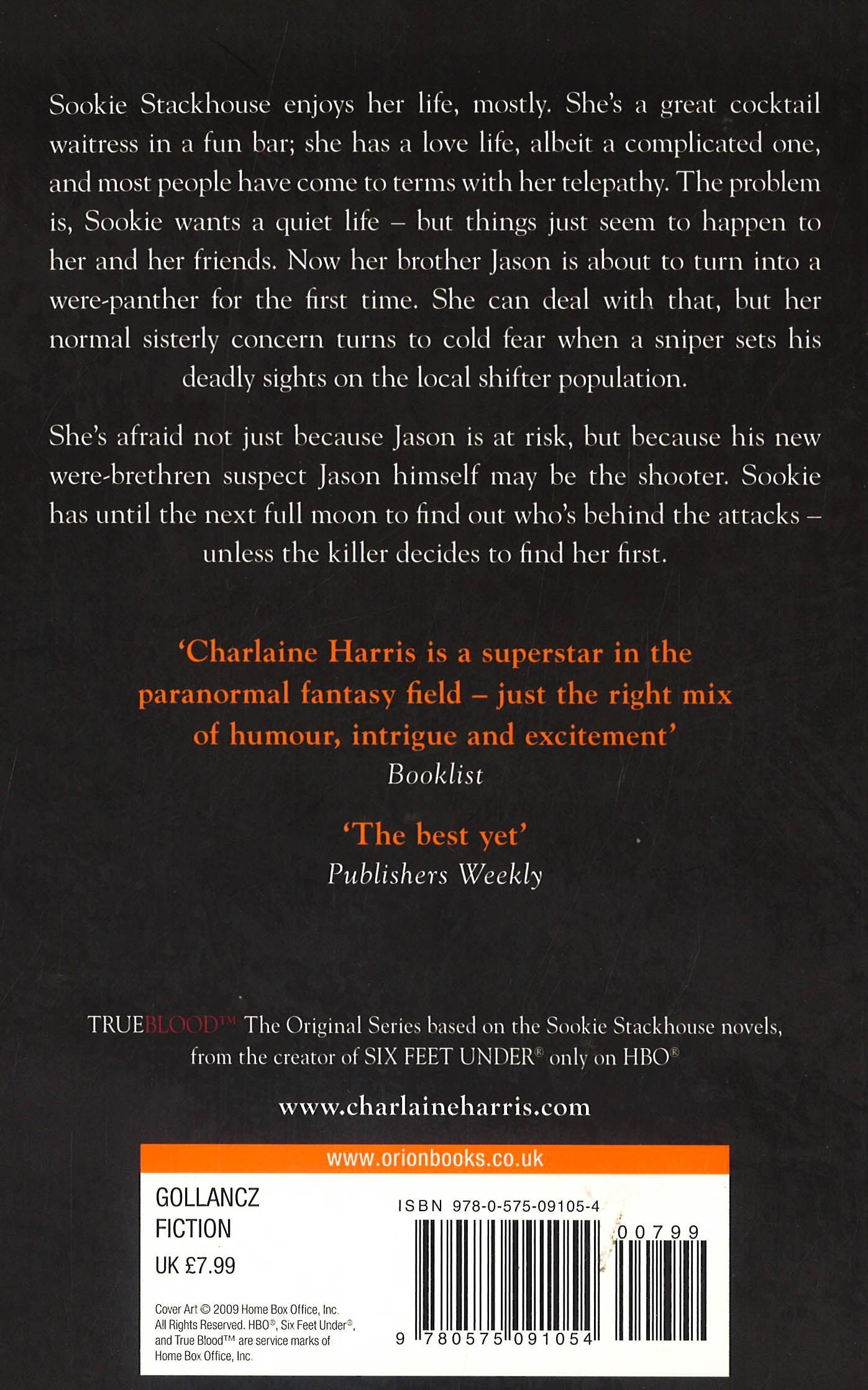 Sookie's got just a month, before the next full moon, to find out who wants her brother dead - and to stop the fiend!Sookie Stackhouse enjoys her life, mostly. She's a great cocktail waitress in a fun bar; she has a love life, albeit a bit complicated, and most people have come to terms with her telepathy. The problem is, Sookie wants a quiet life - but things just seem to happen to her and her friends.Now her brother Jason's eyes are starting to change: he's about to turn into a were-panther for the first time. She can deal with that, but her normal sisterly concern turns to cold fear when a sniper sets his deadly sights on the local changeling population. She afraid not just because Jason's at risk, but because his new were-brethren suspect Jason may be the shooter. Sookie has until the next full moon to find out who's behind the attacks - unless the killer decides to find her first.The Sookie Stackhouse books are delightful Southern Gothic supernatural mysteries, starring Sookie, the telepathic cocktail waitress, and a cast of increasingly colourful characters, including vampires, werewolves and things that really do go bump in the night.