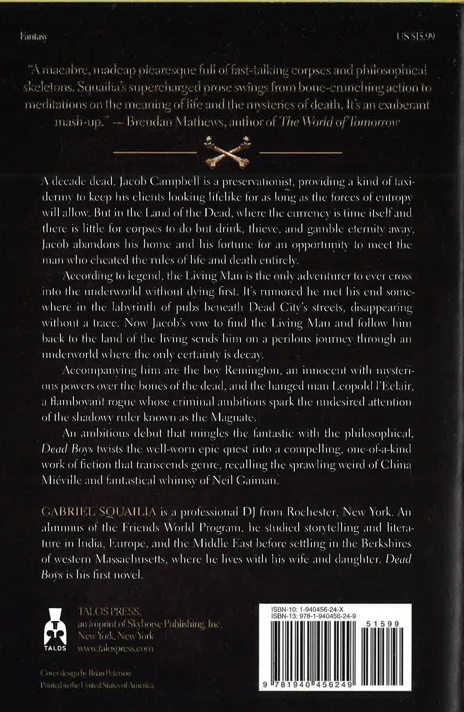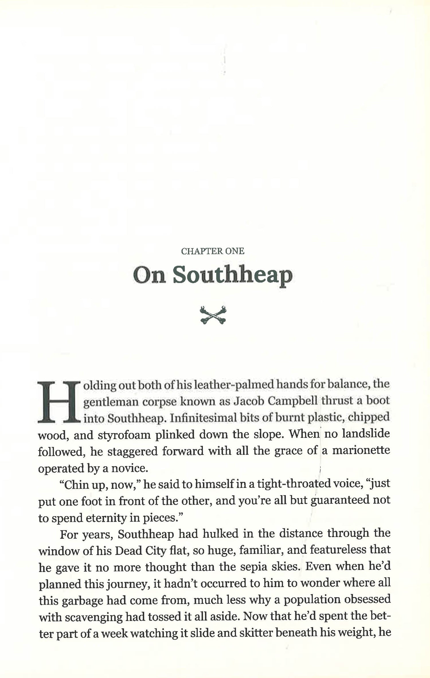 A decade dead, Jacob Campbell is a preservationist, providing a kind of taxidermy to keep his clients looking lifelike for as long as the forces of entropy will allow. But he’s willing to leave behind his career, his home, and his fortune to find the man who cheated the rules of life and death entirely.According to legend, the Living Man is the only adventurer to ever cross into the underworld without dying first. It’s rumored he met his end somewhere in the labyrinth of pubs beneath Dead City’s streets, disappearing without a trace.Accompanying Jacob on his quest are the boy Remington, an innocent with mysterious powers over the bones of the dead, and the hanged man Leopold l’Eclair, a flamboyant rogue whose criminal ambitions spark the undesired attention of a shadowy ruler. Together, they embark on a perilous journey through an underworld where the only certainty is decay.
