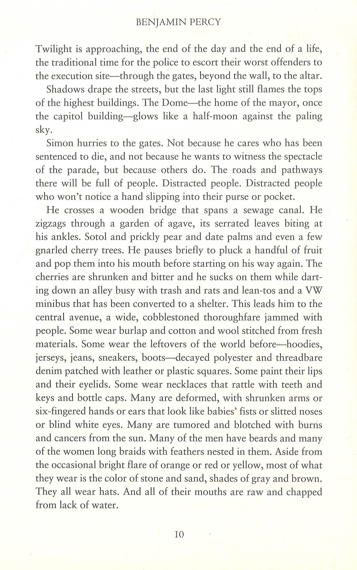 In Benjamin Percy's new thriller, a post-apocalyptic reimagining of the Lewis and Clark saga, a super flu and nuclear fallout have made a husk of the world we know. A few humans carry on, living in outposts such as the Sanctuary - the remains of St. Louis - a shielded community that owes its survival to its militant defense and fear-mongering leaders. Then a rider comes from the wasteland beyond its walls. She reports on the outside world: west of the Cascades, rain falls, crops grow, civilization thrives. But there is danger too: the rising power of an army that pillages and enslaves every community they happen upon. Against the wishes of the Sanctuary, a small group sets out in secrecy. Led by Lewis Meriwether and Mina Clark, they hope to expand their infant nation, and to reunite the States. But the Sanctuary will not allow them to escape without a fight.