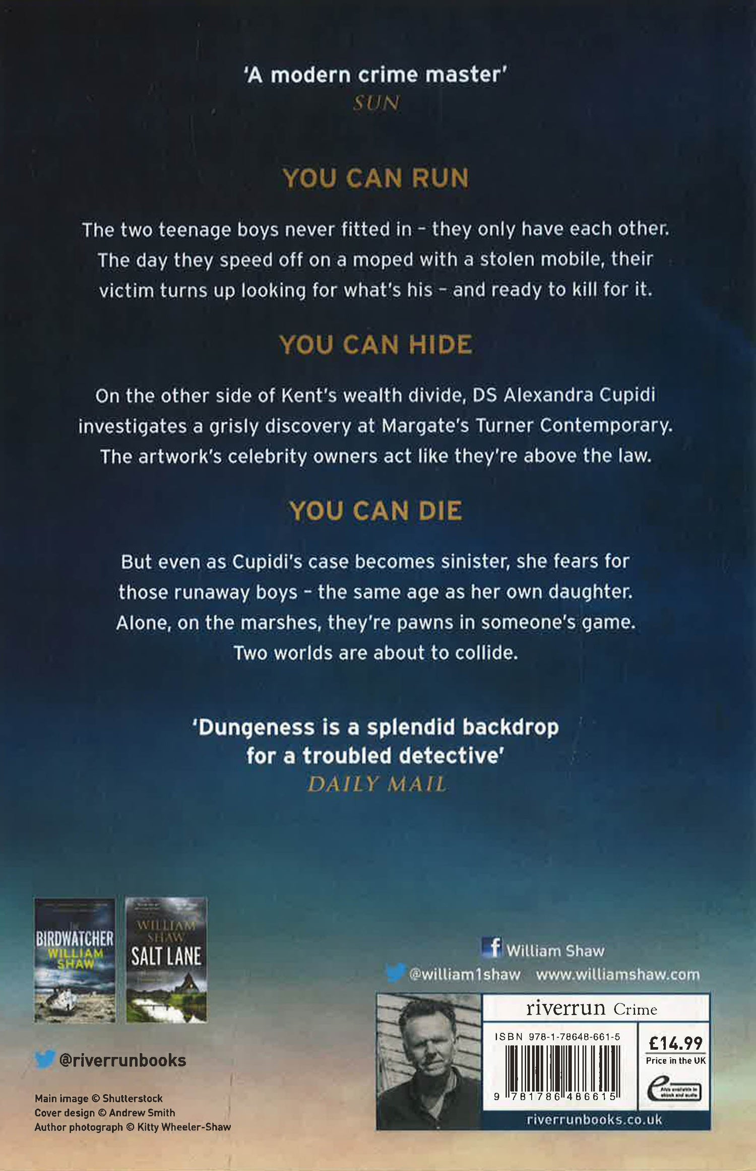 The two boys never fitted in. Seventeen, the worst age, nothing to do but smoke weed; at least they have each other. The day they speed off on a moped with a stolen mobile, they're ready to celebrate their luck at last. Until their victim comes looking for what's his - and ready to kill for it. YOU CAN HIDE On the other side of Kent's wealth divide, DS Alexandra Cupidi faces the strangest murder investigation of her career. A severed limb, hidden inside a modern sculpture in Margate's Turner Contemporary. No one takes it seriously - not even the artwork's owners, celebrity dealers who act like they're above the law. YOU CAN DIE But as Cupidi's case becomes ever more sinister, as she wrangles with police politics and personal dilemmas, she can't help worrying about those runaway boys. Seventeen, the same age as her own headstrong daughter. Alone, on the marshes, they're pawns in someone else's game. Two worlds are about to collide. Kent and its social divisions are brilliantly captured in Deadland, a crime thriller that's as ingeniously unguessable as it is moving and powerful.