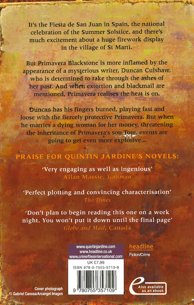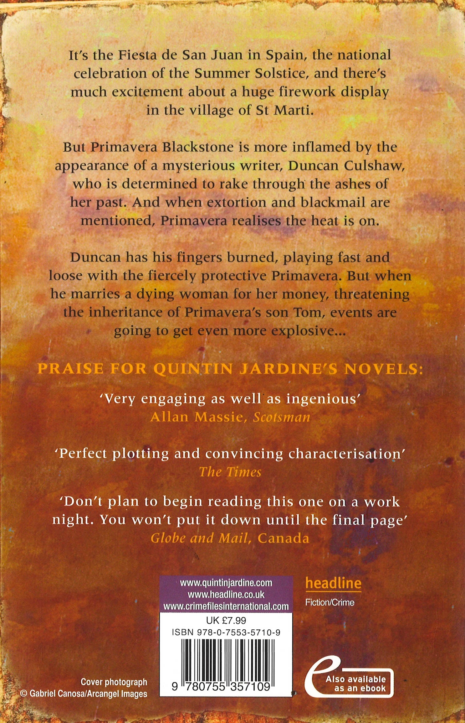 The thrilling new Primavera Blackstone crime mystery from Scotland's Crime Master It's the Fiesta de San Juan in Spain, the national celebration of the Summer Solstice, and there's much excitement about a huge firework display in the village of St Marti. But Primavera Blackstone is more inflamed by the appearance of a mysterious writer, Duncan Culshaw, who is determined to rake through the ashes of her past. And when extortion and blackmail are mentioned, Primavera realises the heat is on. Duncan has his fingers burned, playing fast and loose with the fiercely protective Prim, but when he marries a dying woman for her money, threatening the inheritance of Prim's son Tom, things are going to get explosive...but happily, there's a new guardian angel in town.
