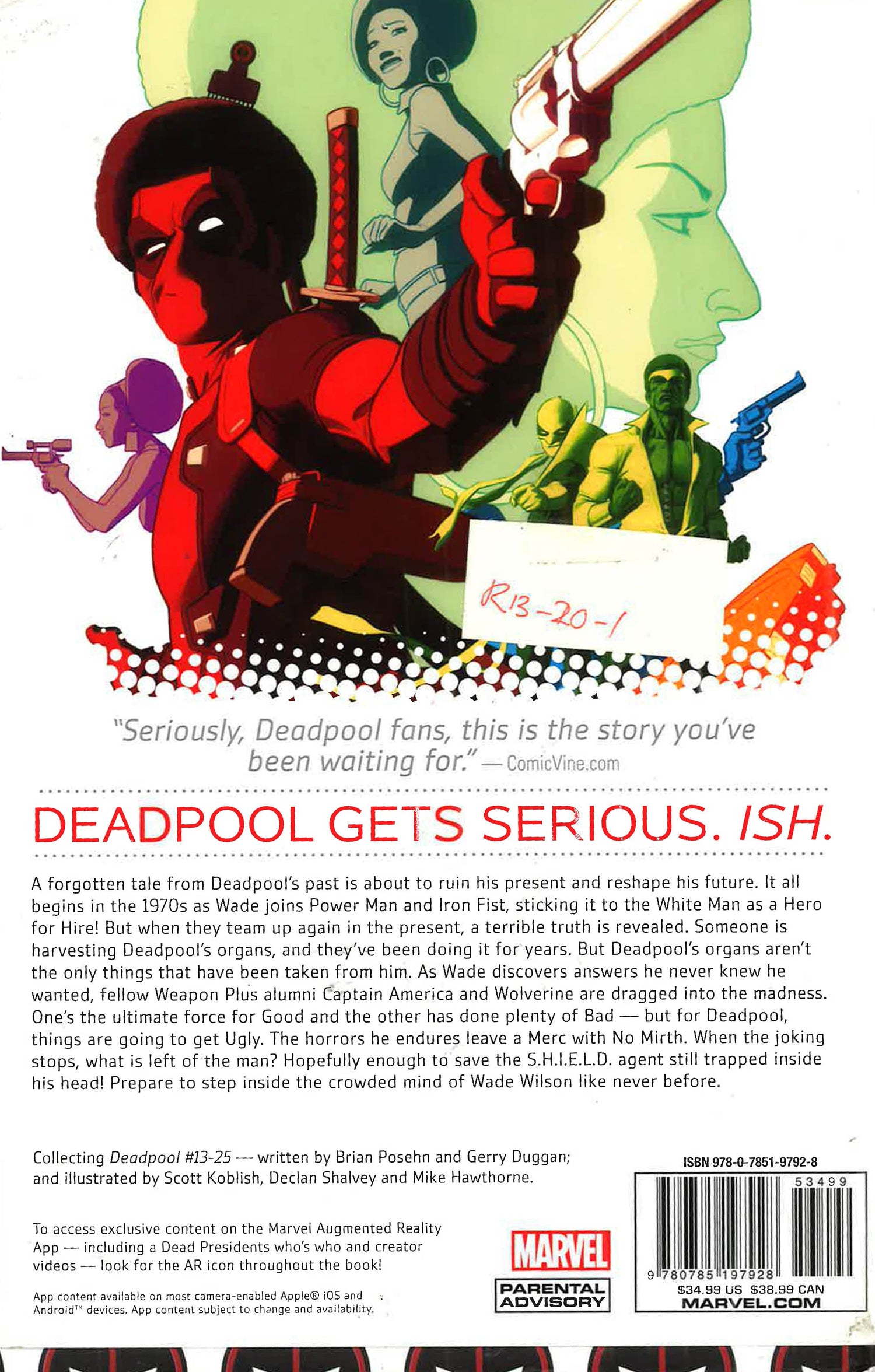 Gerry Duggan and Brian Posehn's hilarious, nonstop reinvention of the Merc With a Mouth continues! First, it's a lost adventure from the groovy seventies as Deadpool hits the streets with Power Man and Iron Fist! Then, when Deadpool's Weapon X past returns to haunt him, he recruits fellow Weapon Plus "alumni" Wolverine and Captain America! The reluctant team learns that Deadpool's past has been weaponized, but can they unite to take this new threat down? And when S.H.I.E.L.D. stiffs Deadpool on a bill, he declares a one-man war on the agency! But as S.H.I.E.L.D. discovers someone has been betraying them - and it seems to be Agent Preston - Deadpool faces down Agent Phil Coulson on the Helicarrier! Plus: Take another trip back to the past as the Deadpool wreaks havoc on a cosmic level!