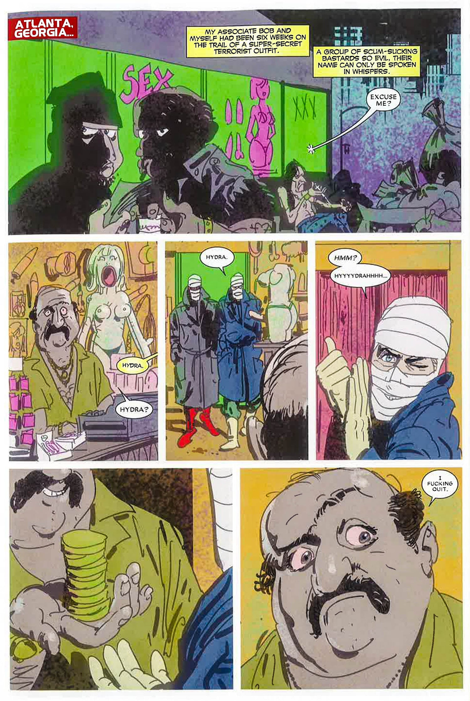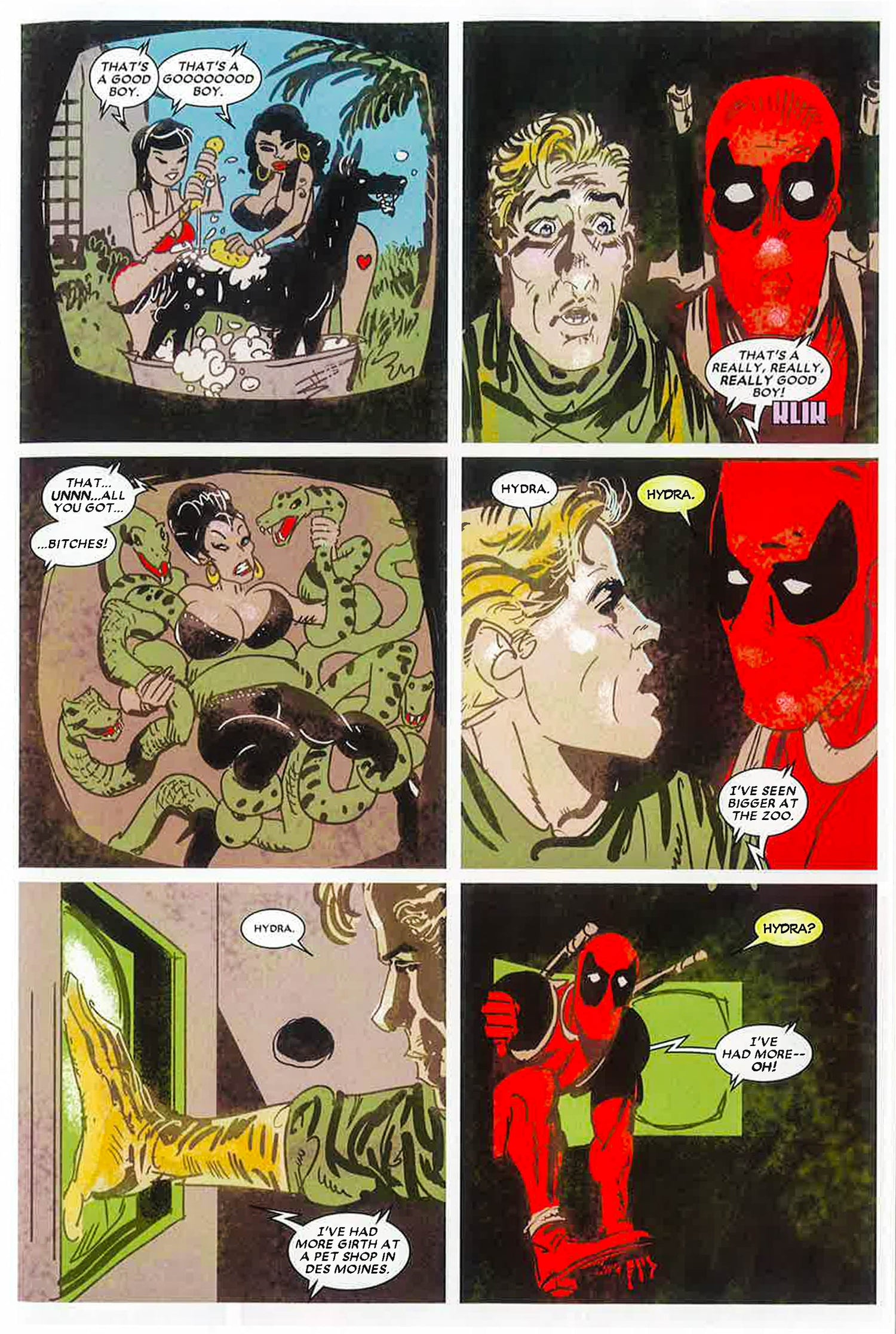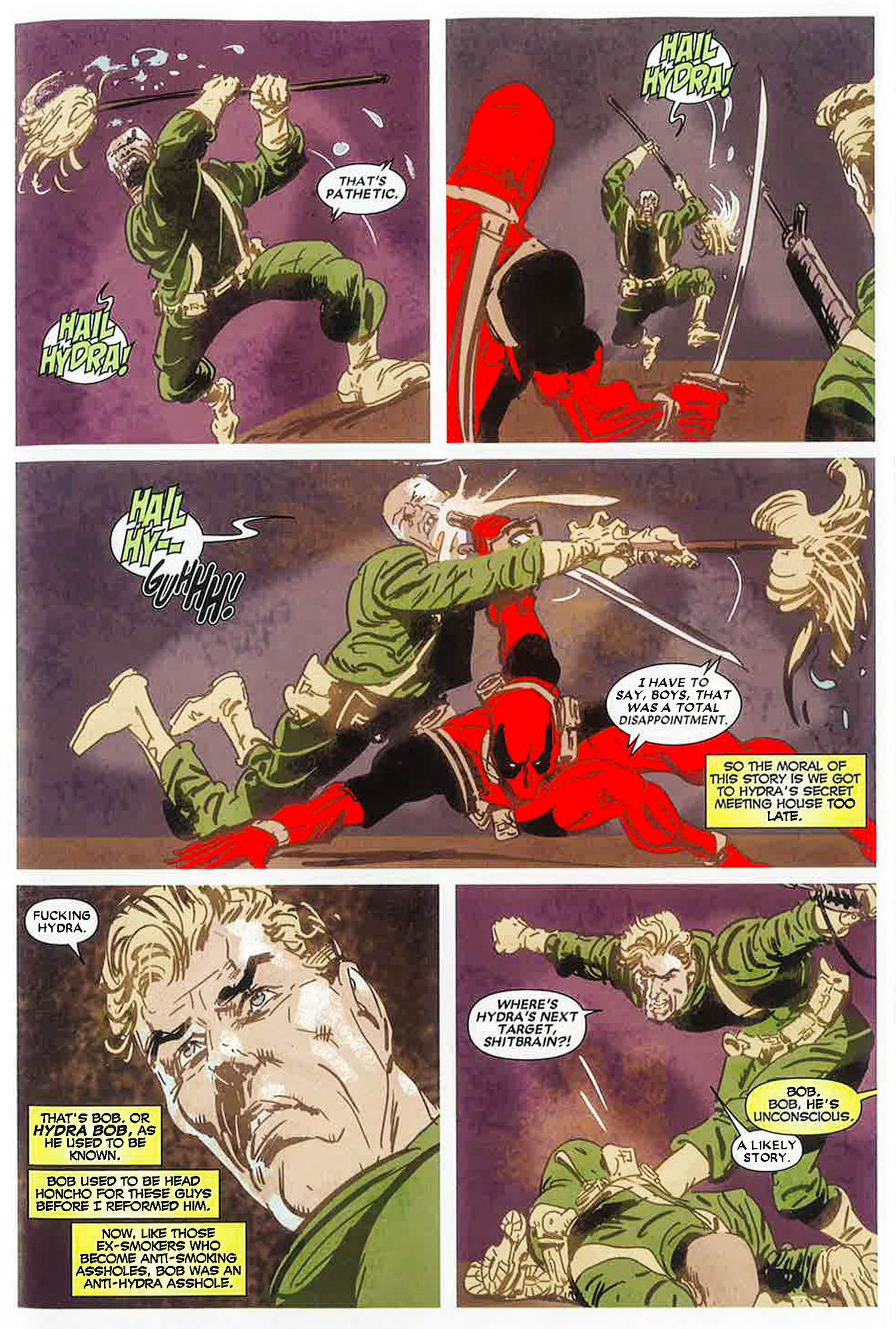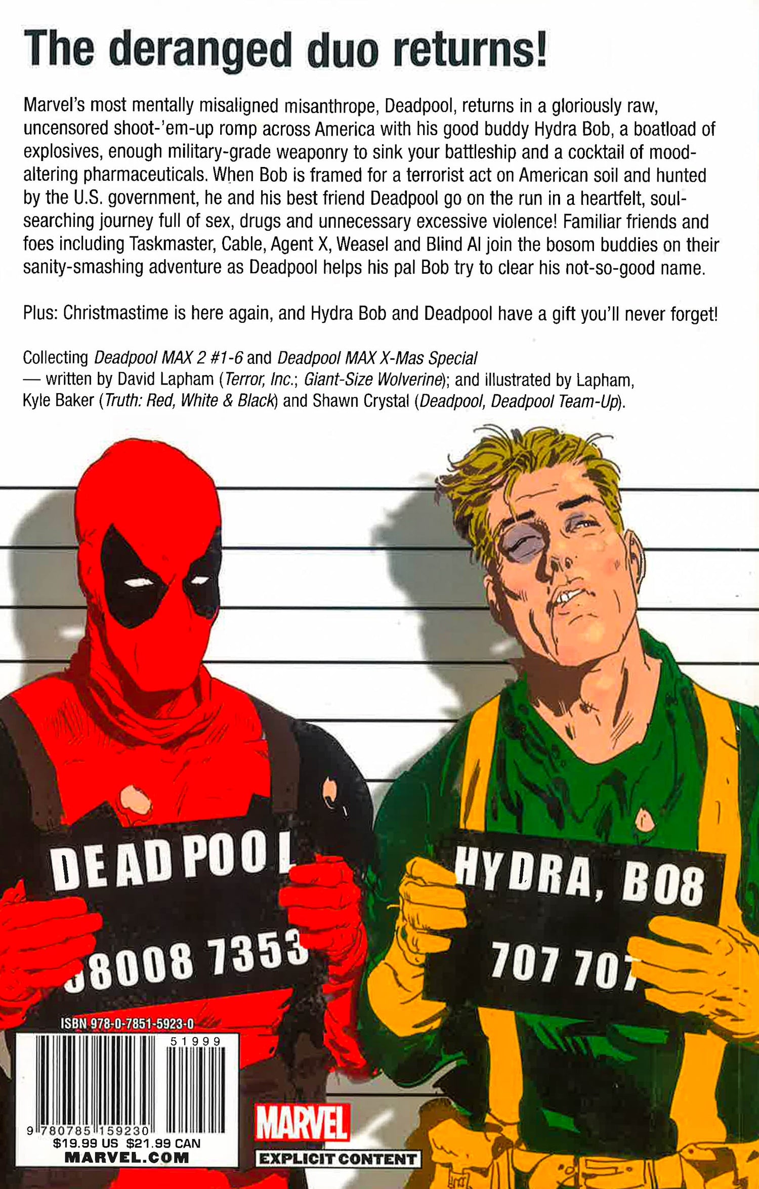 Marvel's most mentally misaligned misanthrope, Deadpool, returns in a gloriously raw, uncensored shoot-'em-up romp across America with his good buddy Hydra Bob, a boatload of explosives, enough military-grade weaponry to sink your battleship and a cocktail of mood-altering pharmaceuticals. When Bob is framed for a terrorist act on American soil and hunted by the U.S. government, he and his best friend Deadpool go on the run in a heartfelt, soul-searching journey full of sex, drugs and unnecessary excessive violence! Familiar friends and foes including Taskmaster, Cable, Agent X, Weasel and Blind Al join the bosom buddies on their sanity-smashing adventure as Deadpool helps his pal Bob try to clear his not-so-good name. Plus: Christmastime is here again, and Hydra Bob and Deadpool have a gift you'll never forget! COLLECTING: Deadpool Max 2 1-6, Deadpool Max X-Mas Special