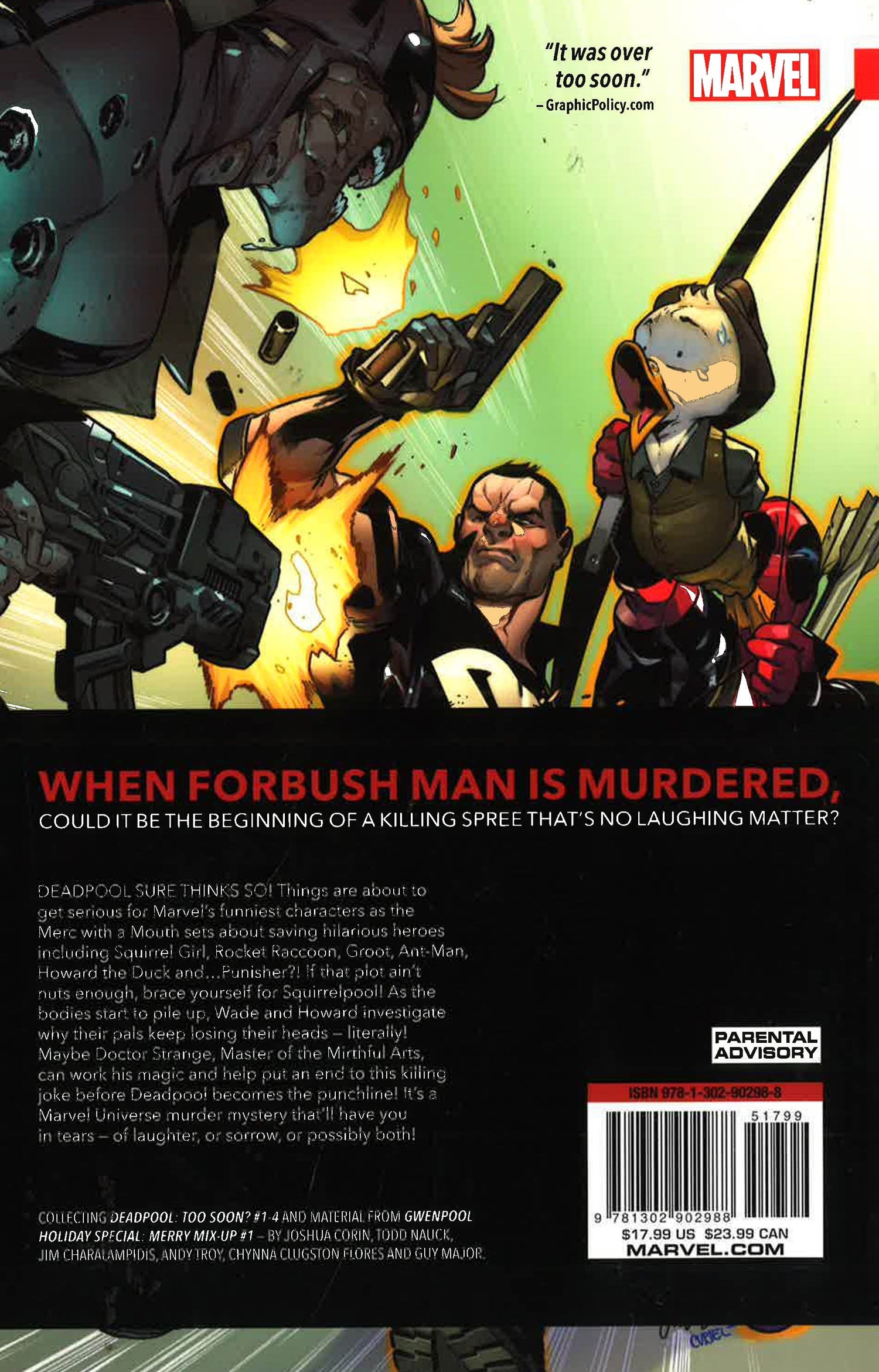SOMEONE HAS MURDERED FORBUSH MAN! Could someone be targeting all of Marvel's funniest characters for death? That's what Deadpool thinks, and now he's gotta act before someone bumps off SQUIRREL GIRL, ROCKET RACCOON, GROOT, ANT-MAN, HOWARD THE DUCK, and THE PUNISHER! (Like we said, the funny characters.) Good thing Deadpool is renowned for his investigative skills! COLLECTING: DEADPOOL: TOO SOON? 1-4