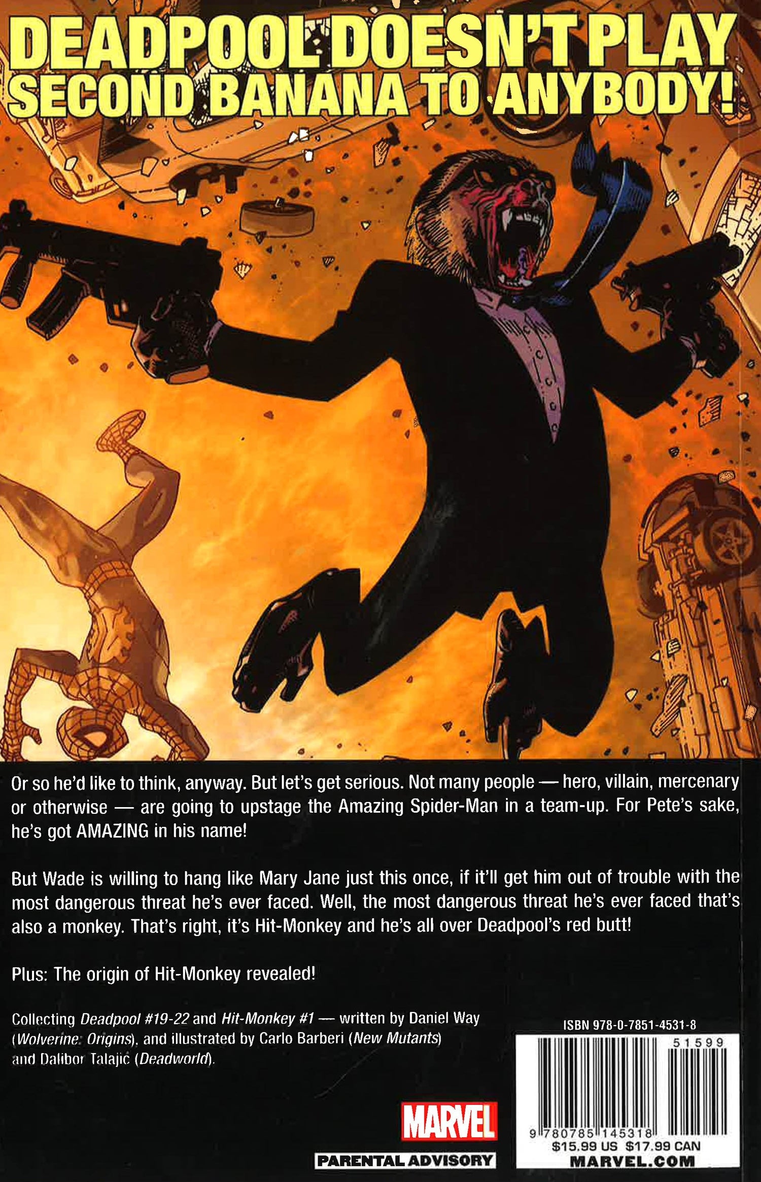 Deadpool and Spider-Man team up (yes, team up) to combat the unstoppable killing machine known as HIT-MONKEY! Yes, HIT-MONKEY. But can Deadpool do what it takes to rid New York of this terrifying new menace, or will he wilt under the monkey's soulful gaze? Plus: Bear witness as the legend of Hit-Monkey is born! COLLECTING: Deadpool #19-22, Hit-Monkey