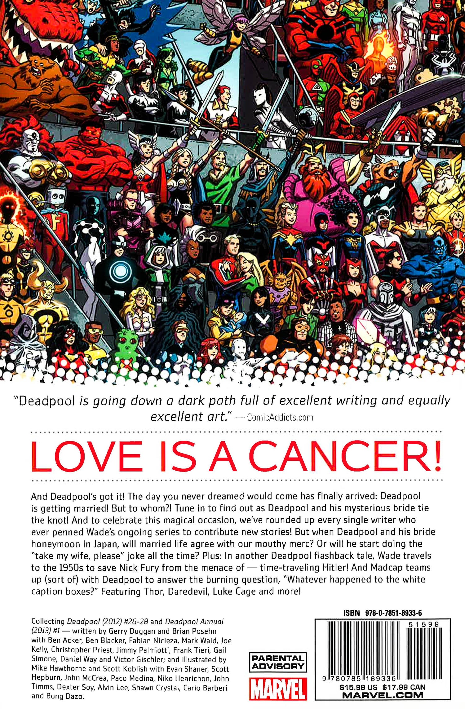 The day you never dreamed would come has finally arrived: Deadpool is getting married! But to whom?! Tune in to find out as Deadpool and his mysterious bride tie the knot! And to celebrate this magical occasion, we've rounded up every single writer who ever penned Wade's series to contribute new stories! But when Deadpool and his bride honeymoon in Japan, will married life agree with our mouthy merc? Or will he start doing the "take my wife, please" joke all the time? Plus: another Deadpool flashback tale, as Wade travels to the 1950s to save Nick Fury from the menace of - time-traveling Hitler! And Madcap teams up (sort of) with Deadpool to answer the burning question. "Whatever happened to the white caption boxes?" Featuring Thor, Daredevil, Luke Cage and more! Collecting DEADPOOL (2012) #26-28 and DEADPOOL ANNUAL (2013) #1. *This book may have remainder mark.