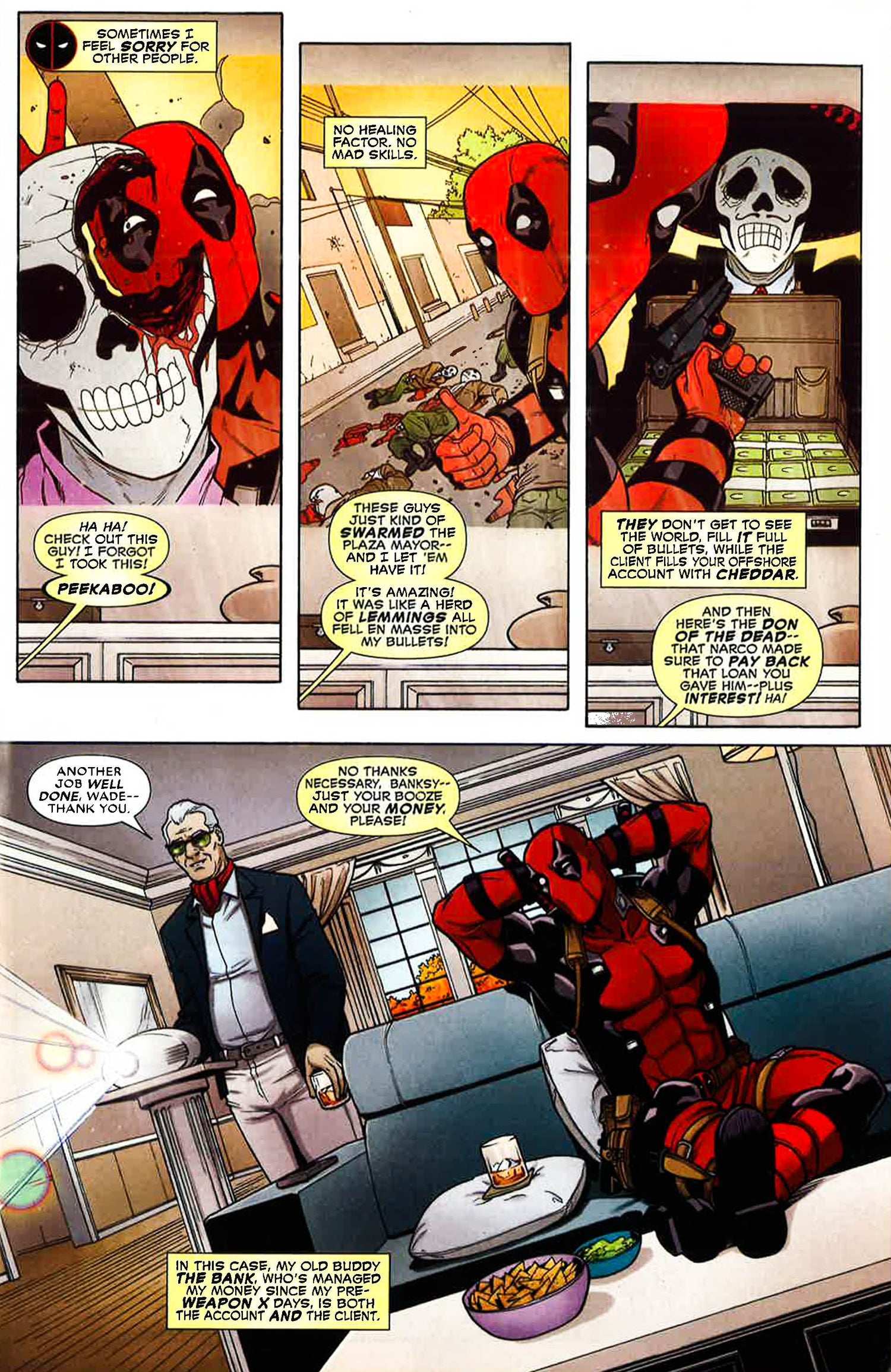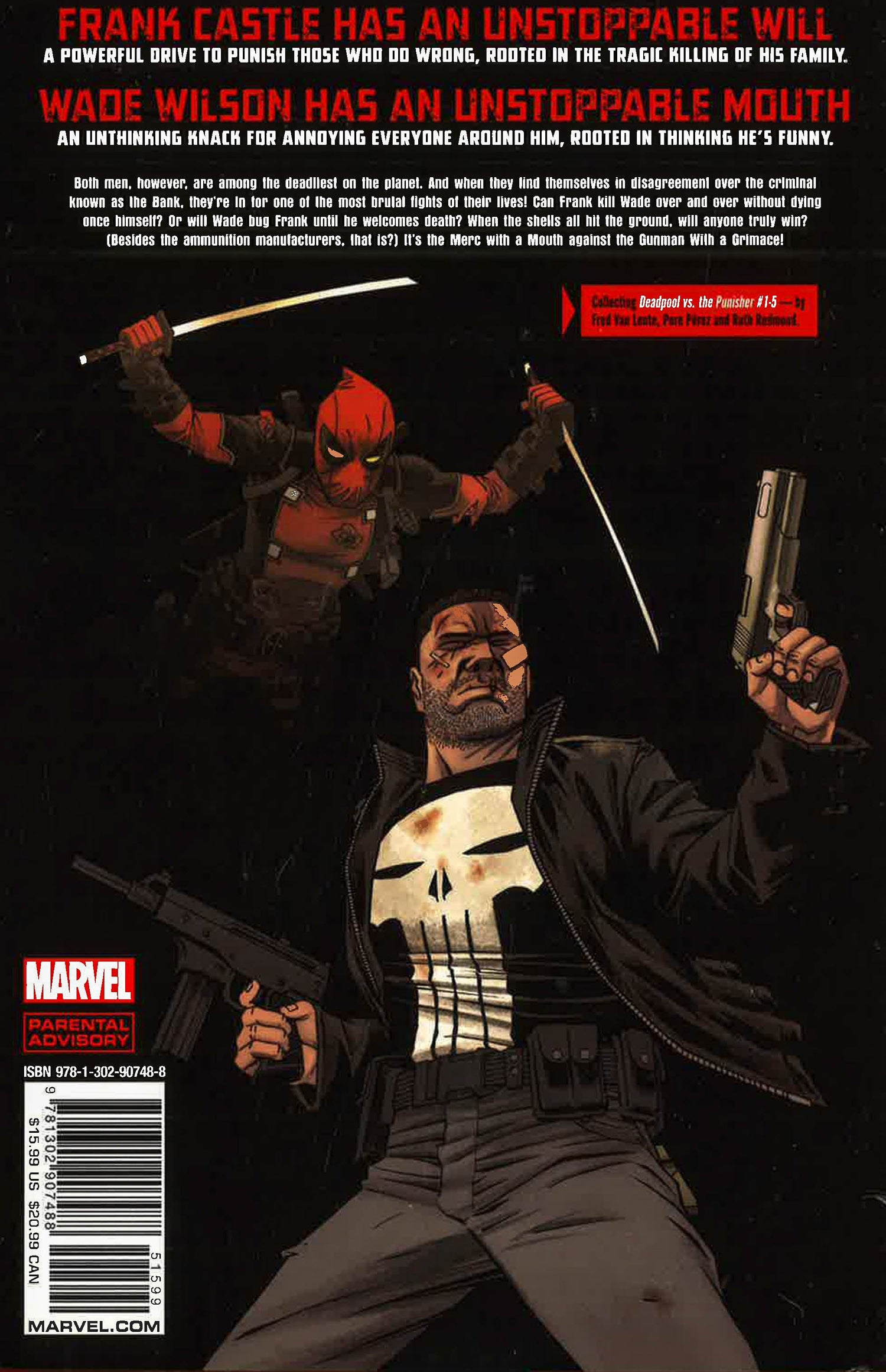 It's the Merc with a Mouth vs. the One-Man Army! When a man known simply as the Bank hires Deadpool to kill Frank Castle, it should be a simple task for Wade Wilson to execute, right? Except taking out the Punisher is a lot harder than Deadpool could have anticipated--especially since he likes the Punisher. A straightforward job becomes a knock-down-drag-out fight as they trade shot for shot. But things get complicated when the mercenary and the merciless Castle wind up embroiled in a bigger, messier conflict with the Bank front and center. The bloody and brutal fight never ceases regardless of what side Wade and Frank are on, even when it's seemingly the same side--just because they have a common enemy doesn't make them partners in crime. To the victor belong the spoils, but is there a clear winner here?