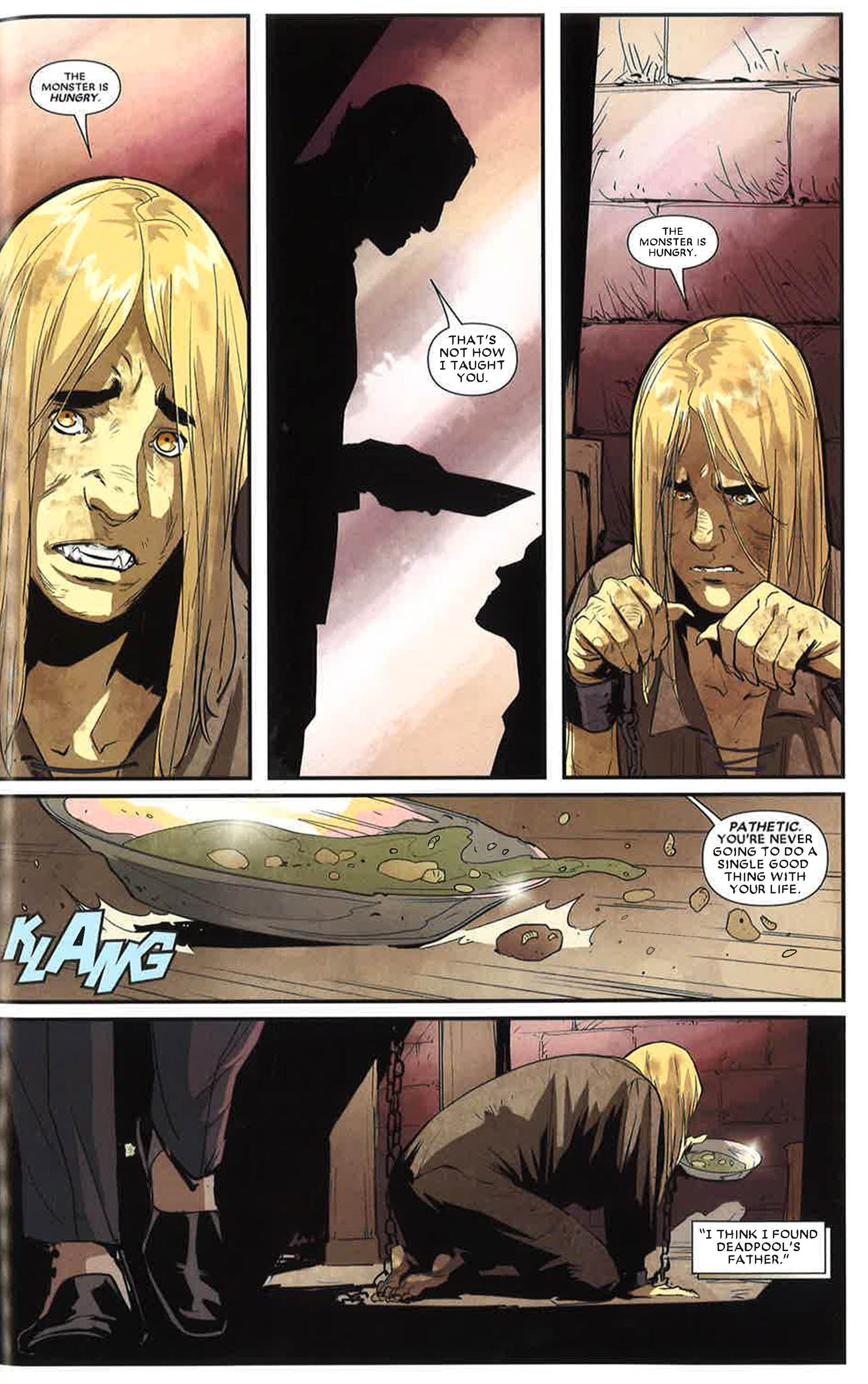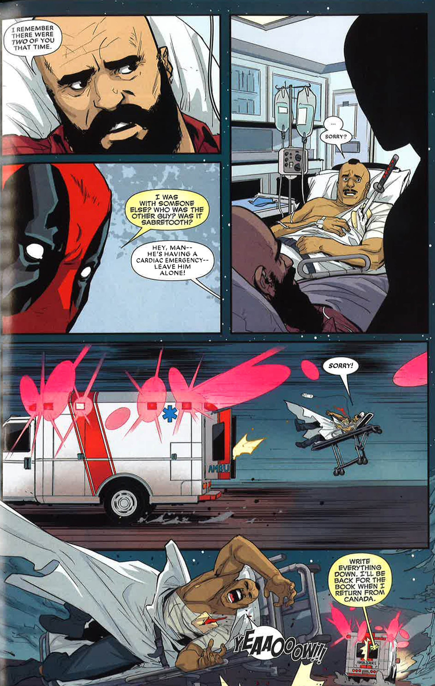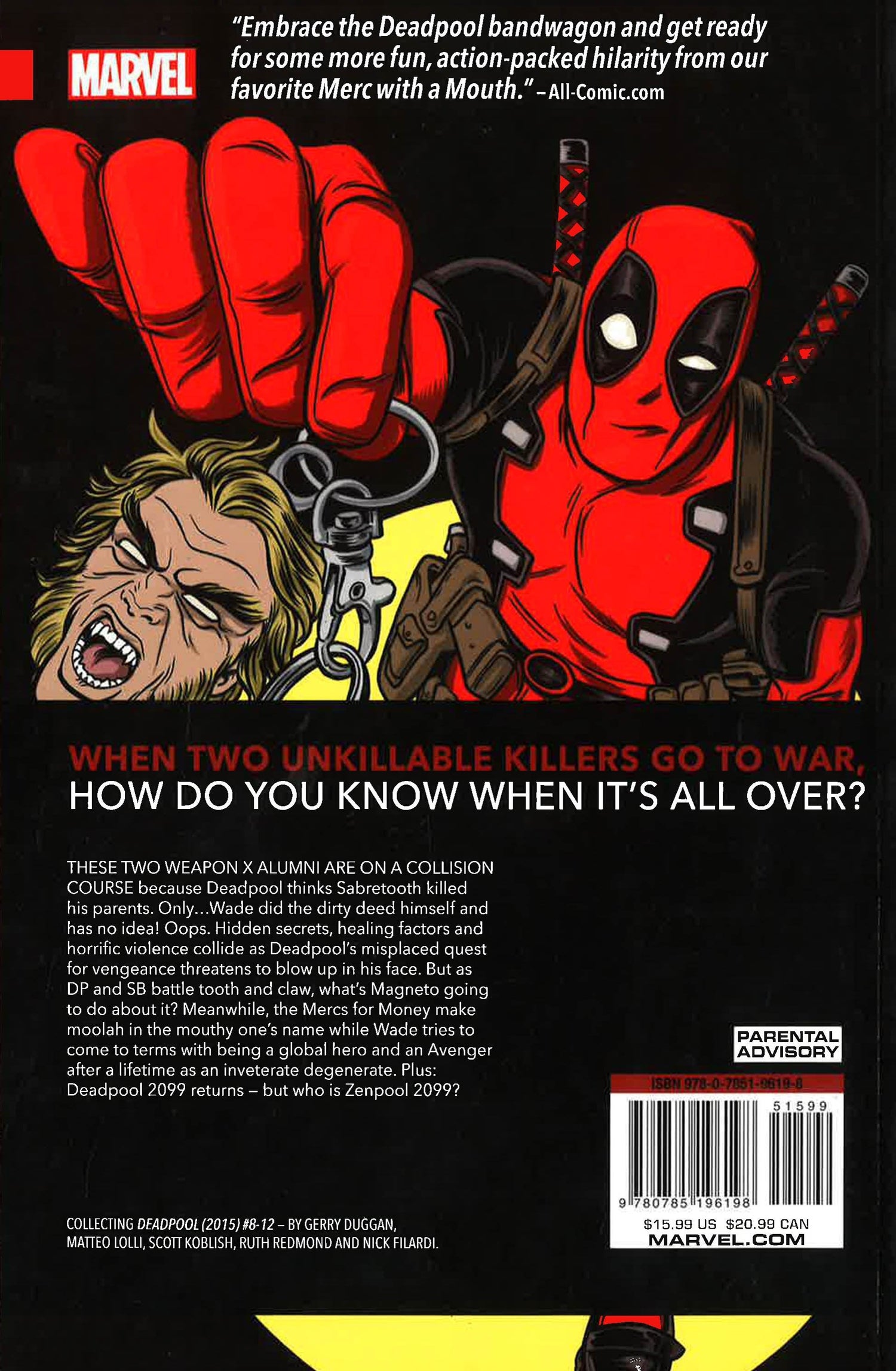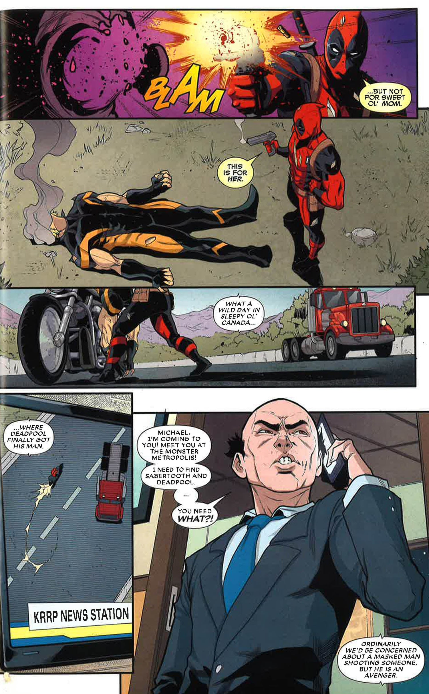 Deadpool vs. Sabretooth! But when two unkillable killers go to war, how do you know when it's all over? These two Weapon X alumni are on a collision course, because Deadpool thinks that Sabretooth killed his parents. The really messy part is that Wade did the dirty deed himself, and has no idea! Hidden secrets, healing factors and horrific violence all collide as Deadpool's misplaced quest for vengeance threatens to blow up in his face. But as DP and SB battle tooth and claw, what is Victor Creed's fellow Uncanny X-Man Magneto going to do about it? Meanwhile, the Mercs For Money make moolah in the mouthy one's name while Wade tries to come to terms with being a global hero and an Avenger, after a lifetime as an inveterate degenerate. How's he coping?