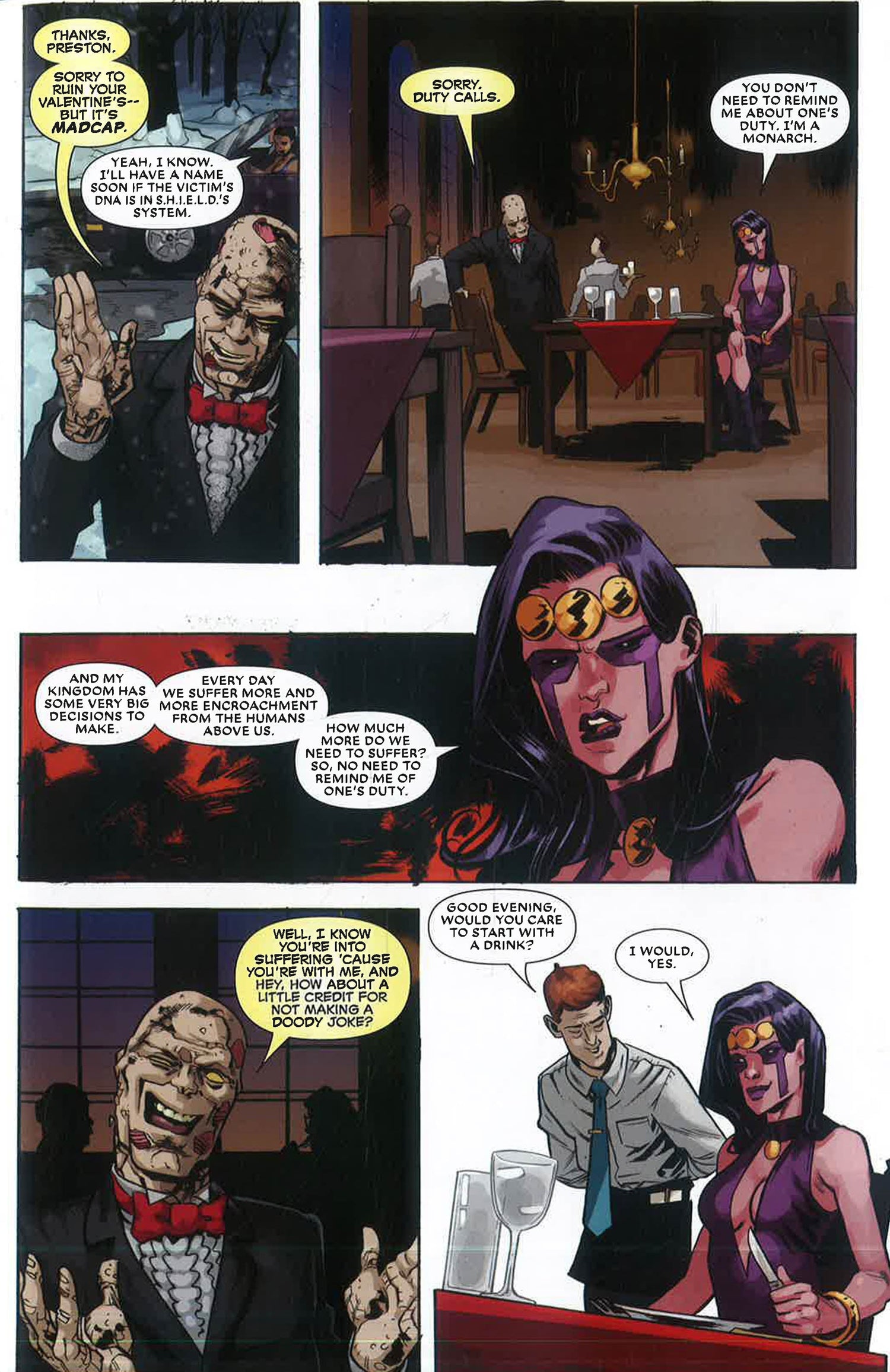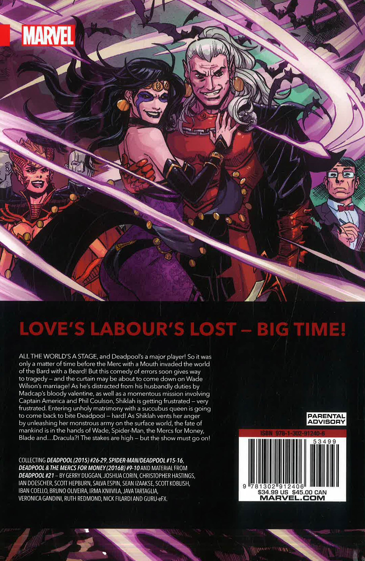 All the world's a stage, and he's a major player! Forsooth, Deadpool faces a comedy of errors, trapped in the works of William Shakespeare! Whether it turns out to be a midsummer night's dream, or much ado about nothing, it's sure to be Deadpool as you like it! Fingers crossed that all's well that ends well, so Wade can return to the tragedy that is his regular life - and the collapse of his marriage! Don't forget, Deadpool's wife Shiklah is a demon succubus who rules her own monster kingdom. So when she's upset, it's seriously bad news for Deadpool, Spider-Man and the Mercs for Money! Plus: Tales with Wade's Uncanny Avengers buddies, Rogue and Captain America!