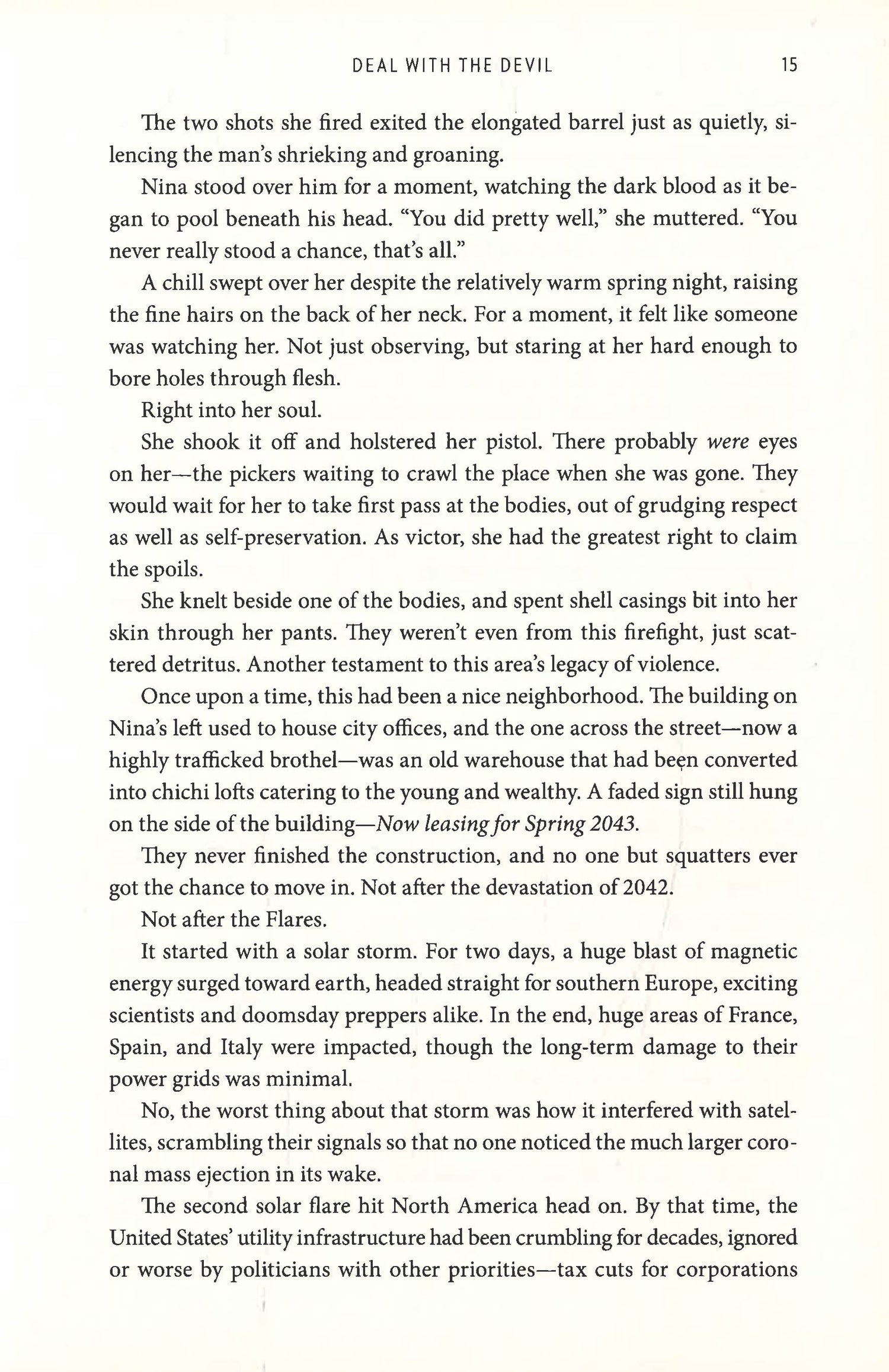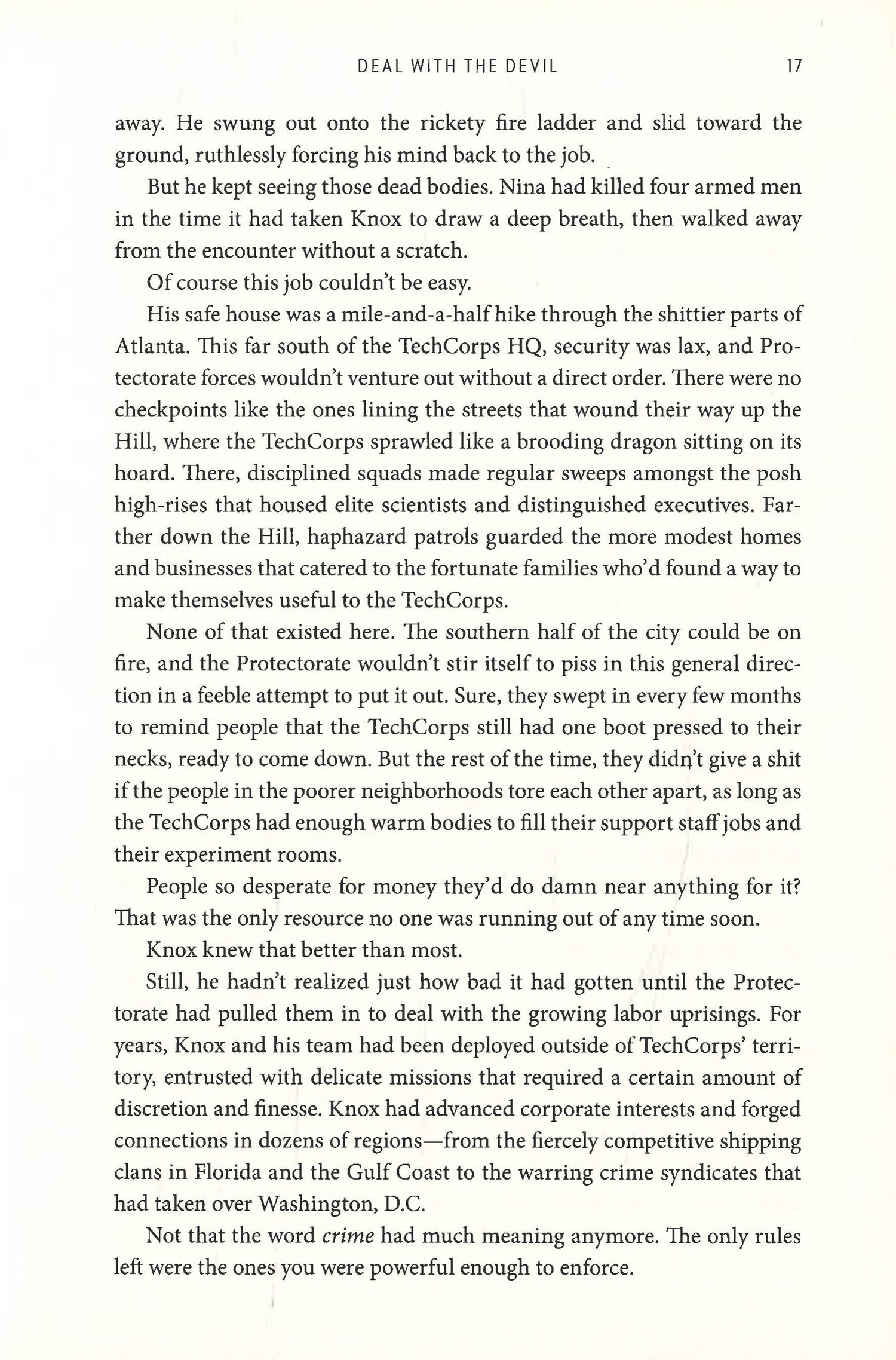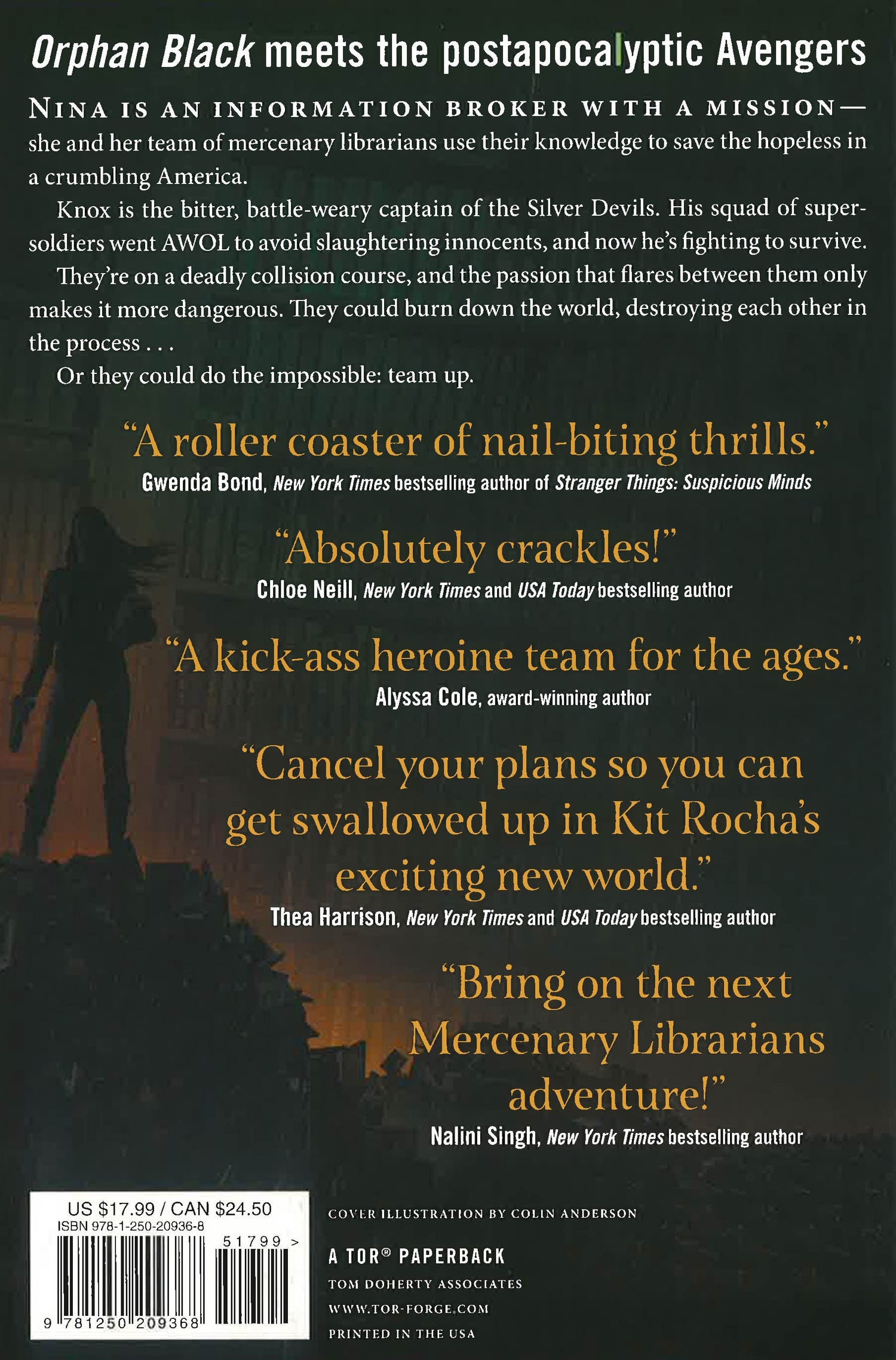 Deal with the Devil is Orphan Black meets the post-apocalyptic Avengers by USA Today and New York Times bestselling author duo Kit Rocha. Nina is an information broker with a mission--she and her team of mercenary librarians use their knowledge to save the hopeless in a crumbling America. Knox is the bitter, battle-weary captain of the Silver Devils. His squad of supersoldiers went AWOL to avoid slaughtering innocents, and now he's fighting to survive. They're on a deadly collision course, and the passion that flares between them only makes it more dangerous. They could burn down the world, destroying each other in the process... Or they could do the impossible: team up. This is the first book in a near-future science fiction series with elements of romance.