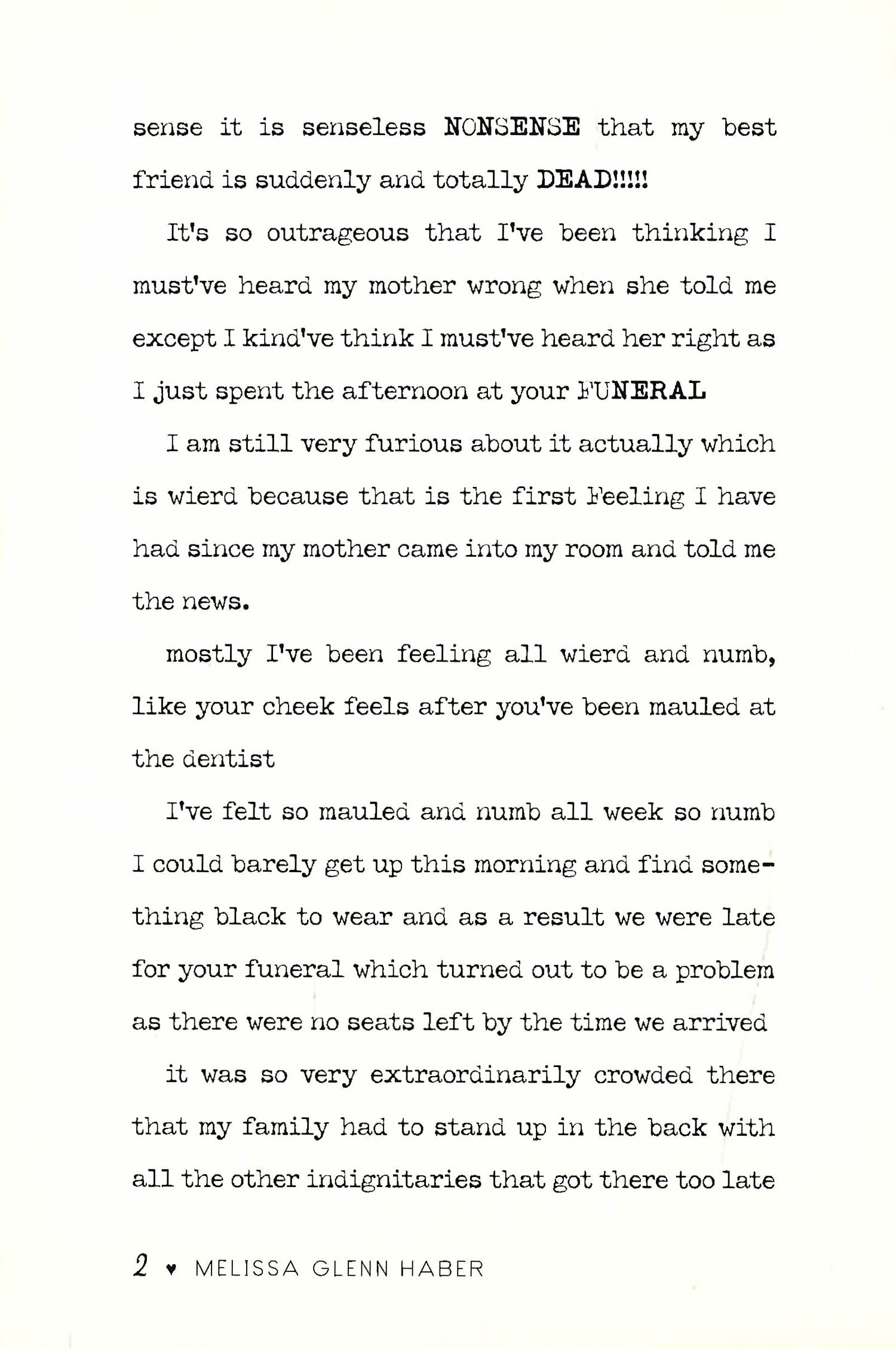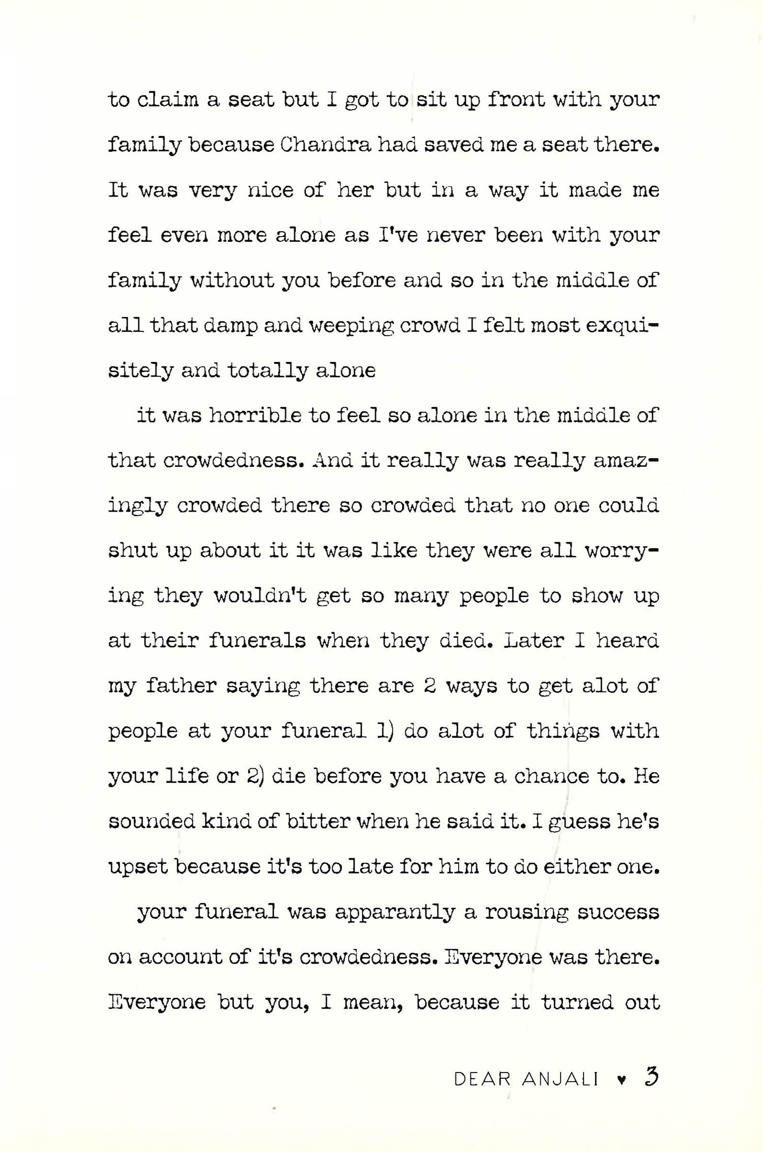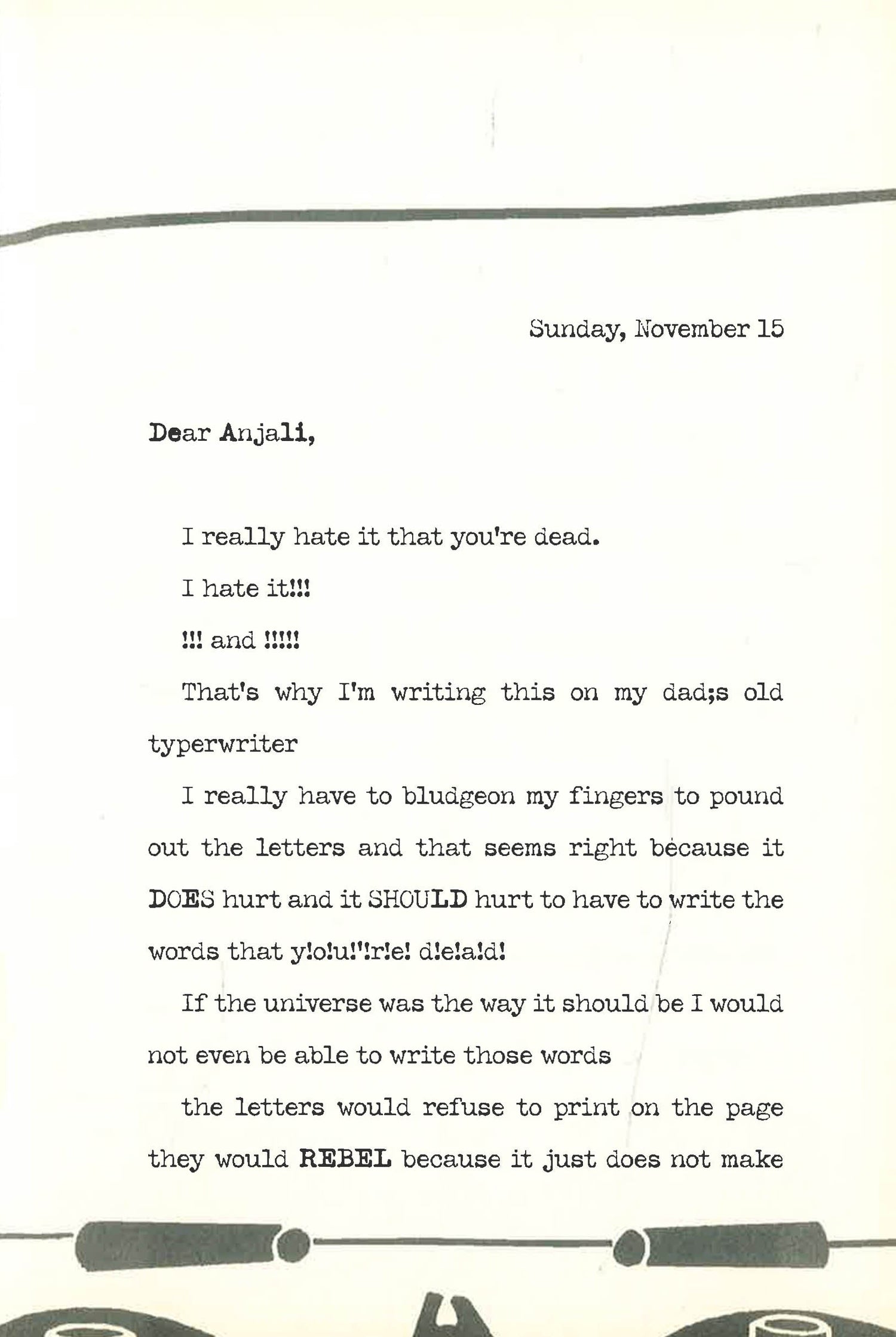 Twelve-year-old Meredith's world is rocked when her best friend Anjali dies from a sudden viral infection. In letters to Anjali, Meredith puzzles through how to cope with the ongoing challenges of school and regular life - without Anjali by her side. Complicating matters is the new friendship Meredith develops with Noah, the object of a crush she and Anjali once shared. Meredith's connection with Noah leads first to guilt as the two grow closer...and ultimately to revelations that could shatter every memory Meredith holds dear regarding her lost friend.