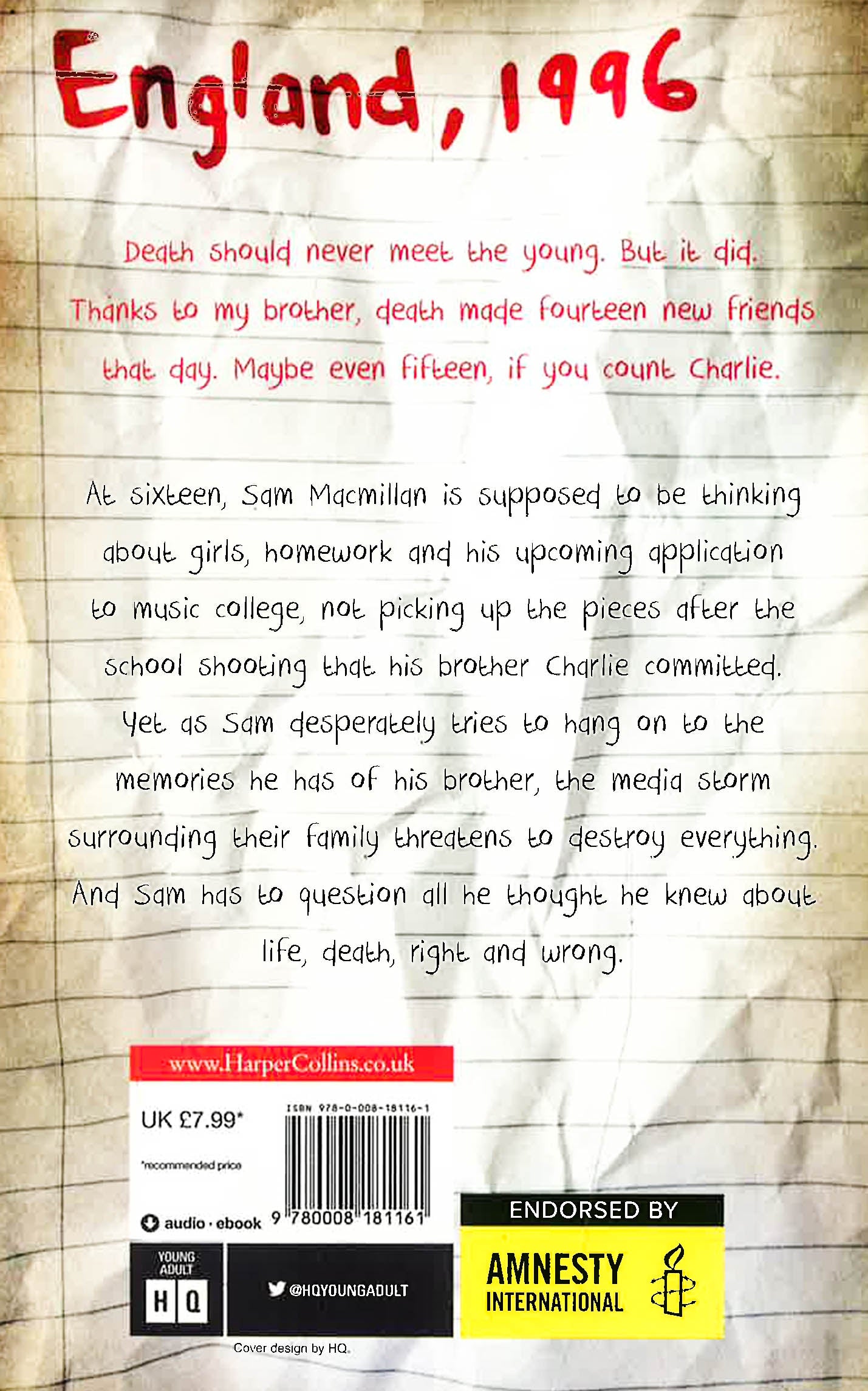 'Death should never meet the young. But it did. Thanks to my brother, death made fourteen new friends that day. Maybe even fifteen, if you count Charlie.' At sixteen, Sam Macmillan is supposed to be thinking about girls, homework and his upcoming application to music college, not picking up the pieces after the school shooting that his brother Charlie committed. Yet as Sam desperately tries to hang on to the memories he has of his brother, the media storm surrounding their family threatens to destroy everything. And Sam has to question all he thought he knew about life and death, right and wrong. Endorsed by Amnesty International UK for reminding us that human rights belong to all of us.