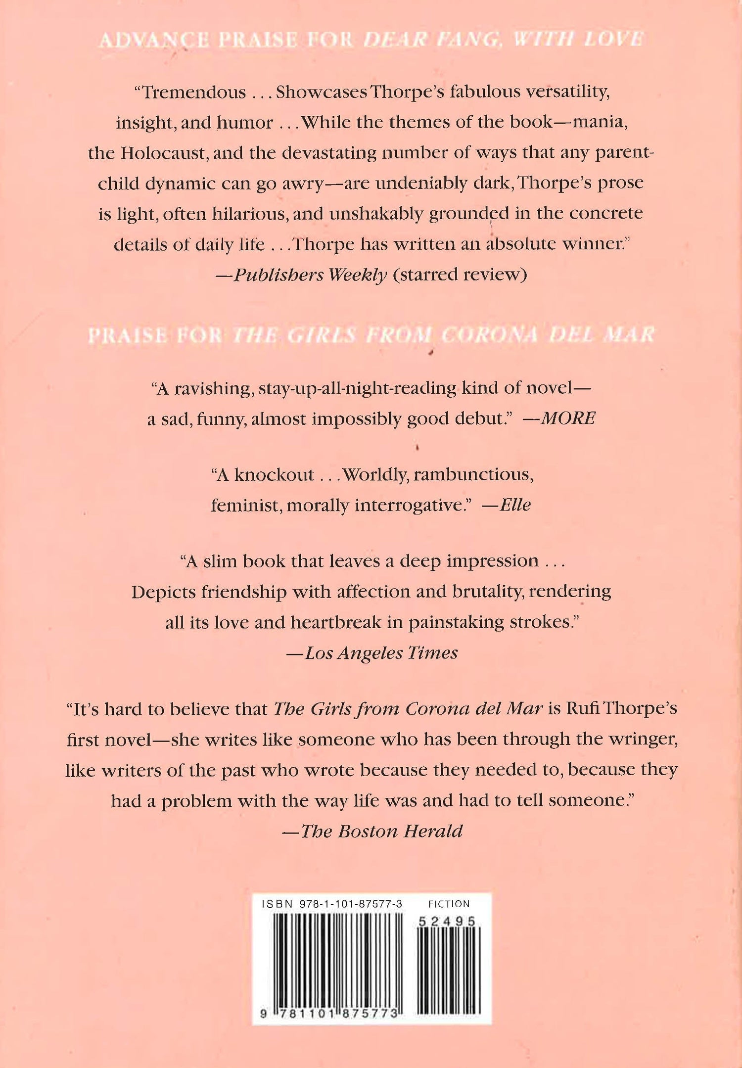 A bold, spellbinding novel featuring one of the most fascinating protagonists in recent memory, Dear Fang, With Love tells the story of seventeen-year-old Vera--ravishing, troubled, wildly intelligent--who travels to Europe with her estranged father, hoping that an immersion in history might help them forget his past mistakes and her uncertain future. Lucas and Katya were boarding school seniors when, blindingly in love, they decided to have a baby. Seventeen years later, after a decade of absence, Lucas is a weekend dad, newly involved in his daughter Vera's life. But after Vera suffers a terrifying psychotic break at a high school party, Lucas takes her to Lithuania, his grandmother's homeland, for the summer. Here, in the city of Vilnius, Lucas hopes to save Vera from the sorrow of her diagnosis. As he uncovers a secret about his grandmother, a Home Army rebel who escaped Stutthof, Vera searches for answers of her own. Why did Lucas abandon her as a baby? What really happened the night of her breakdown? And who can she trust with the truth? Skillfully weaving family mythology and Lithuanian history with a story of mental illness, inheritance, young love, and adventure, Rufi Thorpe has written a breathtakingly intelligent, emotionally enthralling book.
