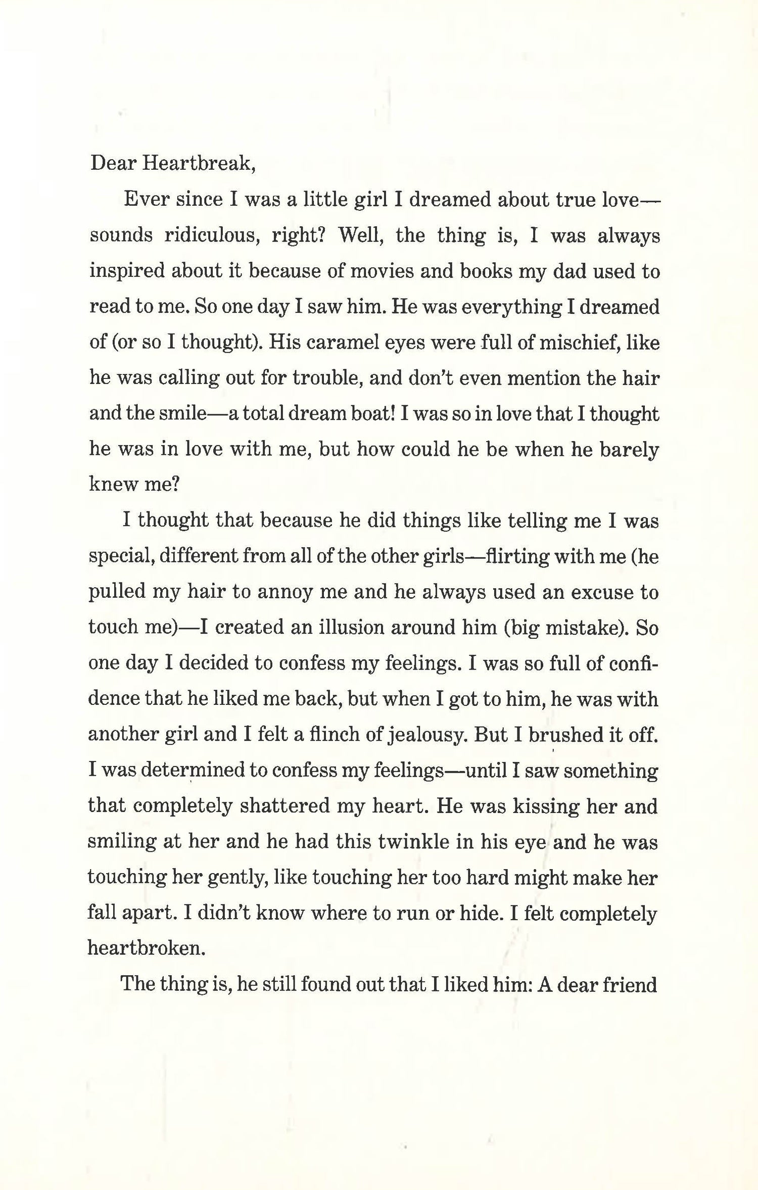 In this powerful collection, well-known YA authors answer real letters from teens all over the world about the dark side of love: dating violence, break-ups, cheating, betrayals, and loneliness. This book contains a no-holds-barred, raw outpouring of the wisdom these authors have culled from mining their own hearts for the fiction they write. Their responses are autobiographical, unflinching, and filled with love and hope for the anonymous teen writers.