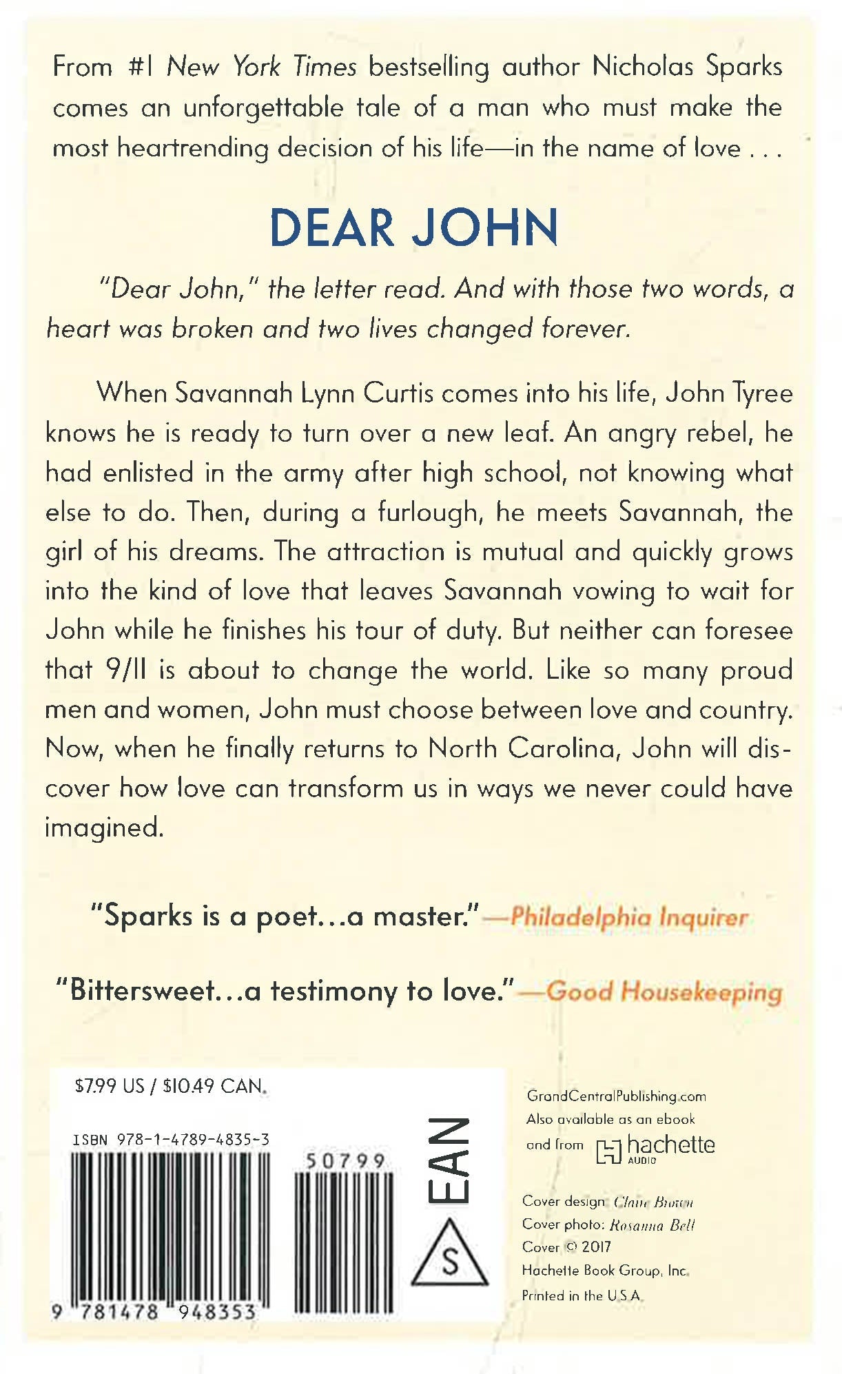 John feels it is his duty to re-enlist. And sadly, the long separation finds Savannah falling in love with someone else. "Dear John," the letter read...and with those two words, a heart was broken and two lives were changed forever. Returning home, John must come to grips with the fact that Savannah, now married, is still his true love--and face the hardest decision of his life.