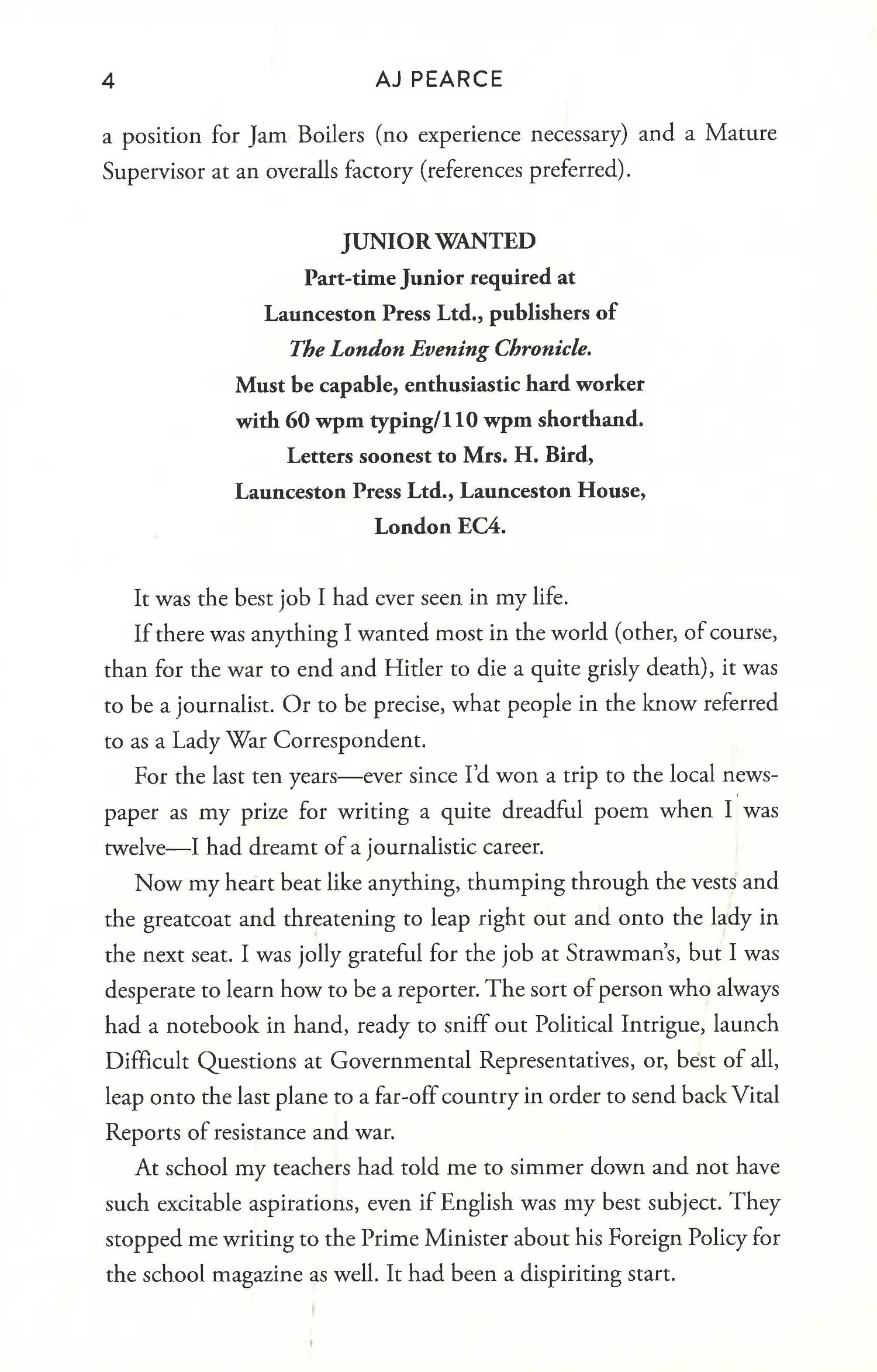 Emmeline Lake and her best friend Bunty are doing their bit for the war effort and trying to stay cheerful, despite the German planes making their nightly raids. Emmy dreams of becoming a Lady War Correspondent, and when she spots a job advertisement in the newspaper she seizes her chance; but after a rather unfortunate misunderstanding, she finds herself typing letters for the formidable Henrietta Bird, renowned advice columnist of Woman’s Friend magazine.