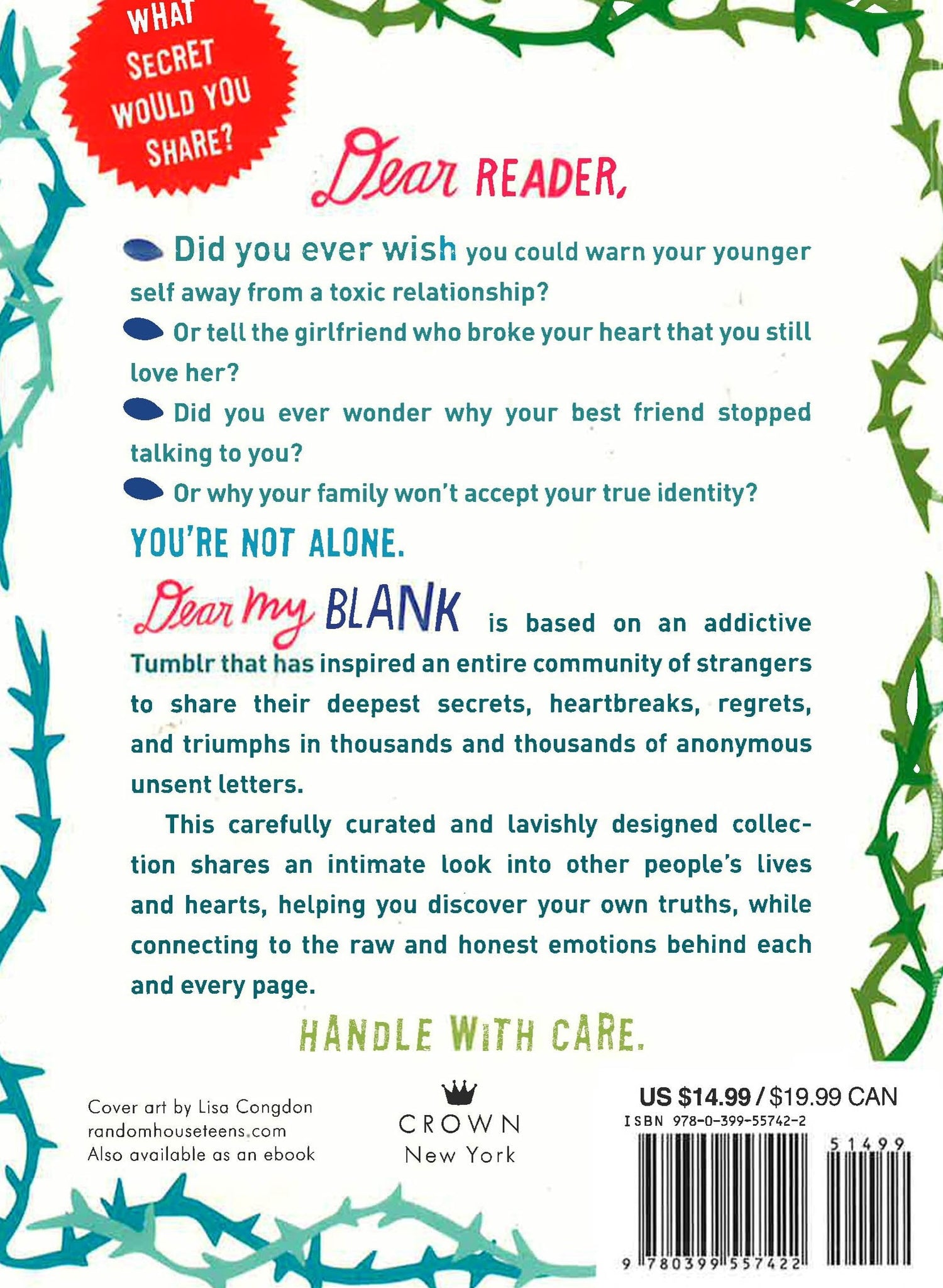 From the popular Tumblr of the same name comes a collection of heart-warming, tear-jerking, and gut-wrenching anonymous letters that people never intended--or didn't have the courage--to send. The Tumblr Dear My Blank--created by 16-year-old Emily Trunko and followed by over 35,000 people--is now a carefully curated gift book with more than 160 anonymous letters covering a range of topics from heartbreak, unrequited love, and loss, to inspiration, self-awareness, and gratitude. Featuring exclusive content not available on Tumblr, these unsent letters are addressed to secret crushes, lost loved ones, boyfriends, siblings, parents, grandparents, and many more. Art and design by Lisa Congdon enhance these messages, making the book a beautiful keepsake for all readers. "A visceral and voyeuristic offering that covers the spectrum from fleeting angst to gut-wrenching grief." --Kirkus Reviews "Stirring and soulful." --BooklistPraise for the Tumblr Dear My Blank "An addictive site full of strangers' secrets." --Cosmopolitan "A safe haven for hundreds of letters that will never be sent." --Distractify "Tumblr's newest obsession." --Hello Giggles