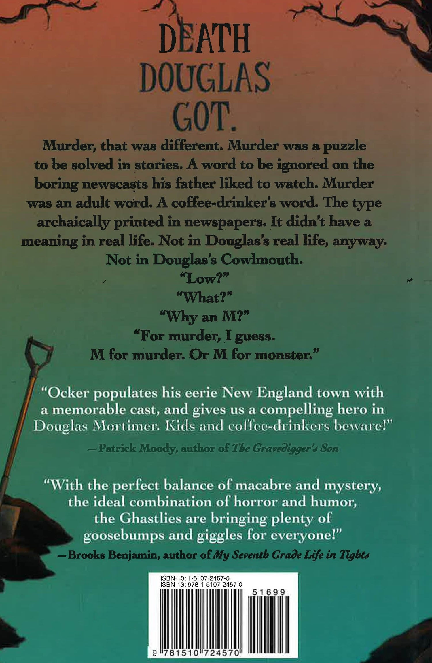 A warm and beautifully written-but also dark and macabre-middle grade novel about a boy whose family runs the local small-town funeral home. Douglas has grown up around the business of death. Generations of his family have run the Mortimer Family Funeral Home. The mortician and gravediggers are all his buddies. And the display room of caskets is an awesome place for hide and seek. It's business as usual in Douglas's small New England town. Until one day an incredibly out of the ordinary murder victim is brought to the funeral home. And more startling: others follow. On the cusp of Halloween, a serial killer has arrived. And unsatisfied with the small-town investigation, Douglas enlists his friends to help him solve the mystery. With sumptuous descriptions of a bucolic town and it's quirky people, fascinating yet middle grade-appropriate insider information about the funeral process, and a crackling mystery with a heart-pounding conclusion-Death and Douglas has something for readers young and old.