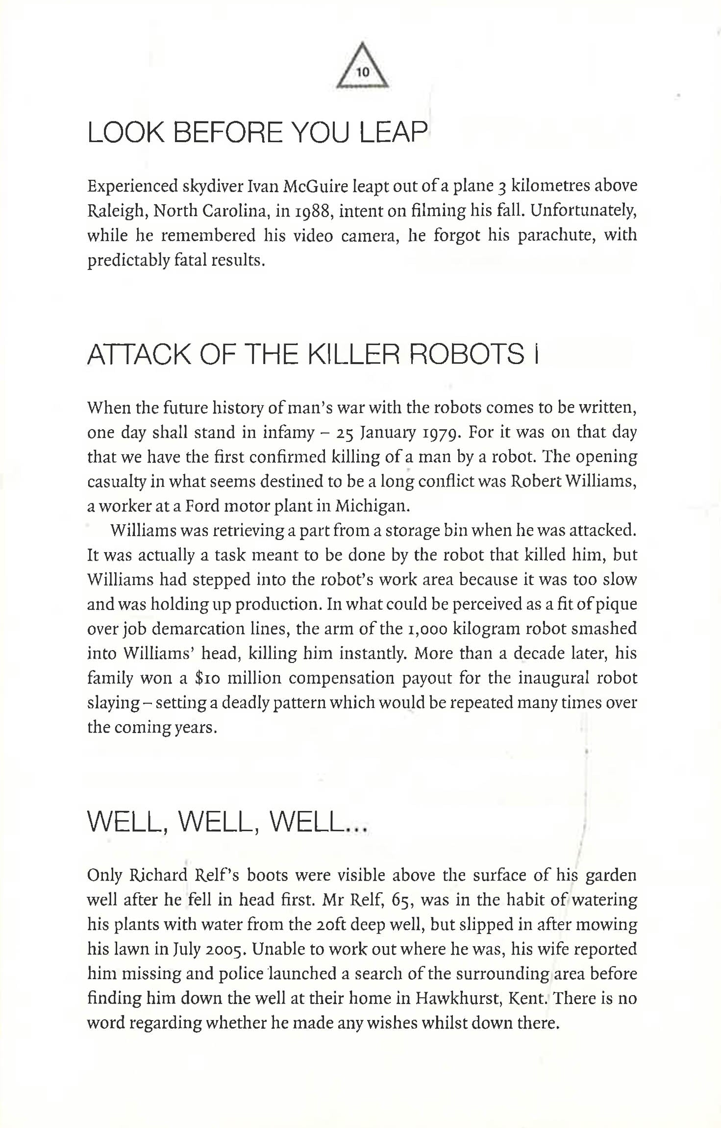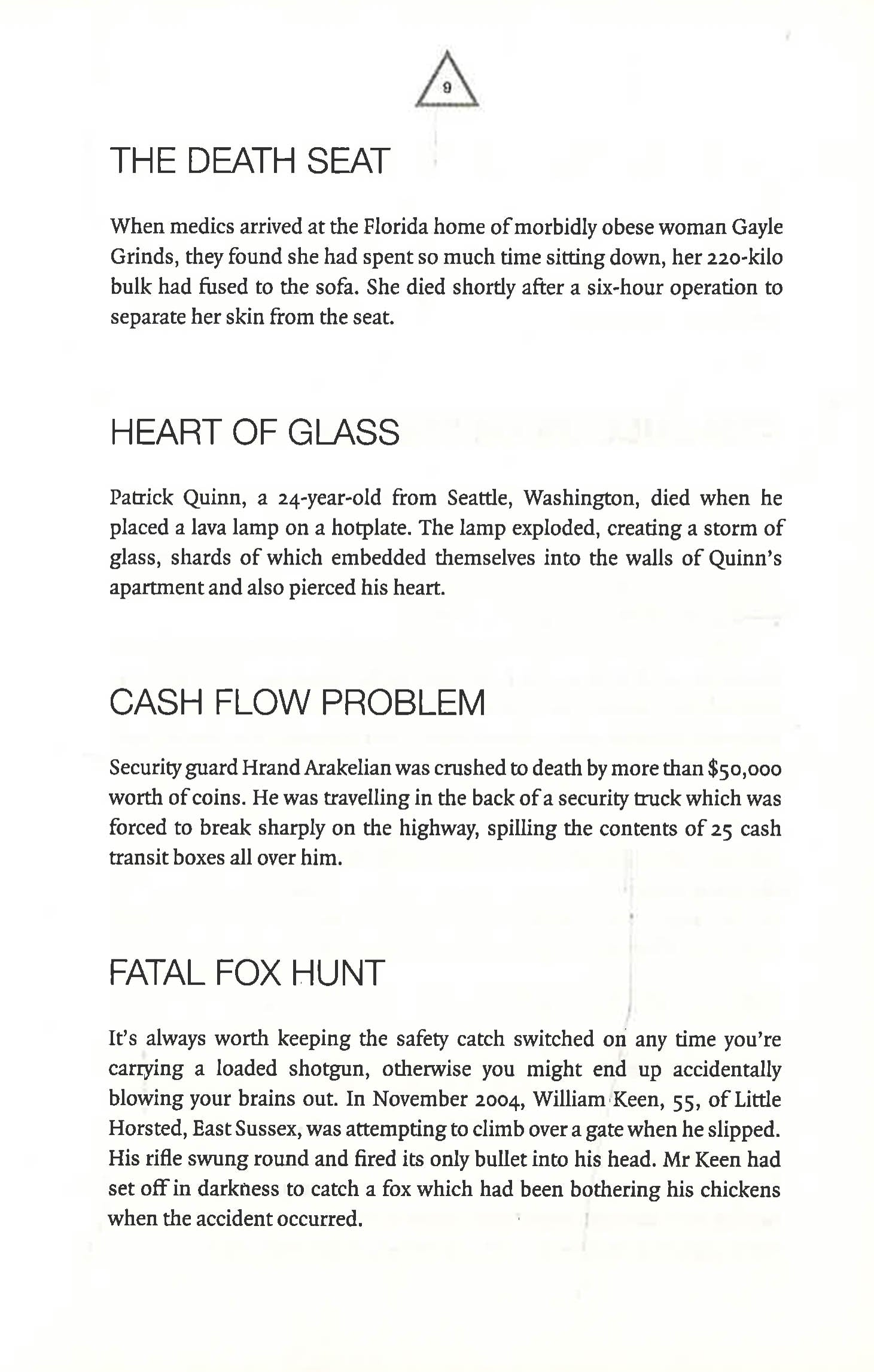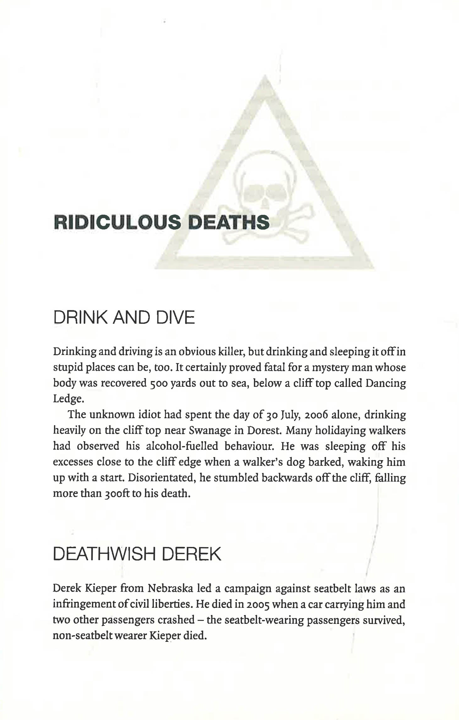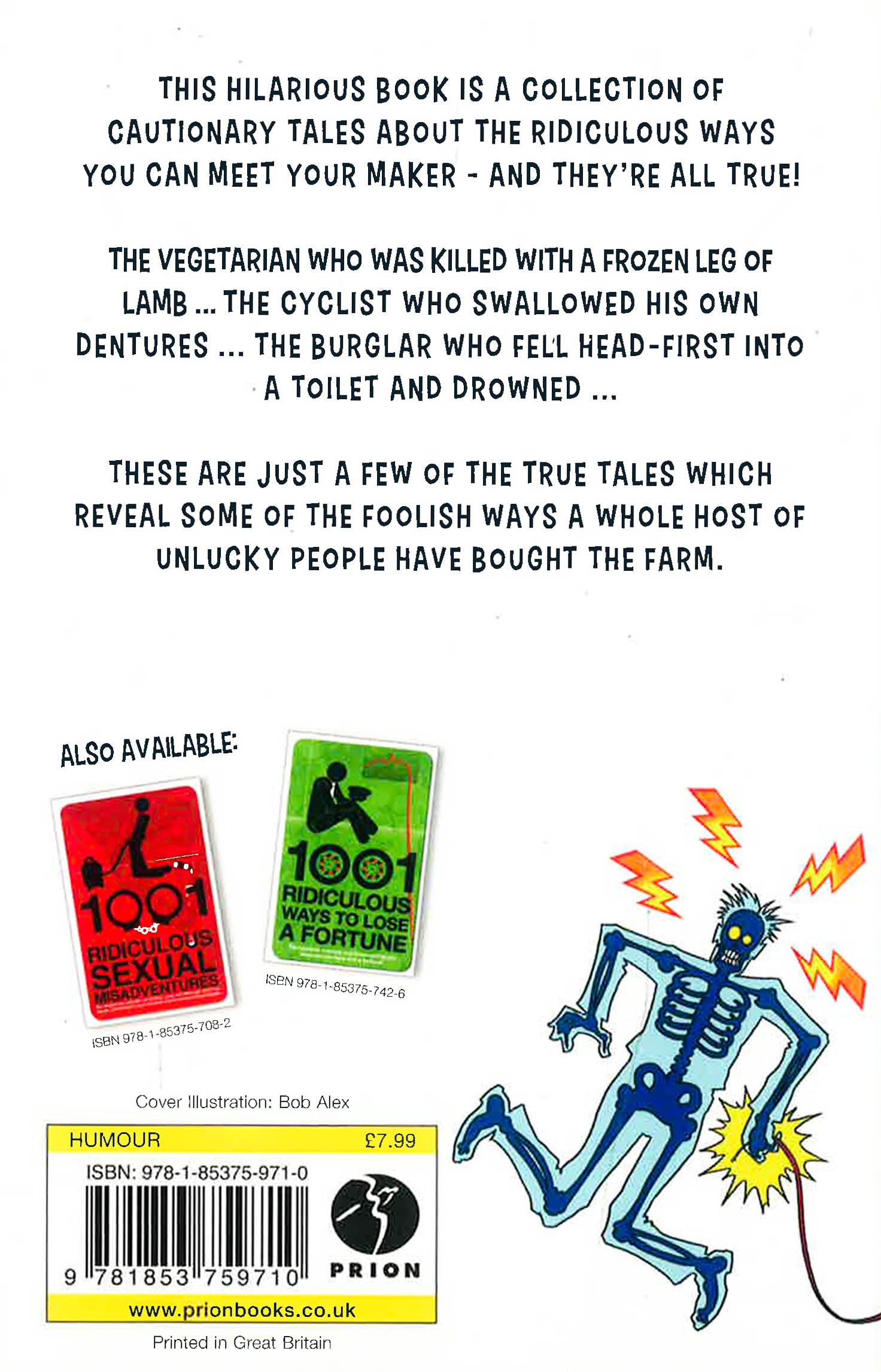 A vegetarian killed by a frozen leg of lamb. A burglar who fell headfirst into a toilet and drowned. These cautionary tales about the undignified ways you can die are ALL TRUE! Accidents happen. Luck runs out. Yes, death can strike at any time - and sometimes in the most bizarre ways. This collection chronicles hundreds of the craziest true stories the authors could verify, from the cyclist who swallowed his own dentures to the rogue who ignored warnings about overhead cables . . . and suffered a highly charged demise.