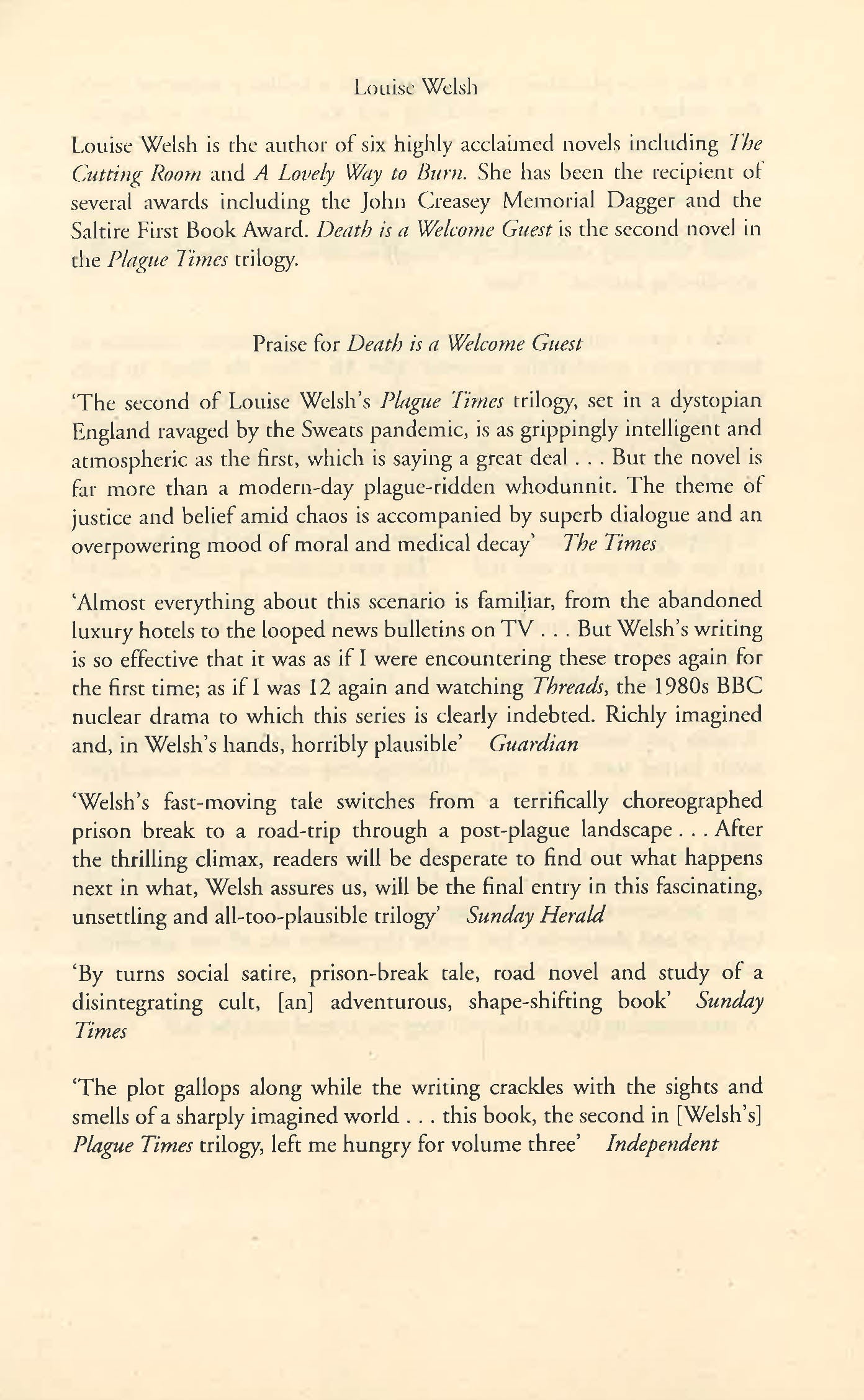 Longlisted for the Theakstons Old Peculiar Crime Novel of the Year. Magnus McFall was a comic on the brink of his big break when the world came to an end. Now, he is a man on the run and there is nothing to laugh about. Thrown into unwilling partnership with an escaped convict, Magnus flees the desolation of London to make the long journey north, clinging to his hope that the sickness has not reached his family on their remote Scottish island. He finds himself in a landscape fraught with danger, fighting for his place in a world ruled by men, like his fellow traveller Jeb - practical men who do not let pain or emotions interfere with getting the job done. This is a world with its own justice, and new rules. Where people, guns and food are currency. Where survival is everything. Death is a Welcome Guest defies you to put it down, and leaves you with questions that linger in the mind long after you read the last page.