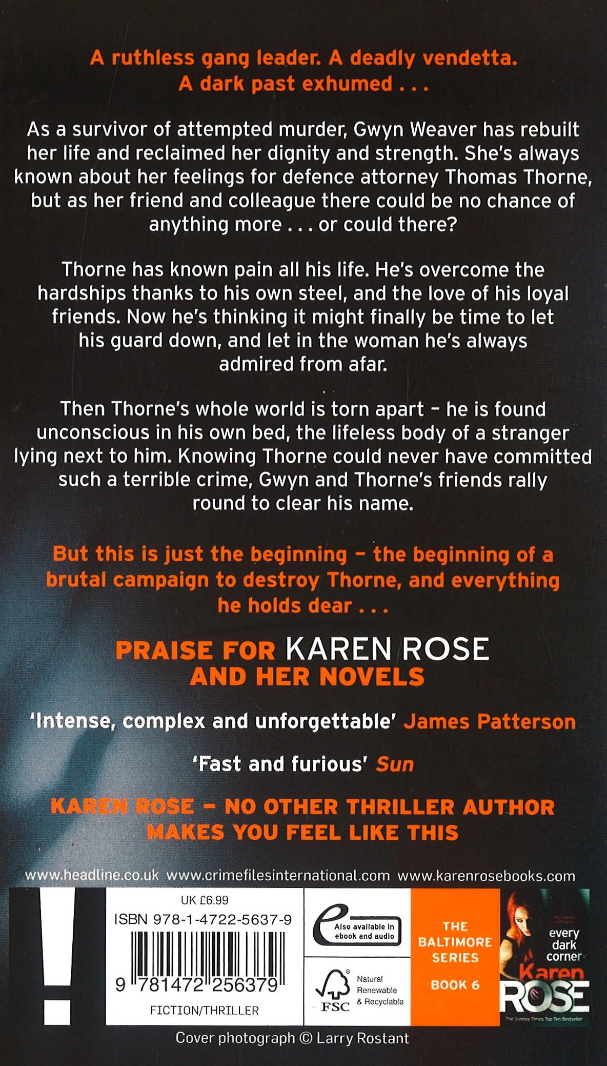 A ruthless gang leader. A deadly vendetta. A dark past exhumed... KAREN ROSE returns with the break-neck follow-up to MONSTER IN THE CLOSET, and the sixth book in the heart-pounding Baltimore Series.Gwyn Weaver is as resilient as anyone could be. Having survived an attempted murder, she has rebuilt her life and reclaimed her dignity and strength. She's always known about her feelings for defence attorney Thomas Thorne, but as her friend and a colleague there could be no chance of anything more... or could there?Thorne has known violence and pain all his life. He's overcome the hardships thanks to his own steel, and the love of his loyal friends. Now he's thinking it might finally be time to let his guard down, and allow himself to let in the woman he's always admired from afar.Then Thorne's whole world is torn apart - he is found unconscious in his own bed, the lifeless body of a stranger lying next to him, her blood on his hands. Knowing Thorne could never have committed such a terrible crime, Gwyn and his friends rally round to clear his name.But this is just the beginning - the beginning of a brutal campaign to destroy Thorne, and everything he holds dear...Intense, complex and unforgettable - James PattersonFast and furious - SunA high-octane thrill ride - Lisa Jackson