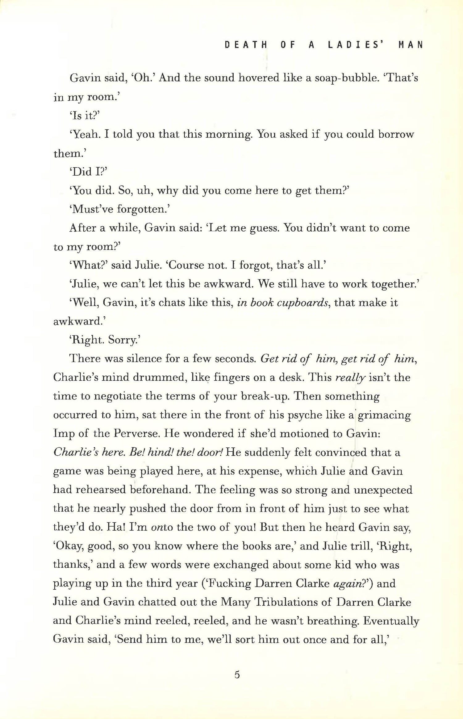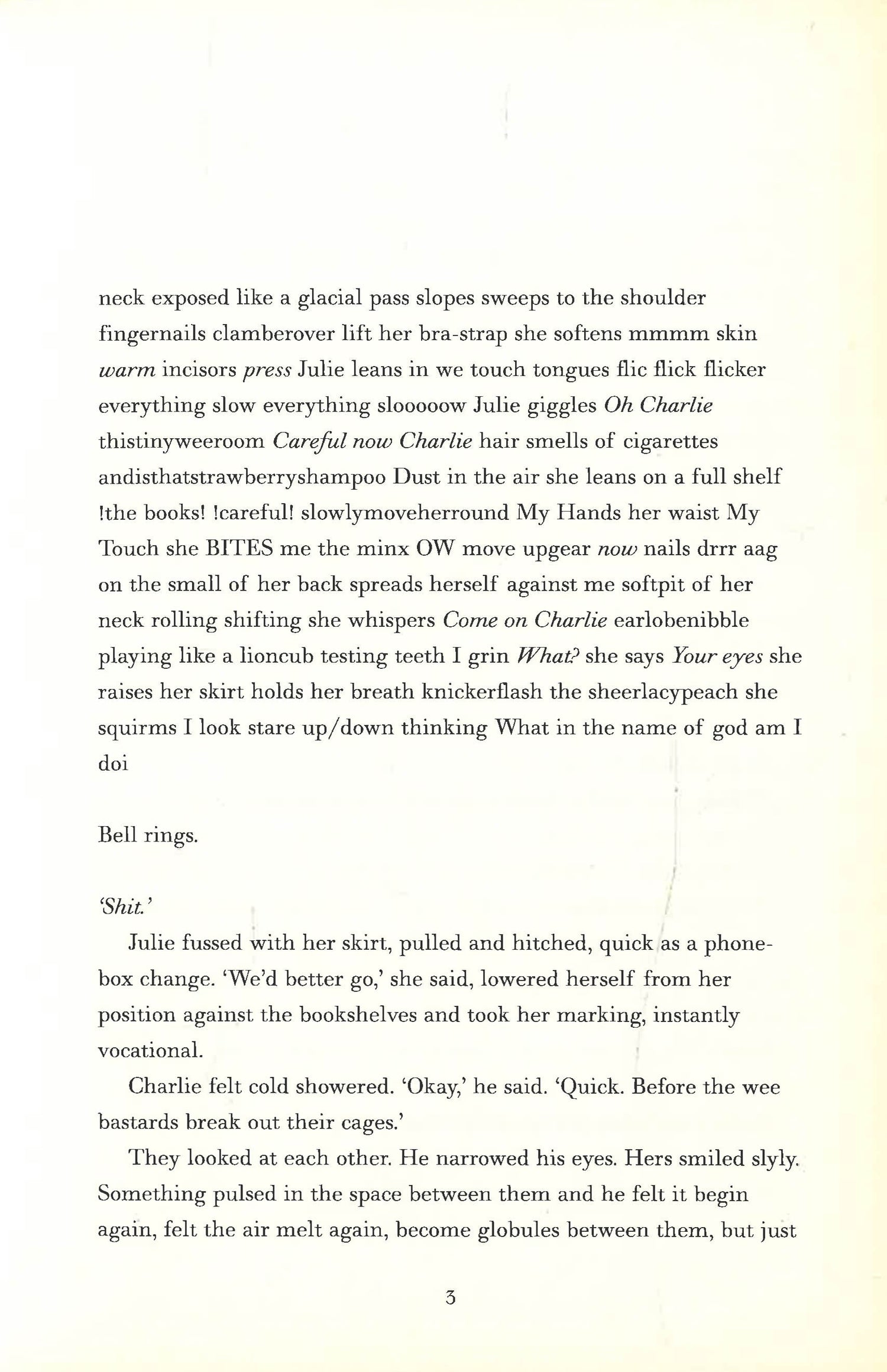 Charlie is in self-destruct mode. Except he hasn't realised it yet. On the surface, Charlie is a young professional man going about his life, enjoying himself. He teaches, he has friends, lovers, a family. His divorce has gone through, his job inspires him, he's looking after his mum and trying to make her better, he loves his baby niece. But he is damaged goods, spiraling hedonistically out of control, and it seems that his new-found freedom is about to become his downfall, alienating everyone he knows.