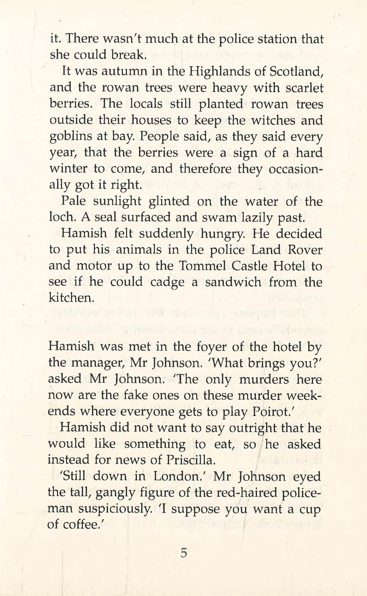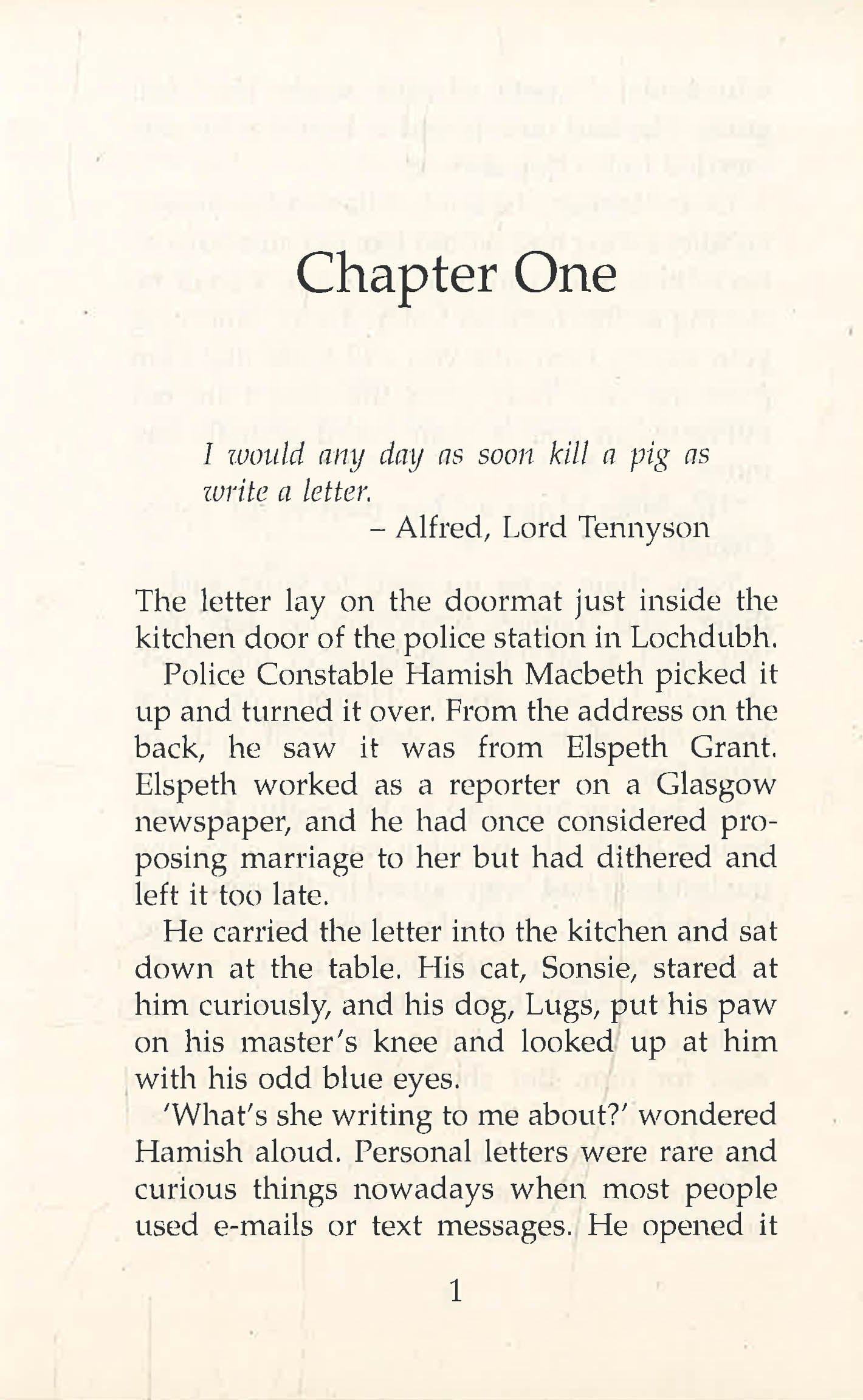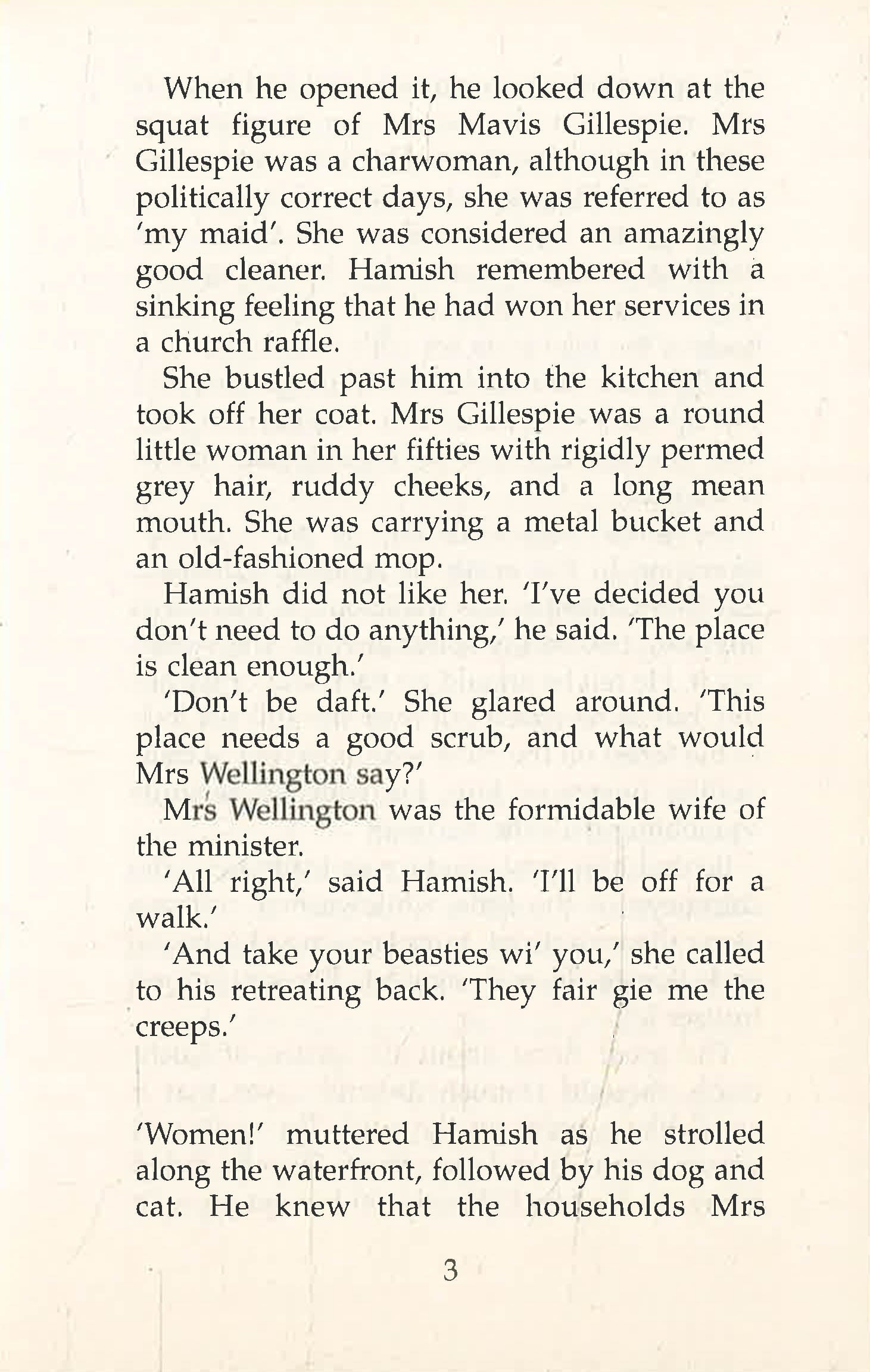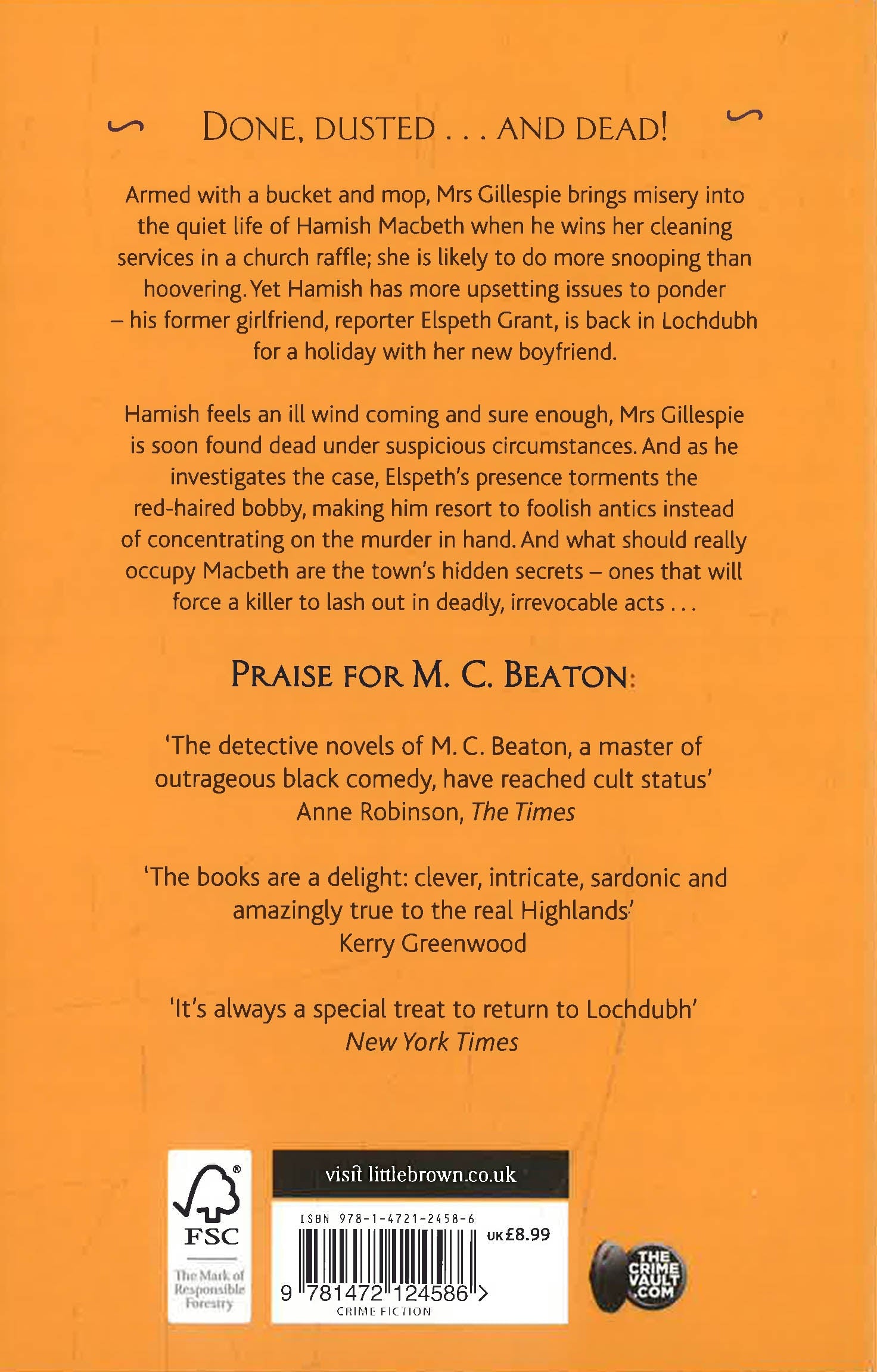 Armed with a bucket and mop, Mrs Gillespie brings misery into the quiet life of Hamish Macbeth when he wins her cleaning services in a church raffle; she is likely to do more snooping than hoovering. Yet Hamish has more upsetting issues to ponder - his former girlfriend, reporter Elspeth Grant, is back in Lochdubh for a holiday with her new boyfriend.