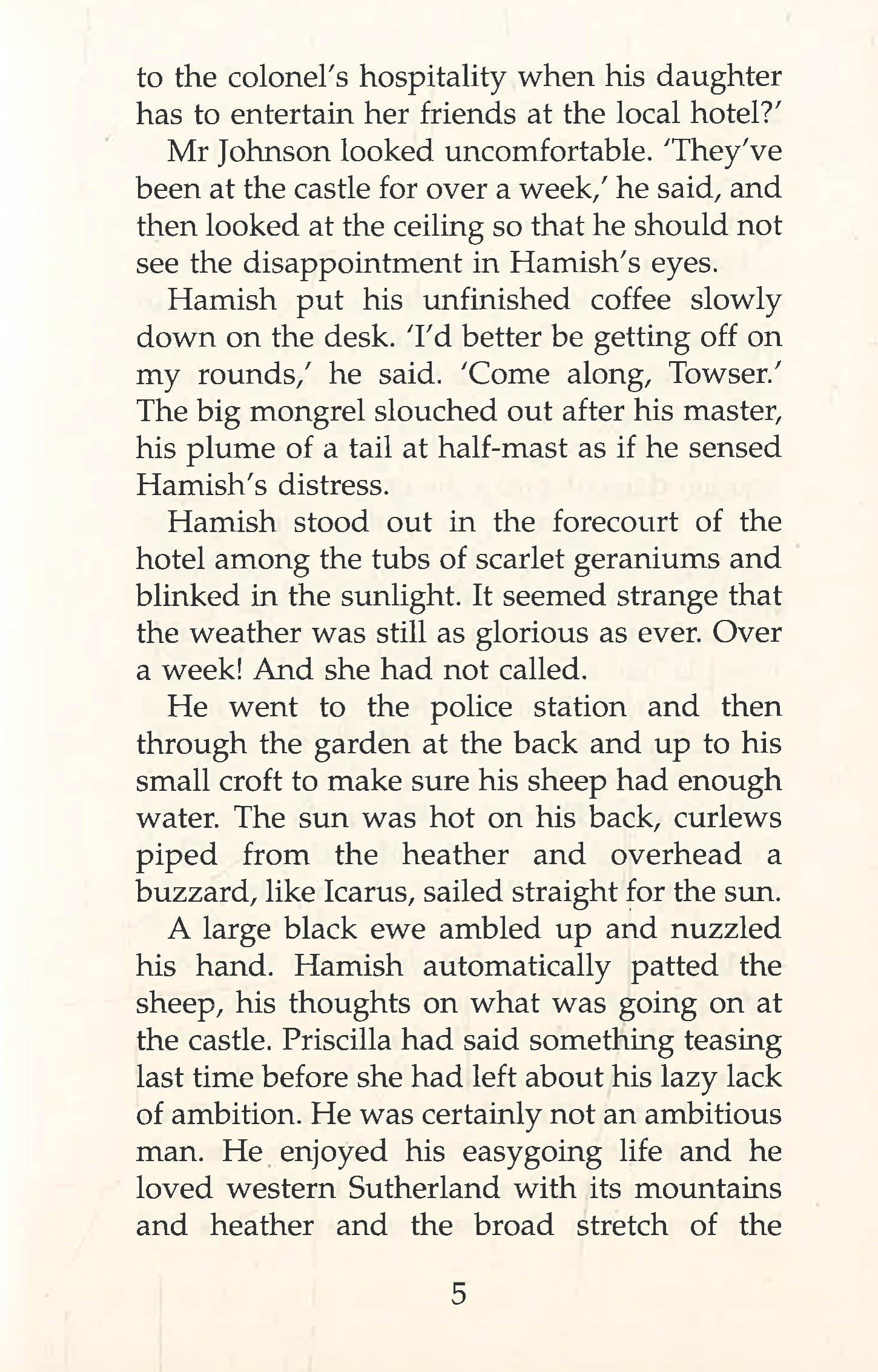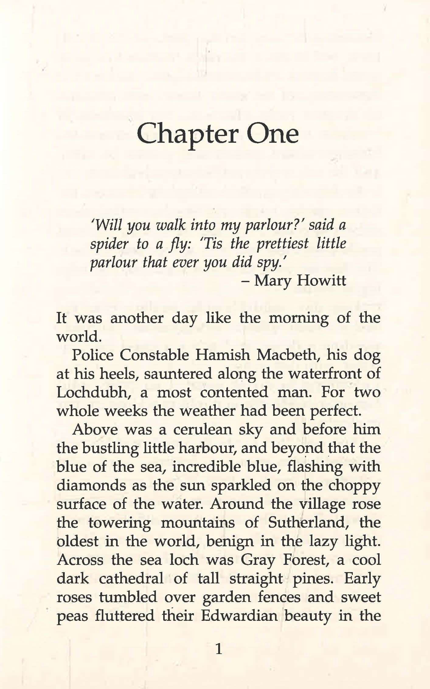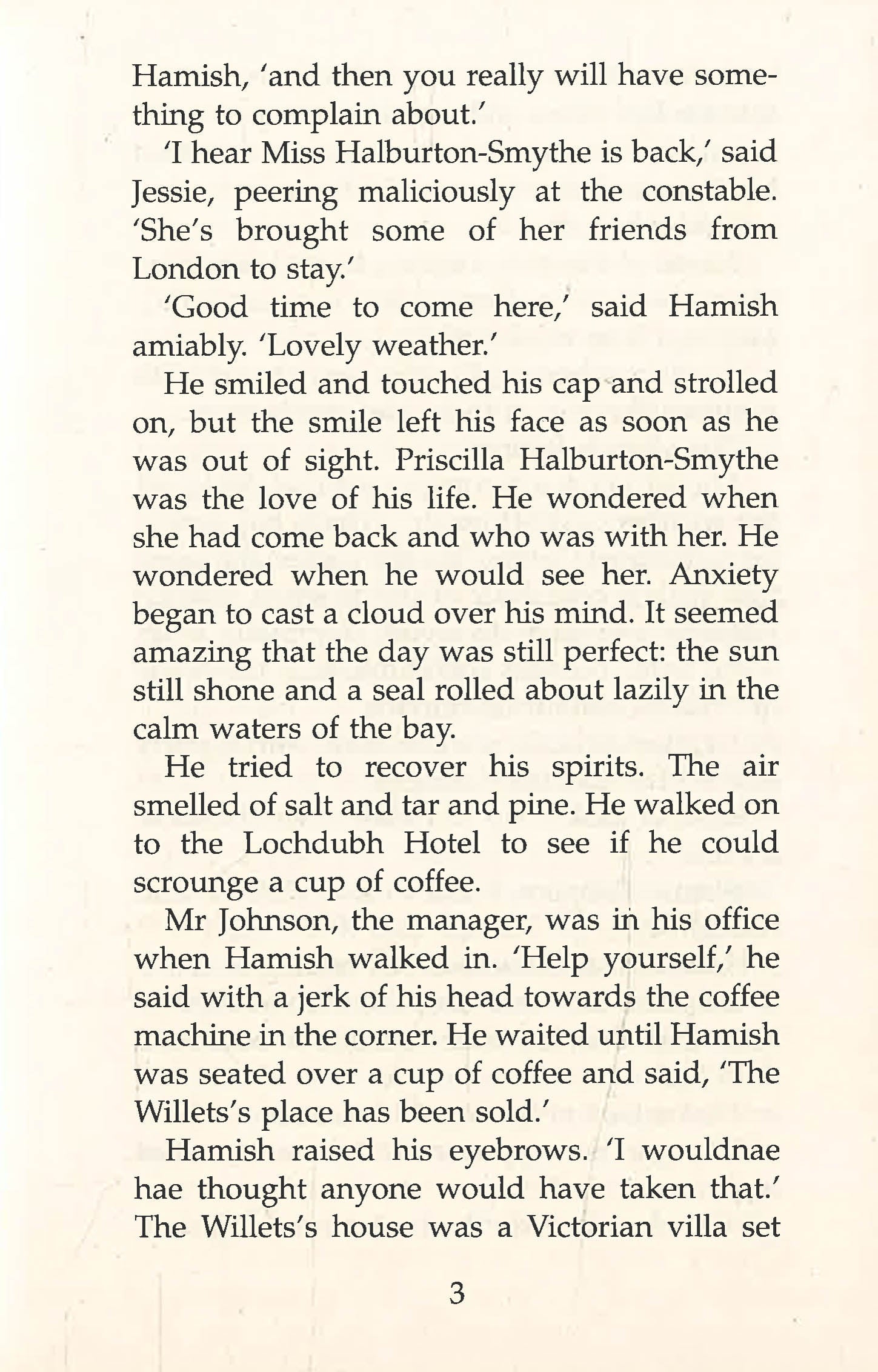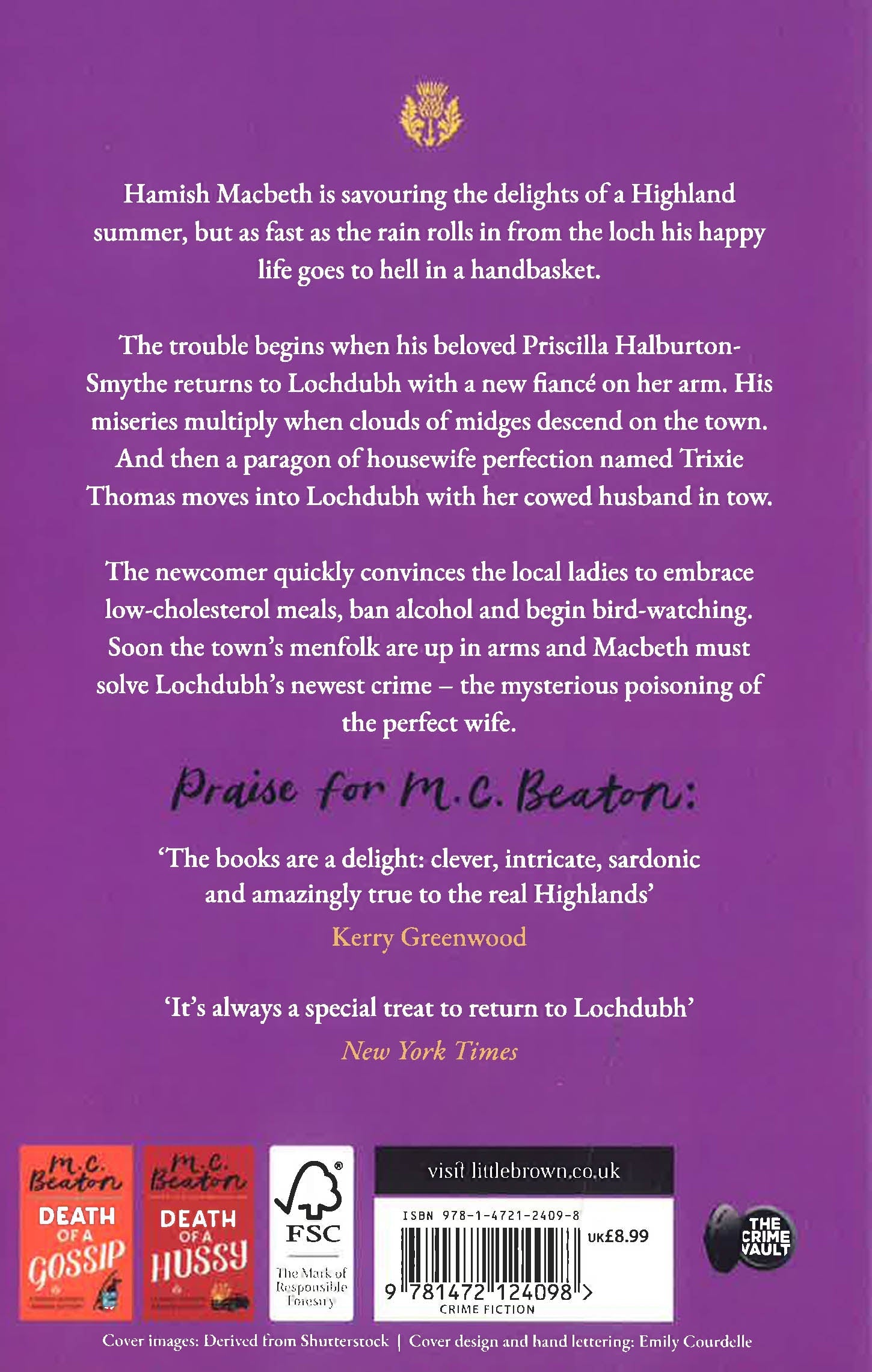 The trouble begins when his beloved Priscilla Halburton-Smythe returns to Lochdubh with a new fiance on her arm. His miseries multiply when clouds of midges descend on the town. And then a paragon of housewife perfection named Trixie Thomas moves into Lochdubh with her cowed husband in tow.