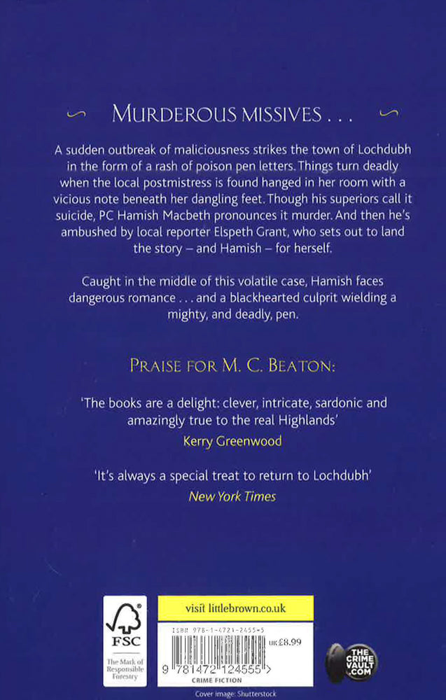 The 19th Hamish Macbeth murder mystery delightfully re-jacketed.A sudden outbreak of maliciousness strikes the town of Lochdubh in the form of a rash of poison pen letters. Things turn deadly when the local postmistress is found hanged in her room... with a vicious note beneath her dangling feet. Though his superiors call it suicide, PC Hamish Macbeth pronounces it murder. But Hamish is soon distracted by Jenny Ogilvie, a friend of his ex-fiancee, who arrives in Lochdubh to seduce him. And then he's ambushed by local reporter Elspeth Grant, who sets out to land the story - and Hamish - for herself.Caught in the middle of this volatile case, Hamish faces dangerous romances... and a blackhearted culprit wielding a mighty - and lethal - pen.Praise for the Hamish Macbeth series:The much-loved Hamish Macbeth series. beguiling blend of wry humour and sharp observations about rural life. - Good Book Guide.It's always a special treat to return to Lochdubh. - New York Times Book Review.The detective novels of M C Beaton, a master of o.utrageous black comedy, have reached cult status. - Anne Robinson, The Times