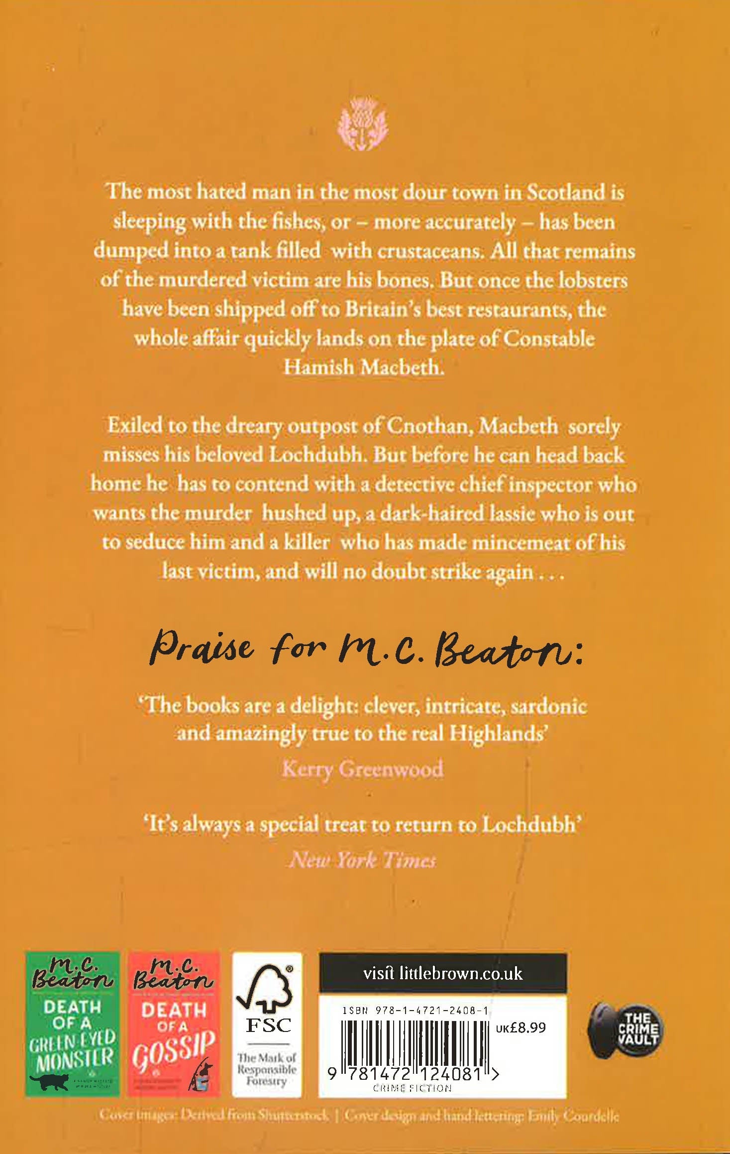The most hated man in the most dour town in Scotland is sleeping with the fishes, or - more accurately - has been dumped into a tank filled with crustaceans. All that remains of the murdered victim are his bones. But once the lobsters have been shipped off to Britain's best restaurants, the whole affair quickly lands on the plate of Constable Hamish Macbeth. Exiled to the dreary outpost of Cnothan, Macbeth sorely misses his beloved Lochdubh, but before he can head back home he has to contend with a detective chief inspector who wants the murder hushed up, a dark-haired lassie who is out to seduce him, and a killer who has made mincemeat of his last victim, and will no doubt strike again ...