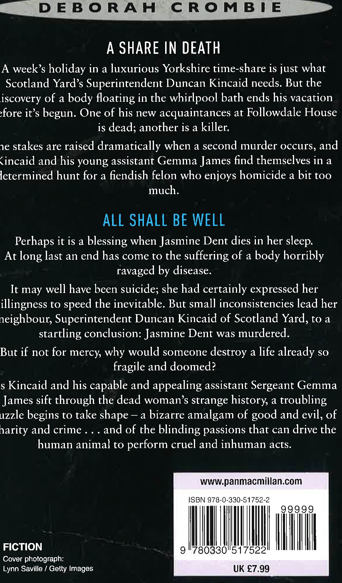 Two books in one volume. A SHARE IN DEATH: A week's holiday in a luxurious Yorkshire time-share is just what Scotland Yard's Superintendent Duncan Kincaid needs. But the discovery of a body floating in the whirlpool bath ends his vacation before it's begun. One of his new acquaintances at Followdale House is dead; another is a killer. The stakes are raised dramatically when a second murder occurs, and Kincaid and his young assistant Gemma James find themselves in a determined hunt for a fiendish felon who enjoys homicide a bit too much. ALL SHALL BE WELL: Perhaps it is a blessing when Jasmine Dent dies in her sleep. At long last an end has come to the suffering of a body horribly ravaged by disease. It may well have been suicide; she had certainly expressed her willingness to speed the inevitable. But small inconsistencies lead her neighbour, Superintendent Duncan Kincaid of Scotland Yard, to a startling conclusion: Jasmine Dent was murdered. But if not for mercy, why would someone destroy a life already so fragile and doomed? As Kincaid and his capable and appealing assistant Sergeant Gemma James sift through the dead woman's strange history, a troubling puzzle begins to take shape - a bizarre amalgam of good and evil, of charity and crime . . . and of the blinding passions that can drive the human animal to perform cruel and inhuman acts.