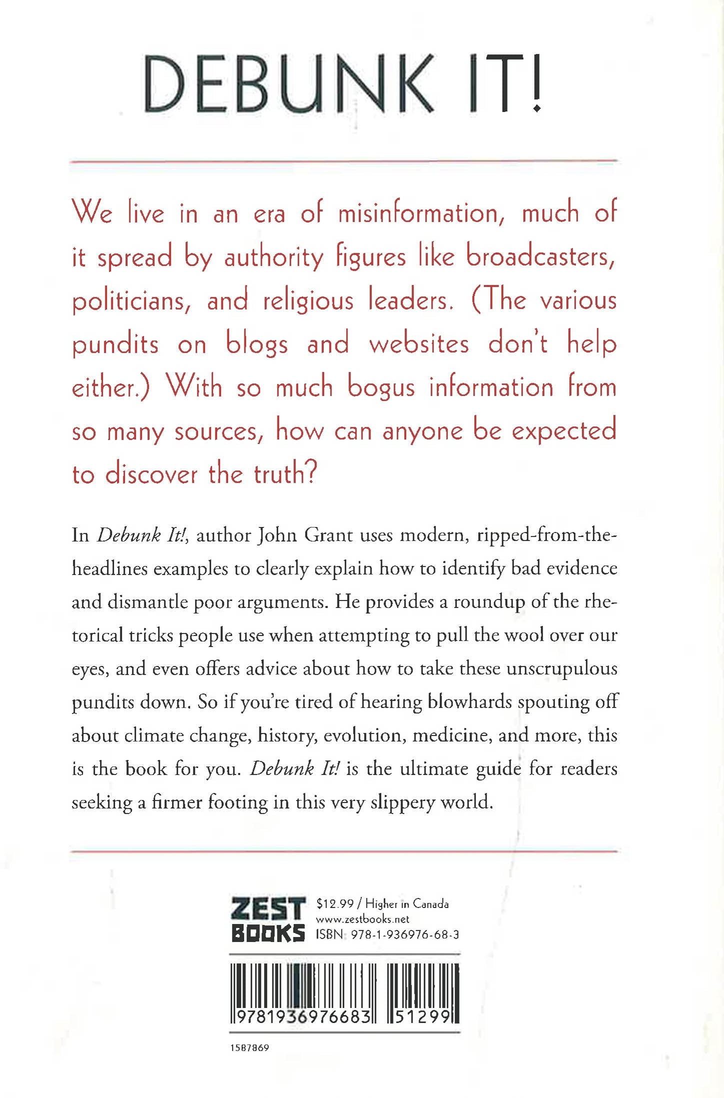 We live in an era of misinformation, much of it spread by authority figures, including politicians, religious leaders, broadcasters, and, of course, apps and websites. With so much bogus information coming from so many sources, how can anyone be expected to discover the truth? In Debunk It, author John Grant uses modern, ripped-from-the-headlines examples to clearly explain how to identify bad evidence and poor arguments. He provides a roundup of the rhetorical tricks people use when attempting to pull the wool over our eyes, and even offers advice about how to take these unscrupulous pundits down. So if you're tired of hearing blowhards spouting off about climate change, history, evolution, medicine, and more, this is the book for you. Debunk It is the ultimate guide for young readers seeking a firmer footing in a world that's full of holes.