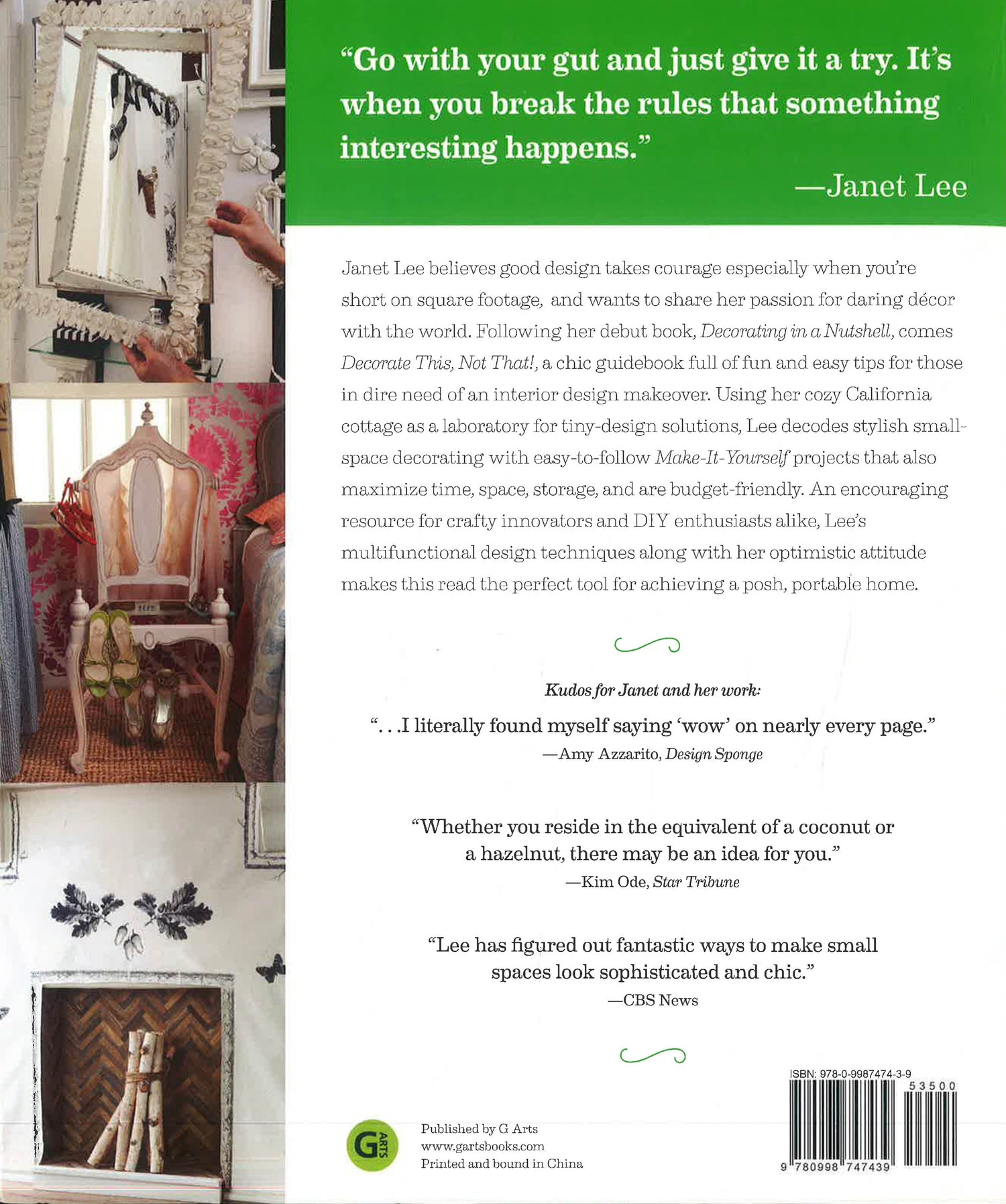 What? A DIY valet chair that artfully corrals coats, heels, and handbags in a compact 12 square inches? Rubber garage tiles-to-go that bring sexy back to a tired old kitchen floor in one click? A folding herringbone fireplace liner designed à la Popsicle® sticks? Decorate This, Not That! picks up where author Janet Lee's debut book, Decorating in a Nutshell, leaves off, as the quintessential modern, chic, budget-friendly guide to decorating and living posh, portable, and proud in pint-sized spaces. Chock full of inventive, noncommittal space-alluding décor and multifunctional storage ideas that won't hurt walls or windows , Decorate This, Not That! is in a style league of its own.