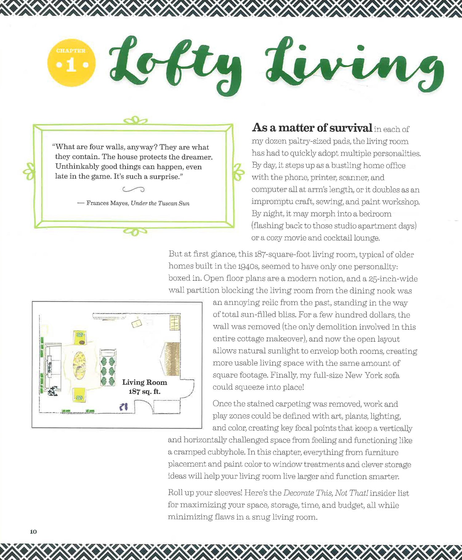A former Oprah Show producer, Lee has all the tips necessary to create an exceptional environment on a budget of time, space, and finance. She also knows how not to lose control of achieving the perfect small-space environment, and steers readers clear of these pitfalls. Assuming that small spaces will be either vertically or horizontally challenged, Lee has an abundance of plans for how to maximize space, storage, time and budget for every room. Decorate This, Not That! decodes small-space decorating into easy to digest snack-size bites for every petite room in (or out of!) the house, including an outdoor pocket garden. Written in a peppy, clear, encouraging voice with dramatic “before” and “after” photos, and bolstered by sidebars of interactive time, money, and space-saving tips, it is impossible for the decorator not to engage and succeed. One-of-a-kind DIY lighting, storage, and décor projects are clearly illustrated with step-by-step instructions and a materials list. Each project is assigned a ranking based on the amount of prep time and budget needed for completion. A full design resource guide and a list of offbeat décor outlets is included, plus a roundup of small-space tool kit essentials and patterns of one-of-a-kind wall and paint stencils.