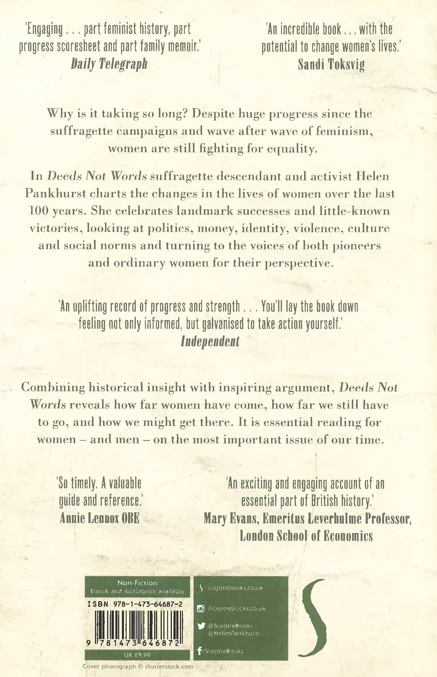 An uplifting record of progress and strength... You'll lay the book down feeling not only informed, but galvanised to take action yourself.' Independent'An incredible book . . . with the potential to change women's lives.' Sandi ToksvigWhy is it taking so long? Despite huge progress since the suffragette campaigns and wave after wave of feminism, women are still fighting for equality.Why will we have to wait until 2069 for the gender pay gap to disappear in the UK? Why, in 2015, did 11% of women lose their jobs due to pregnancy discrimination? Why has 1 in 3 women in the world experienced physical or sexual violence? 'Engaging...part feminist history, part progress scoresheet and part family memoir.' Daily TelegraphIn Deeds Not Words suffragette descendant and activist Helen Pankhurst charts the changes in the lives of women over the last 100 years. She celebrates landmark successes and little-known victories, looking at politics, money, identity, violence, culture and social norms and turning to the voices of both pioneers and ordinary women for their perspective.'An exciting and engaging account of an essential part of British history.' Mary Evans, Emeritus Leverhulme Professor, London School of EconomicsCombining historical insight with inspiring argument, Deeds not Words reveals how far women have come, how far we still have to go, and how we might get there. It is essential reading for women - and men - on the most important issue of our time.'Deeds Not Words is so timely. A valuable guide and reference.' Annie Lennox OBE