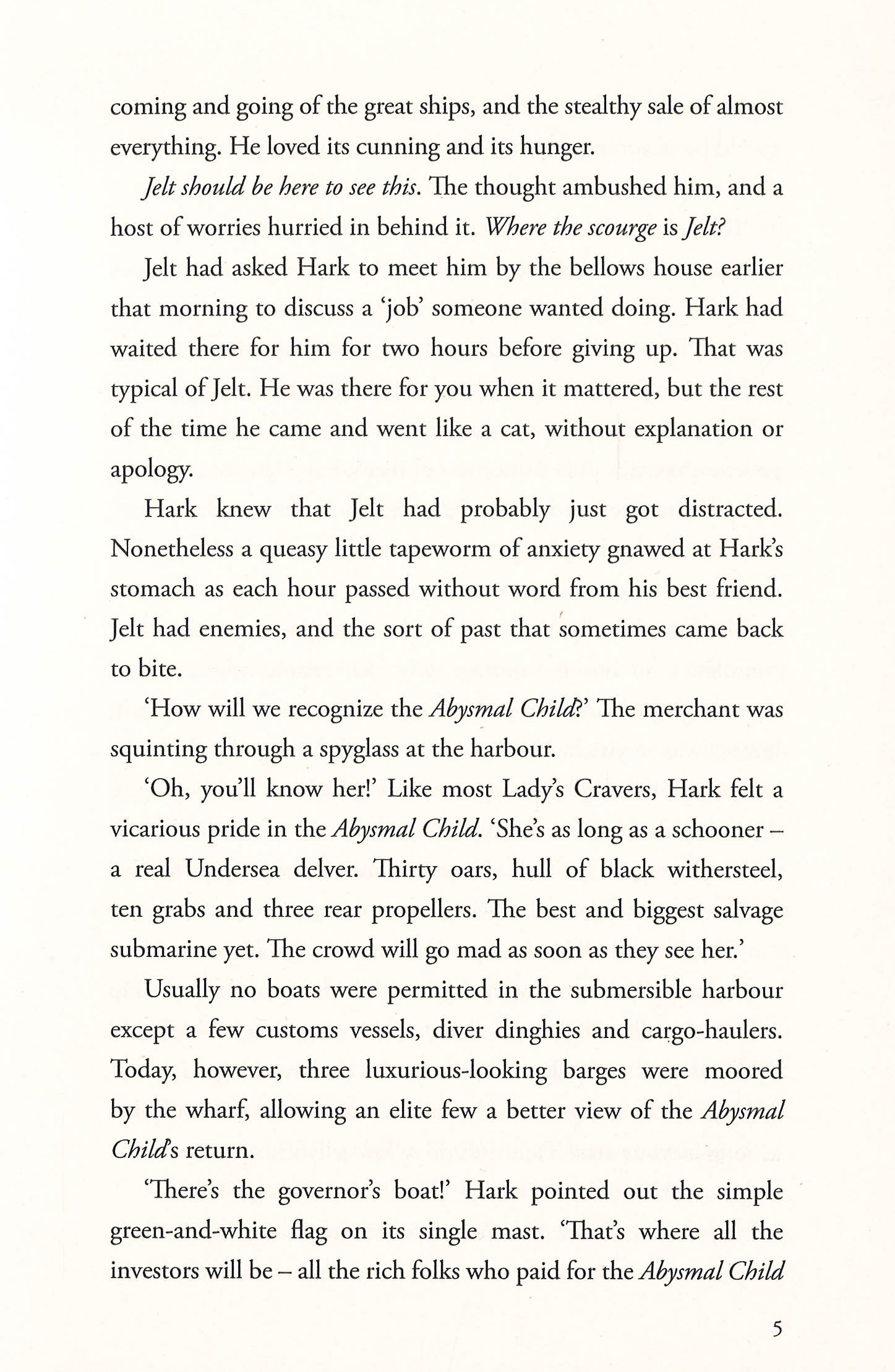 On the streets of the Island of Lady's Crave live 14-year-old urchins Hark and his best friend Jelt. They are scavengers: diving for relics of the gods, desperate for anything they can sell. But there is something dangerous in the deep waters of the undersea, calling to someone brave enough to retrieve it.