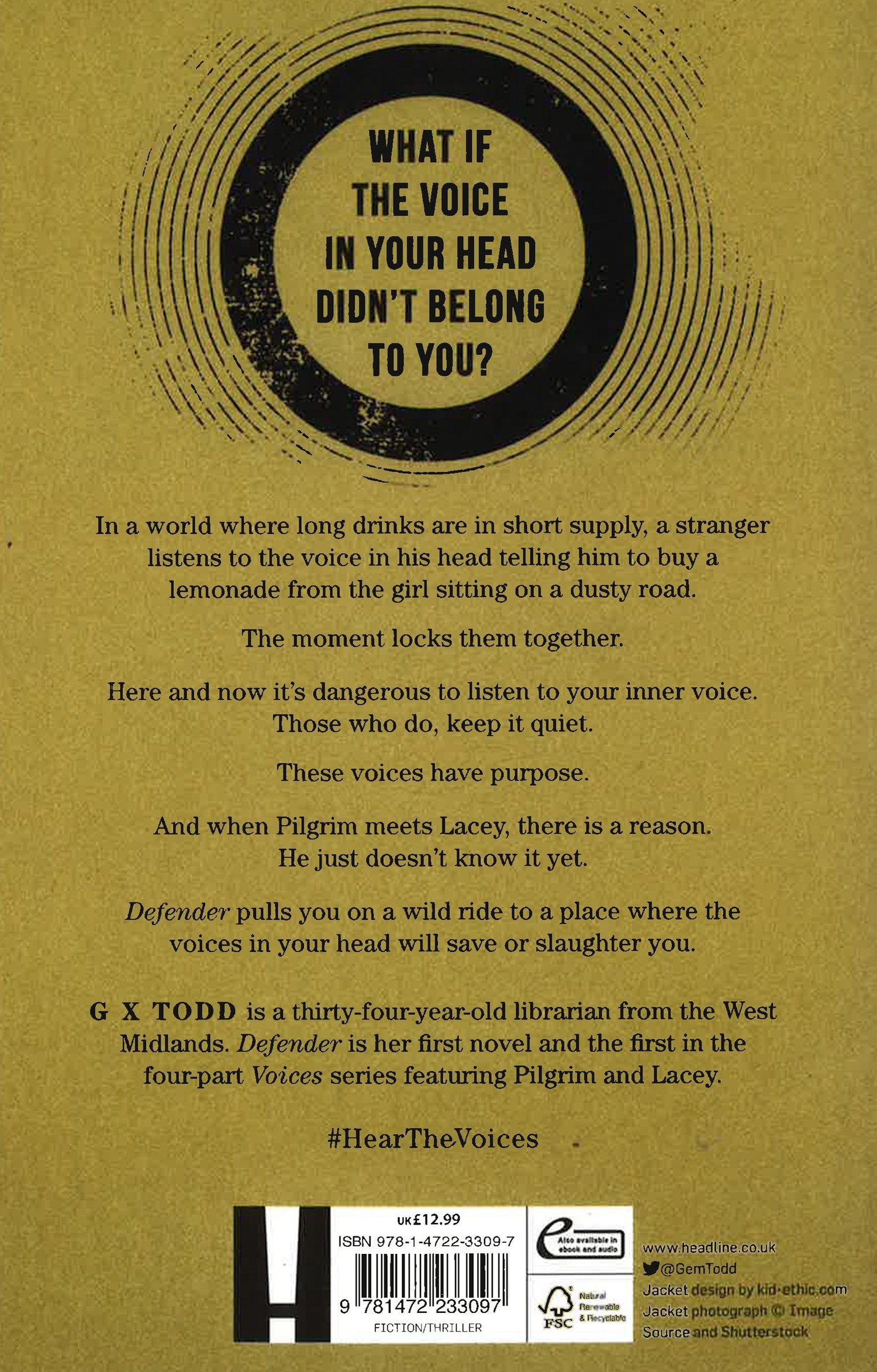 Defender by G X Todd is an imaginative thriller that draws on influences from Stephen King, Clive Barker and Neil Gaiman to create a new world - where the biggest threat mankind faces is from the voices inside your own head. If you loved The Stand, you'll love Defender, the first in a four part series. 'So accomplished that it's difficult to believe it's a first novel, Defender is already worthy to take its place alongside The Stand in the canon. An absolute gem of a book' John Connolly On the cusp of sleep, have we not all heard a voice call out our name?' In a world where long drinks are in short supply, a stranger listens to the voice in his head telling him to buy a lemonade from the girl sitting on a dusty road. The moment locks them together. Here and now it's dangerous to listen to your inner voice. Those who do, keep it quiet. These voices have purpose. And when Pilgrim meets Lacey, there is a reason. He just doesn't know it yet. Defender pulls you on a wild ride to a place where the voices in your head will save or slaughter you. #HearTheVoices