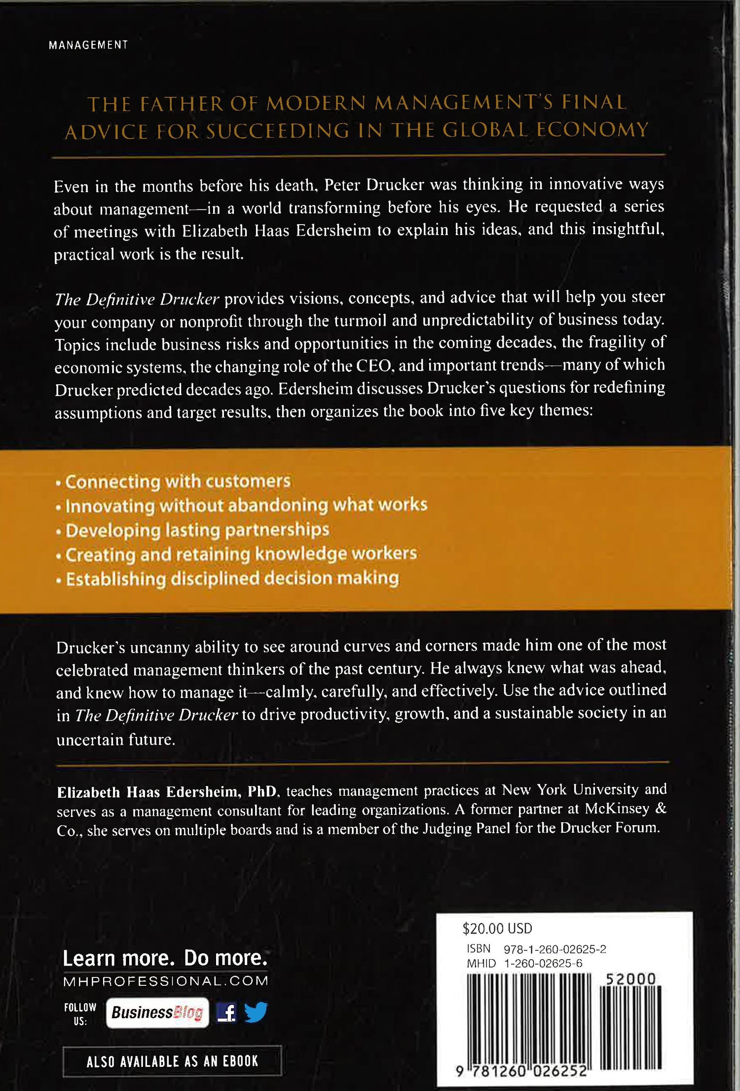 Final advice from the great Peter Drucker for driving growth and profitability in the 21st Century-with a new foreword from the author"We need a new theory of management. The assumptions built into business today are not accurate." -Peter DruckerBased on multipleseveral interviews and working sessions with Peter Drucker during the last year of his life, The Definitive Drucker reveals the management luminary's most important concepts and applies them real-life business risks and opportunities.The book sheds light on the most pressing management issues, such as the role of the CEO, why so many leaders fail, and the fragility and interdependencies of our economic and social systems, and the role of the CEO, and it imparts Drucker's views on current business practices, technological, economic, and social changes, and trends-many of which Drucker predicted decades ago. A celebration of this extraordinary man's life and work, The Definitive Drucker offers a unique opportunity to use Drucker's final business lessons to strategize, create, compete, and succeed in any market.