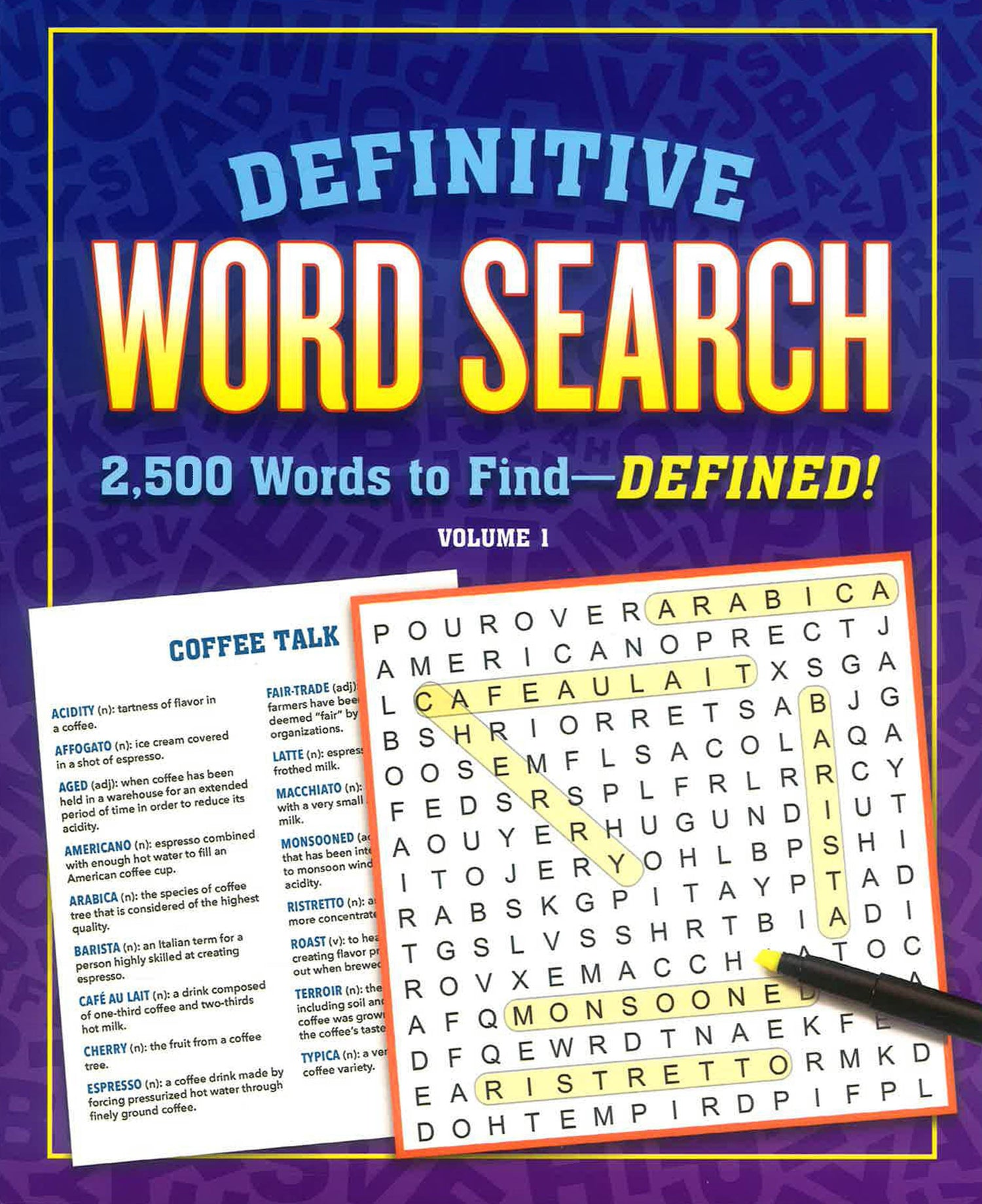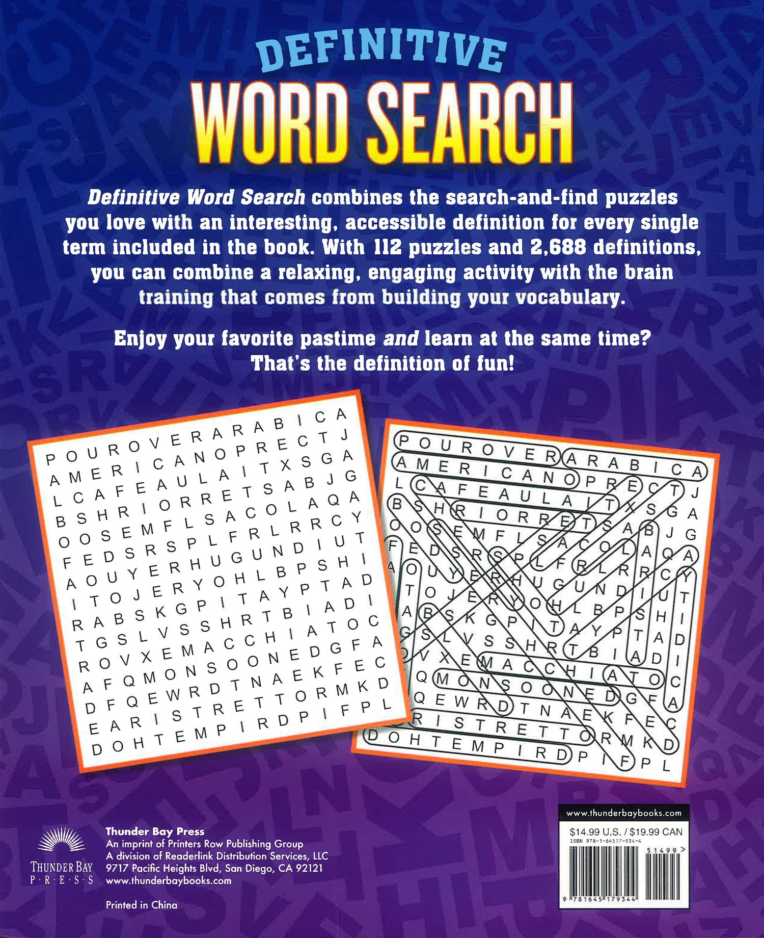 Have you ever completed a word search puzzle and been left wondering what all those obscure words mean? No more scratching your head over words that you’ll never encounter again! Definitive Word Search, Volume 1 takes word searches to a new level by including the definitions alongside each clue, so you’ll expand your vocabulary every time you complete a puzzle. Word searches are a great way to boost your brainpower, and the inclusion of more than 2,500 definitions will give your cranium an extra kick. Whether you’re in need of something to help you relax or are looking for a fun activity to do with a partner, this puzzle book will give you the mental boost you’re looking for.