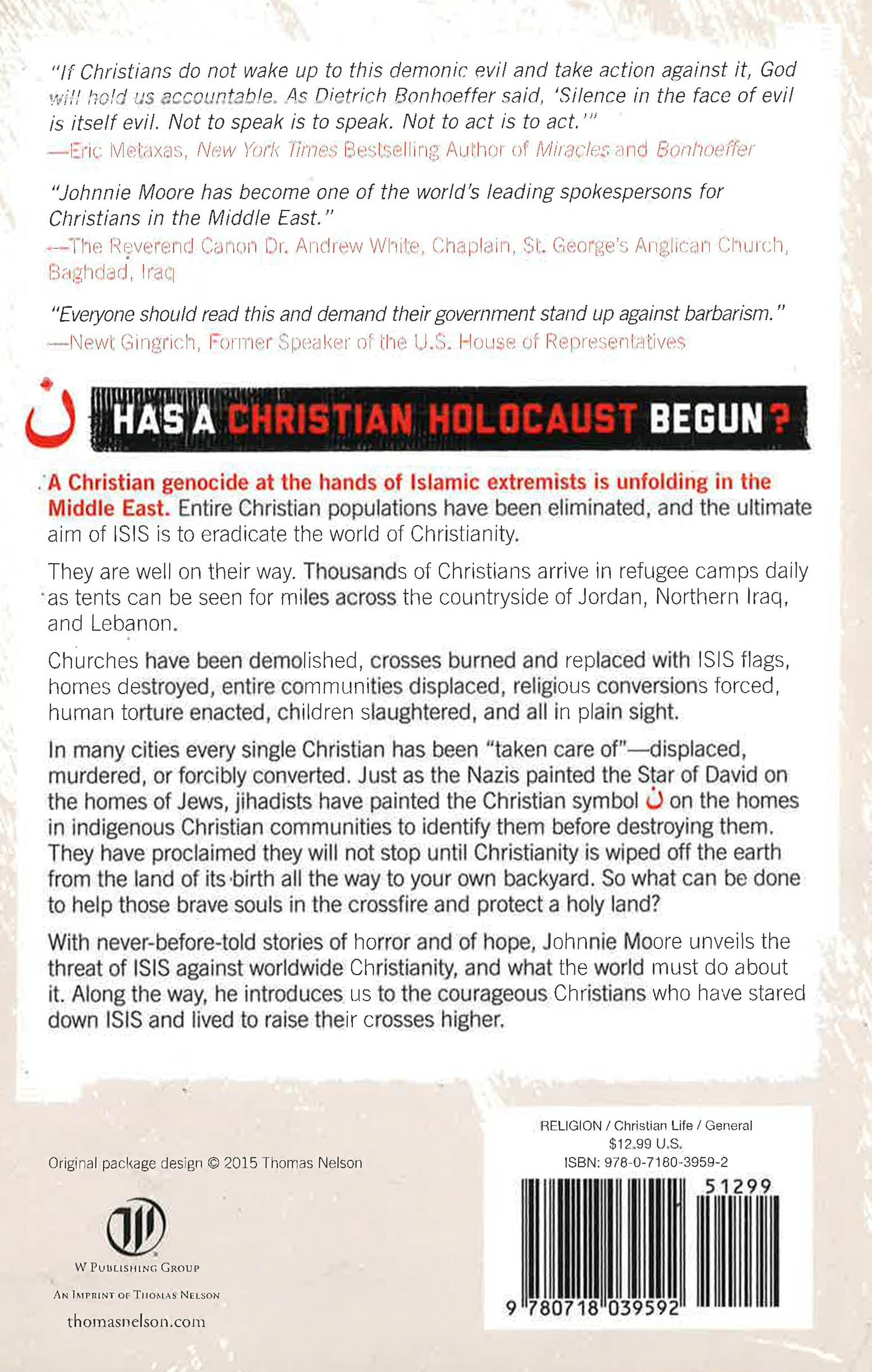 With never before told stories of horror and of hope, Johnnie Moore unveils the threat of ISIS against worldwide Christianity, and what the world must do about it. Along the way, he introduces us to the courageous Christians who have stared down ISIS and lived to raise their crosses higher.