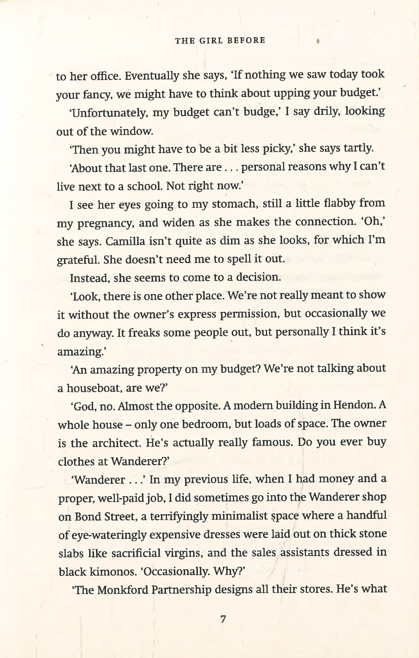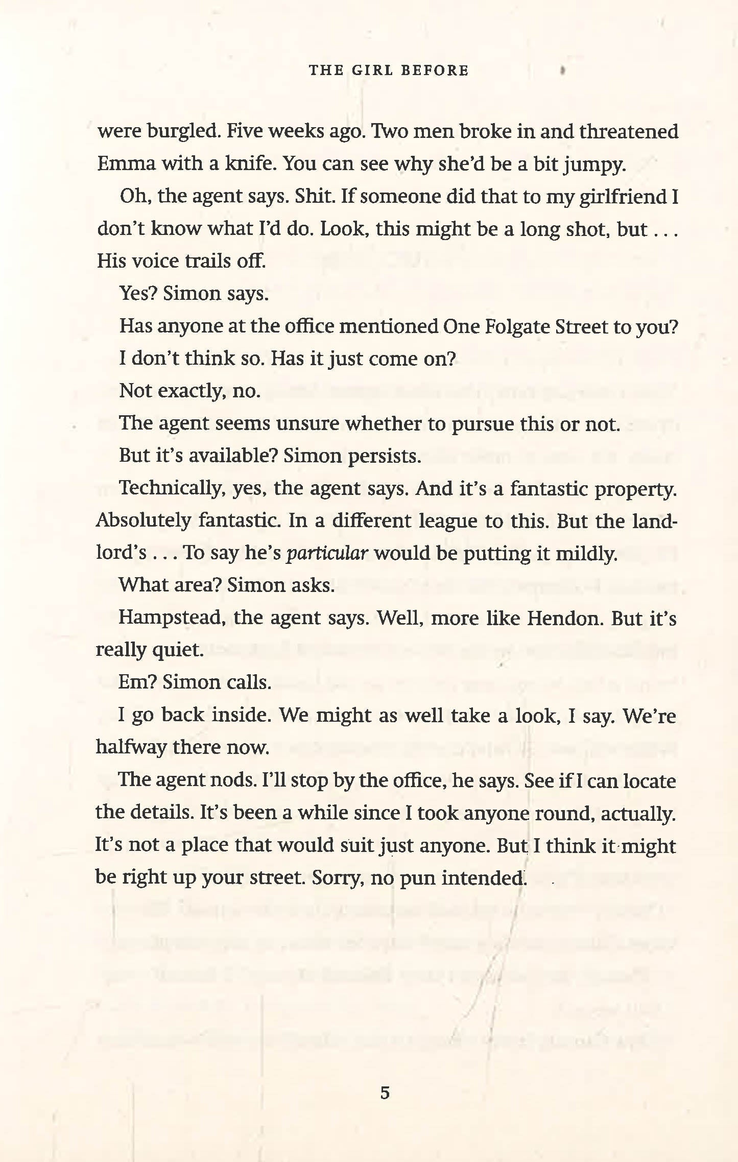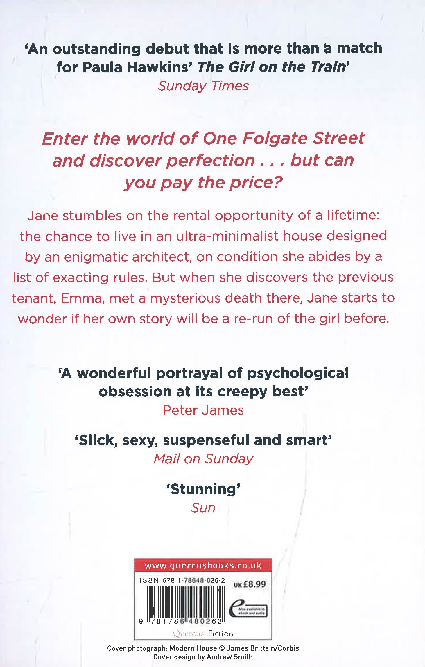 After moving in, she makes a shocking discovery about the previous tenant, Emma, and Jane starts to wonder if her own story will be a rerun of the girl before.