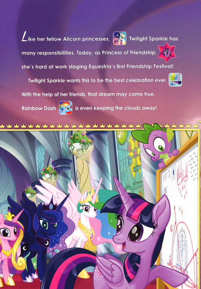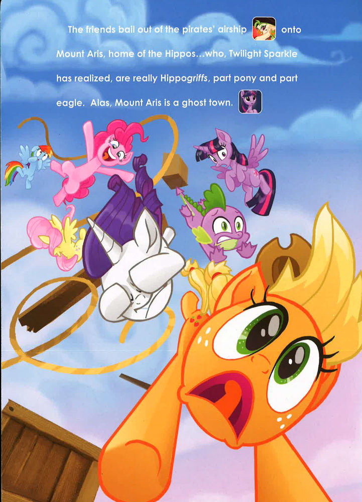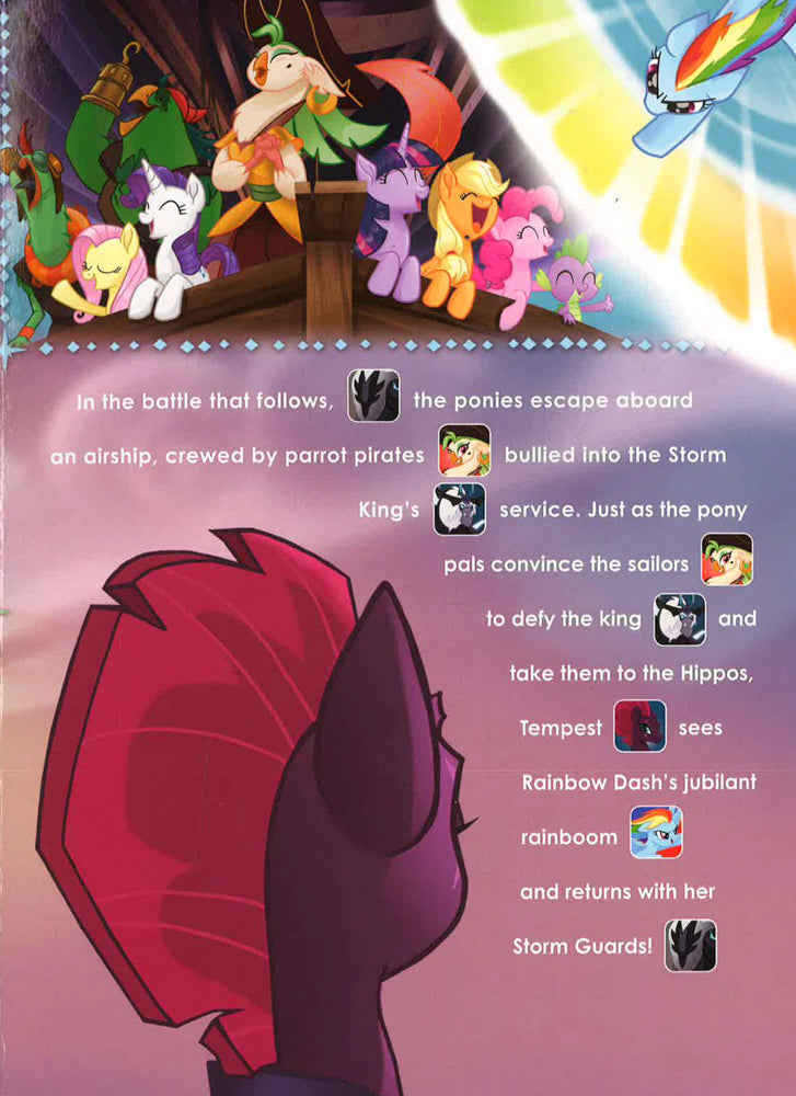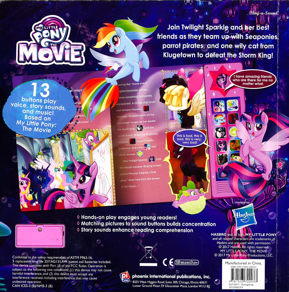 Come along for the adventure when Twilight Sparkle and her best friends team up with Seaponies, parrot pirates, and one wily cat to defeat the Storm King! 13 buttons make the story come alive with character voice phrases, exciting sounds, and music! This sound book is special because: Hands on interaction engages young readers Connecting words with pictures builds vocabulary Multisensory reading experiences stimulate the imaginations of young readers Includes awesome My Little Pony characters: Twilight Sparkle, Pinkie Pie, Fluttershy, Rarity, Rainbow Dash, and more!